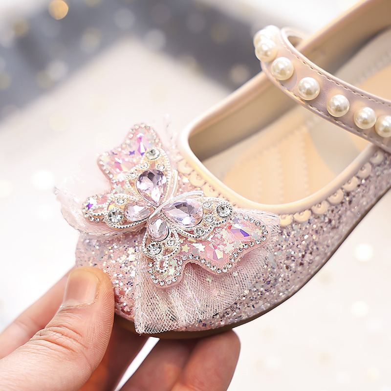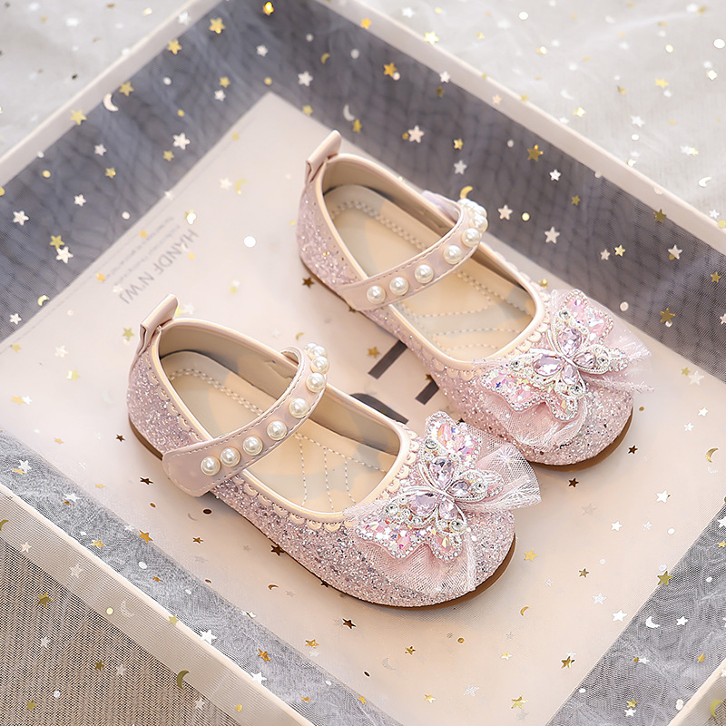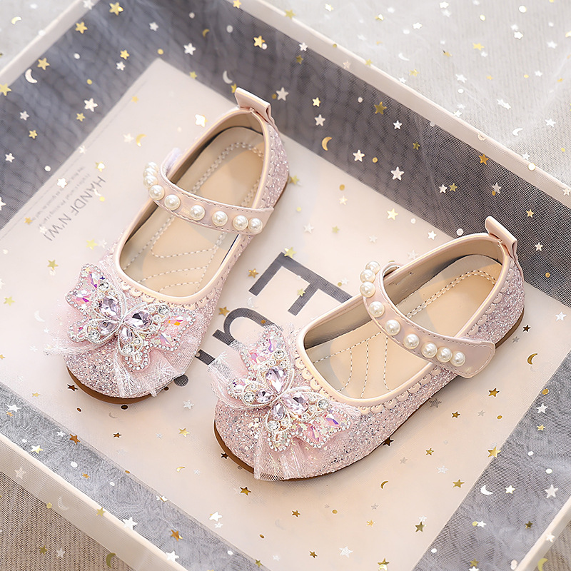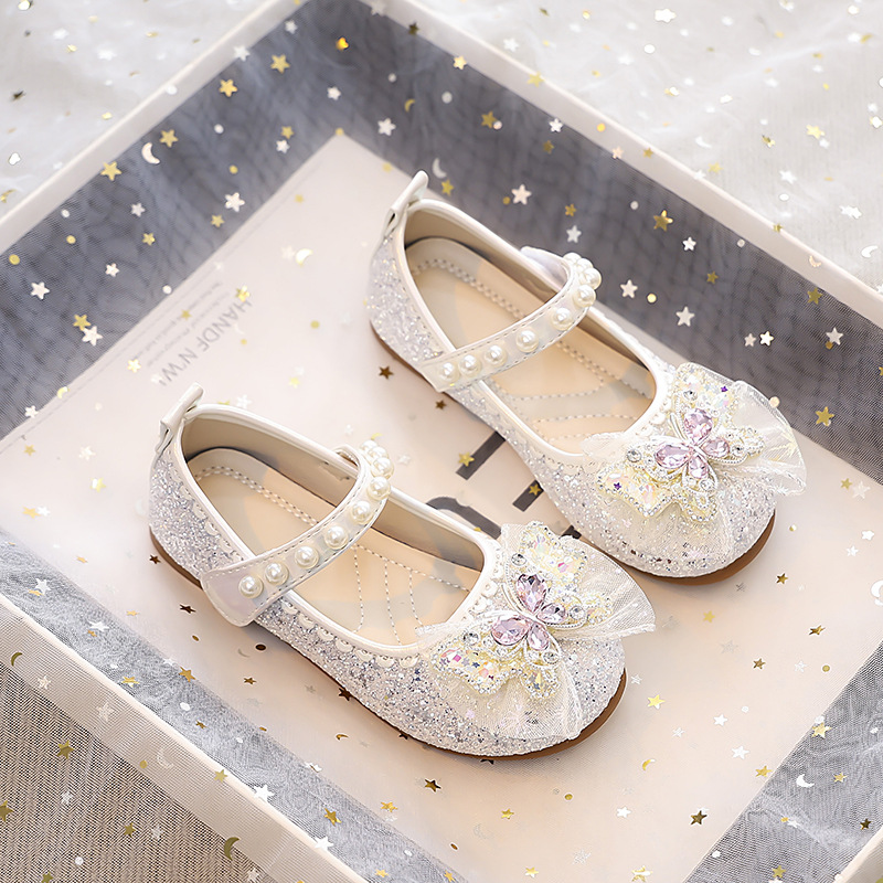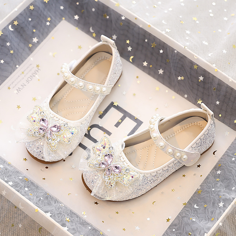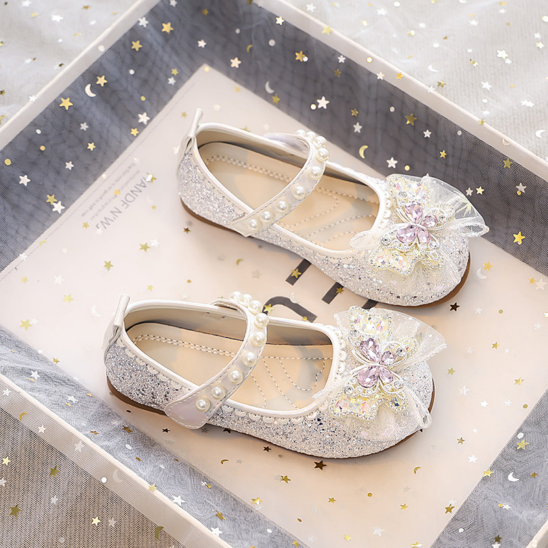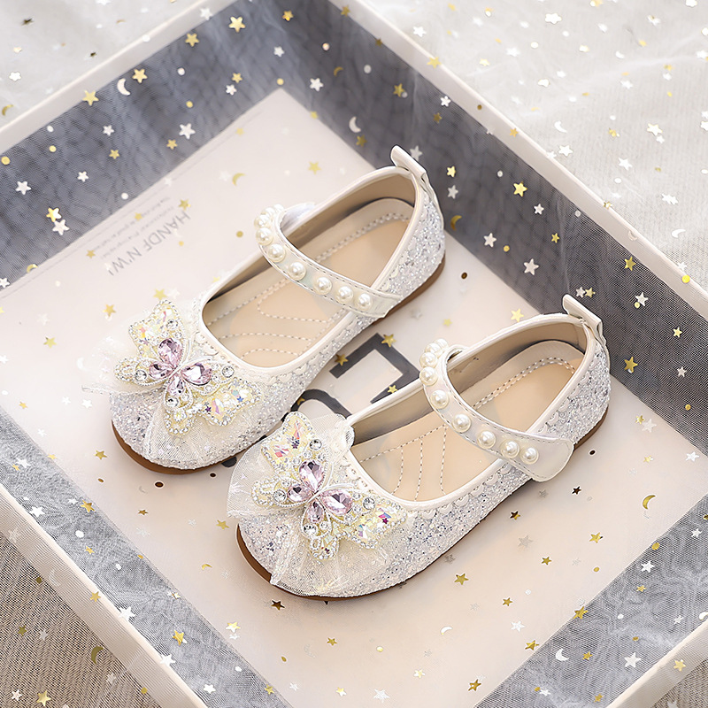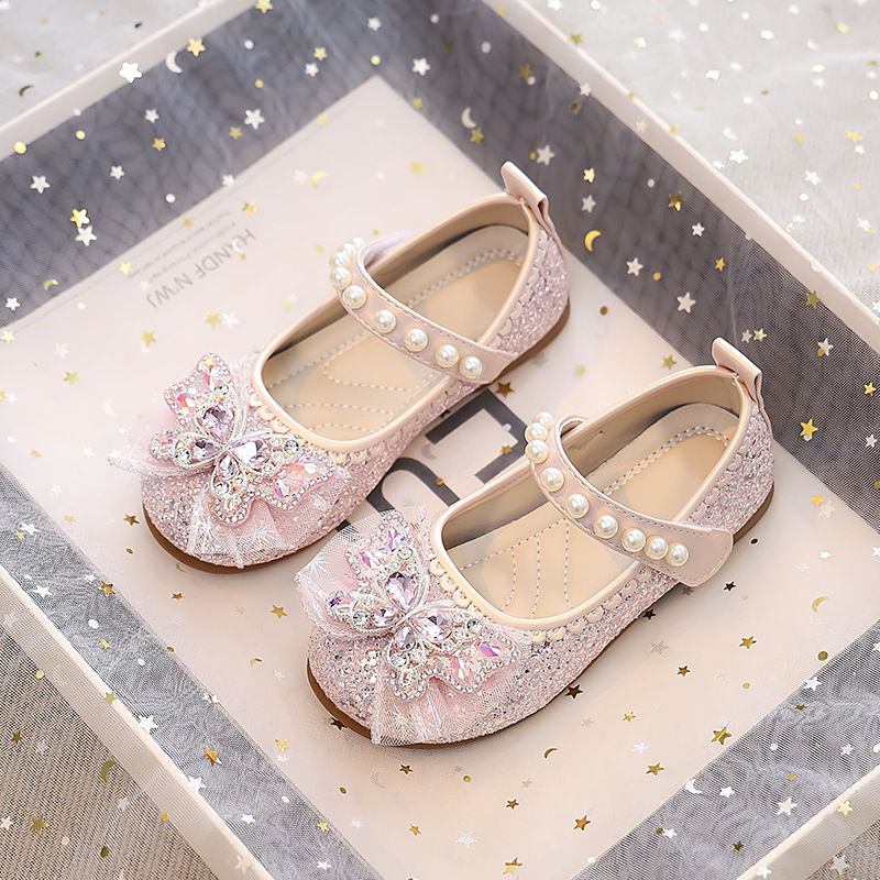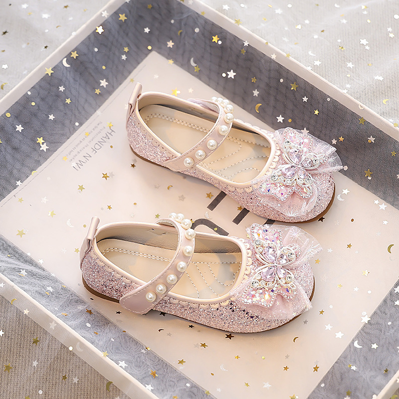 Туфли для девочек Детская принцесса одиночные туфли 2025 новый летний блестящий маленькая девочка мягкая подошва с платьем хрустальные кожаные туфли