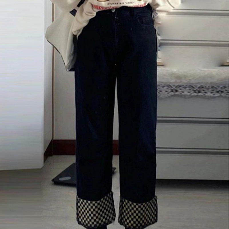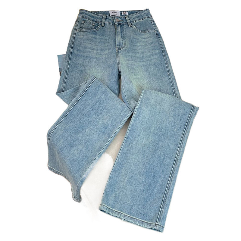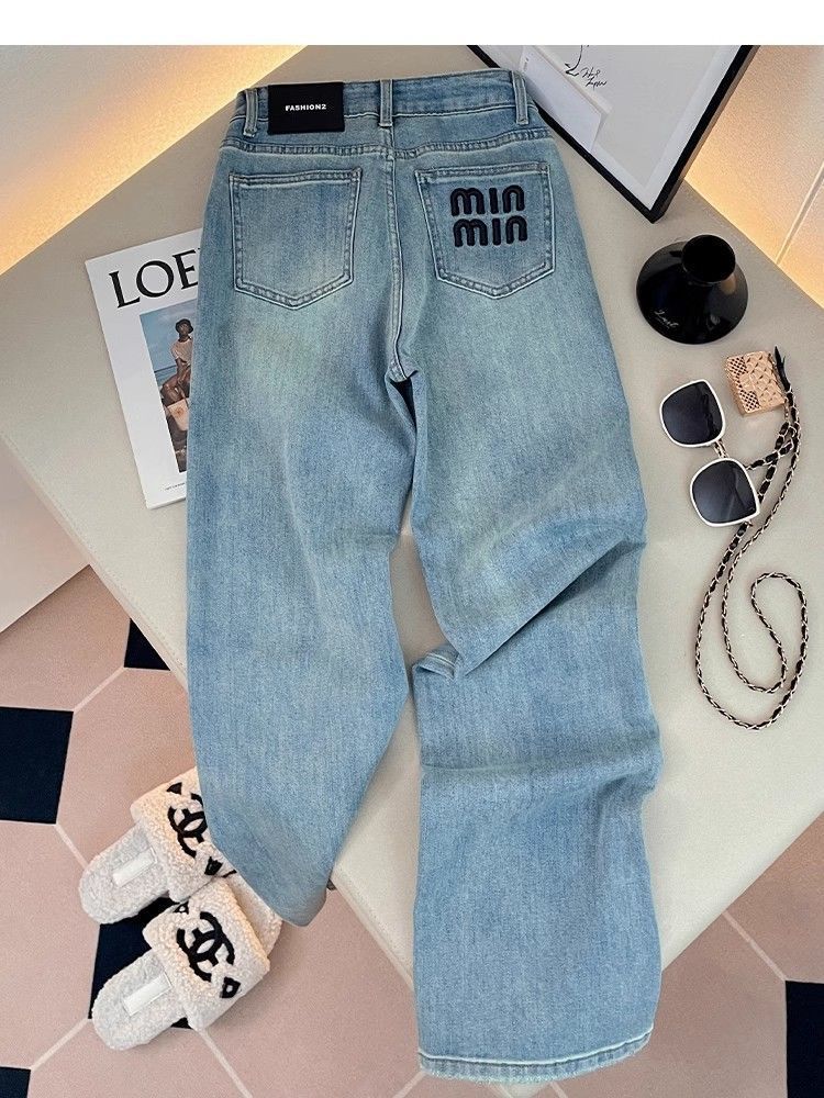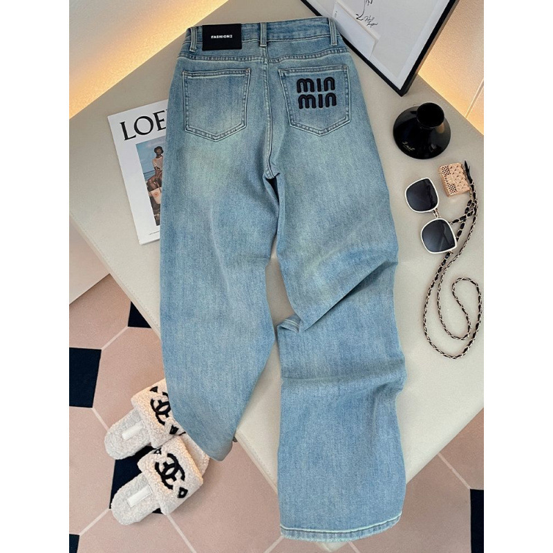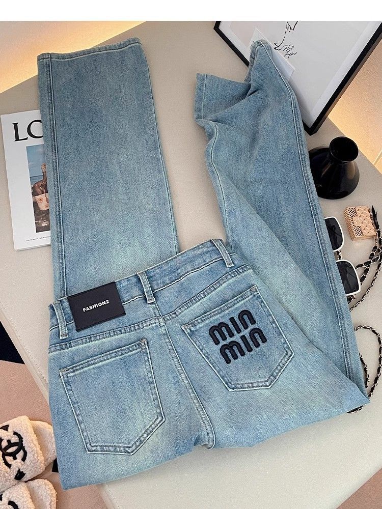 Вышитые буквы узкая версия эластичные джинсы женская весна 2025 новая высокая талия тонкая свободная светлая прямая брюки