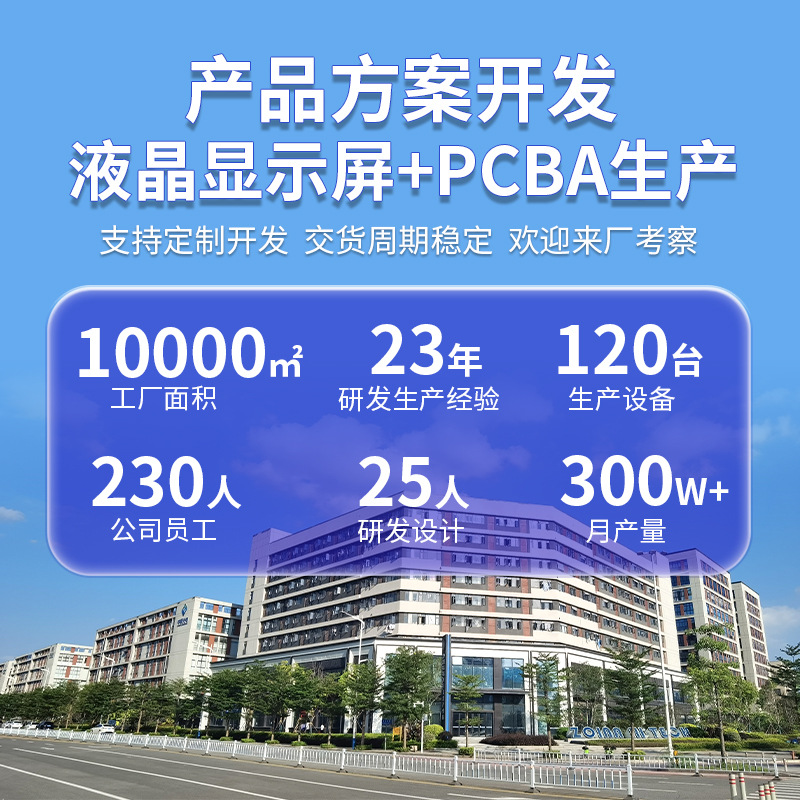 公司历经二十多年发展,组建了一支强大的研发团队:包含硬件、软件、显示、外观结构设计等十多名经验丰富工程师,并配备自动化生产线:显示屏2条,背光5条,模组4条。厂房面积近1万平方米,月产能可达到LCD液晶3万对以上,背光200万片以上,模组产品50万套以上。