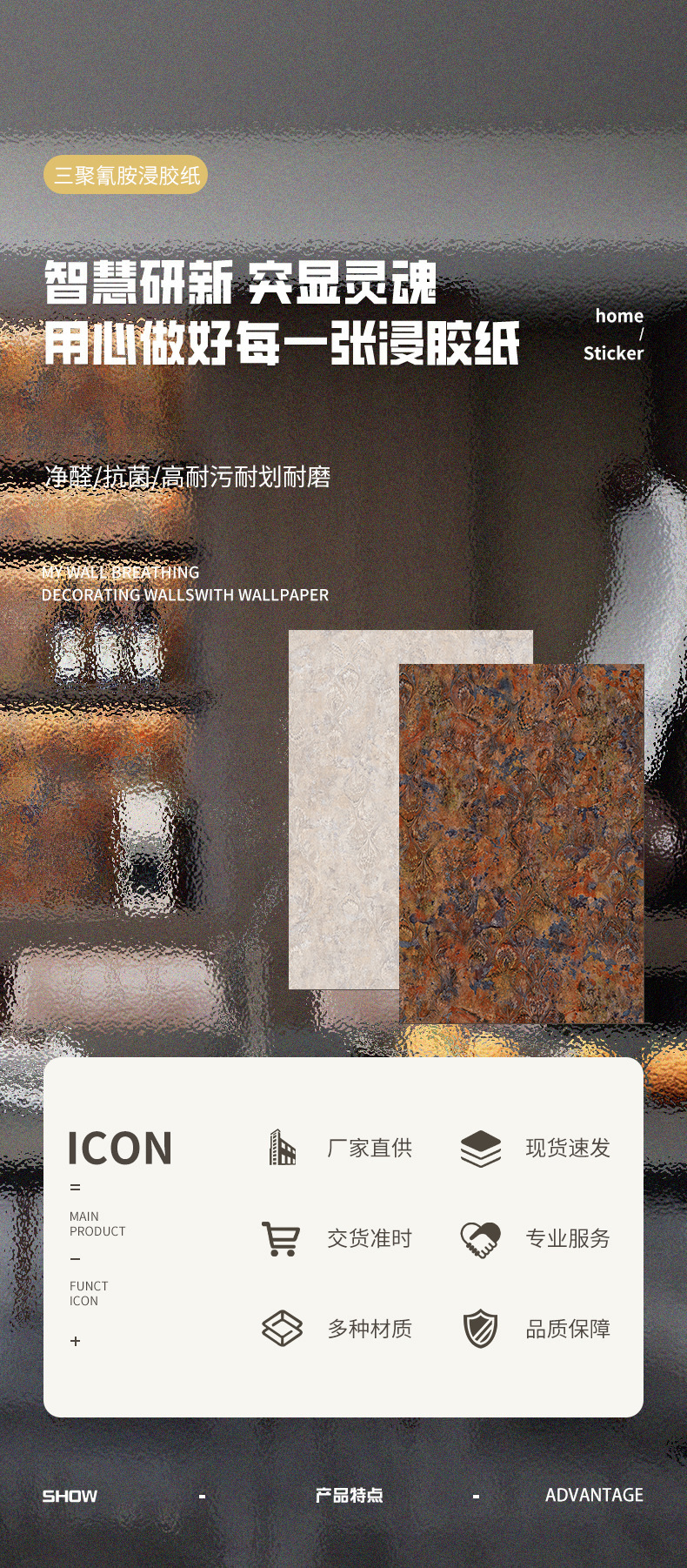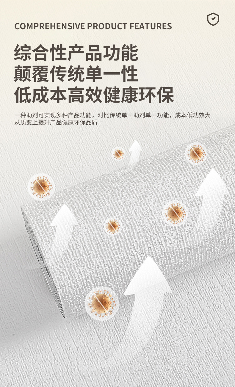 Доступен в широком ассортименте цветов, легко поддается формовке, имеет тонкую текстуру и стабильное качество. Многофункциональный: антибактериальный и противогрибковый, устраняет запахи, влагостойкий и устойчивый к насекомым, с низким содержанием формальдегида и экологически безопасный, устойчивый к пятнам и износу.