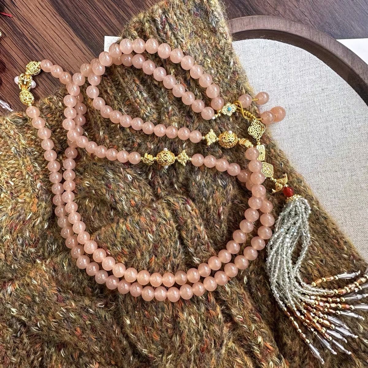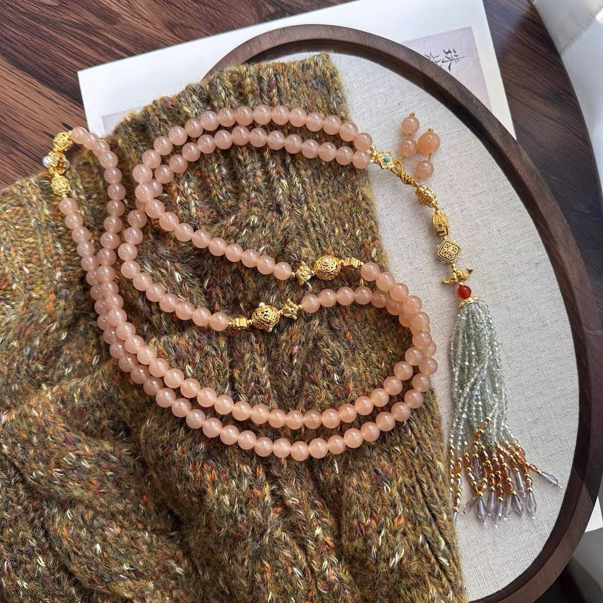 Новое длинное ожерелье через плечо в стиле чиноiserie, ожерелье из розового кварца в этническом стиле, универсальная цепочка для свитера, длинное ожерелье с несколькими кругами
