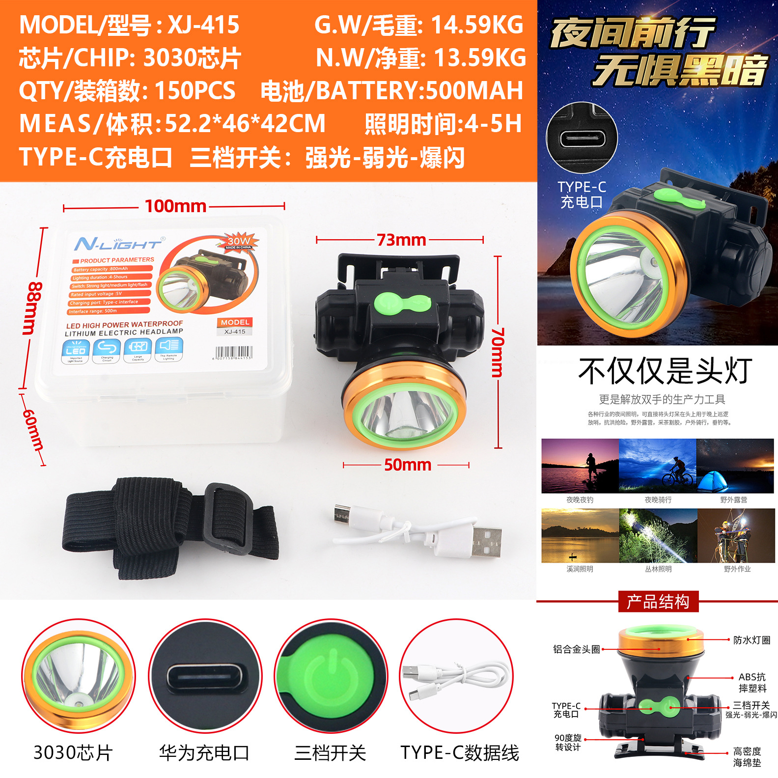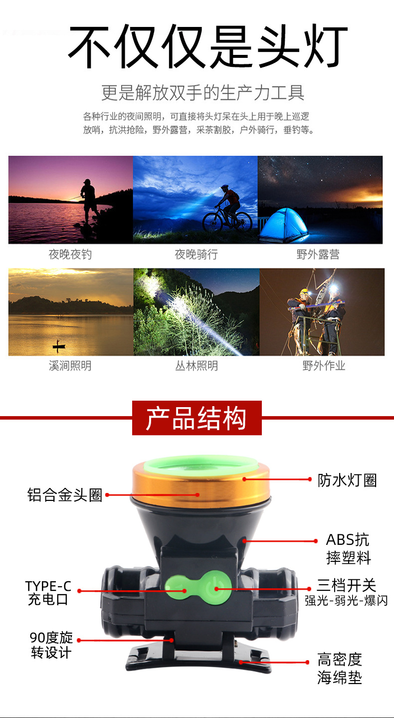 Налобный фонарь с мощным светом, перезаряжаемый, яркий, с долговечным литиевым аккумулятором, портативный налобный фонарь для ночной рыбалки и горных работ.
