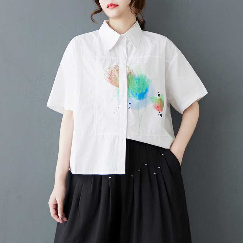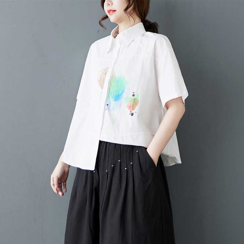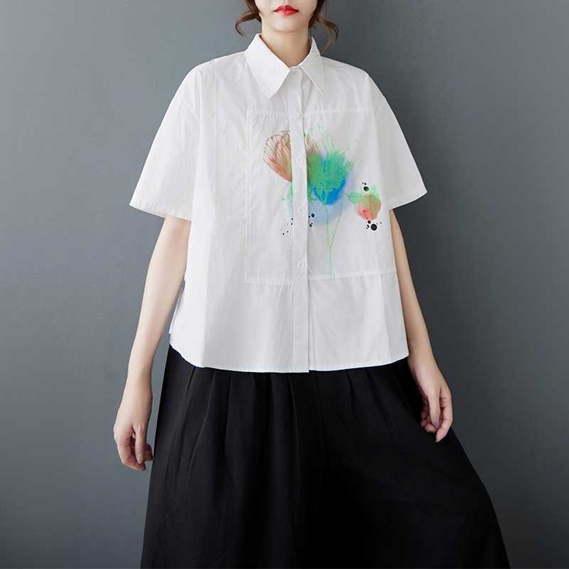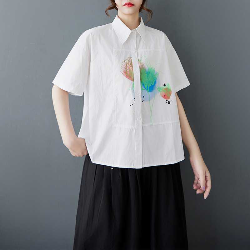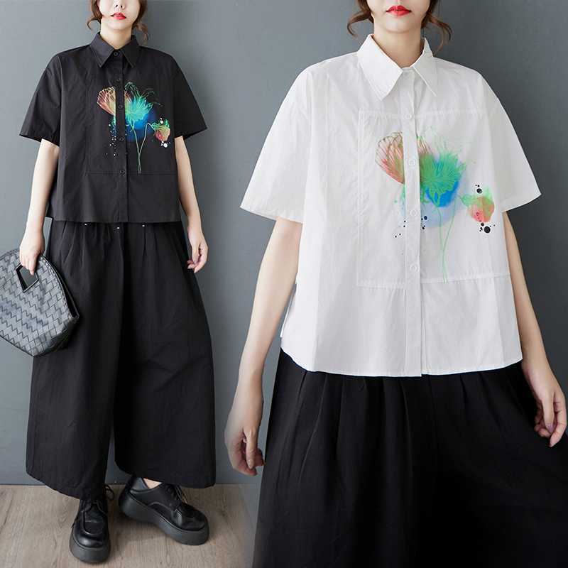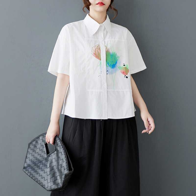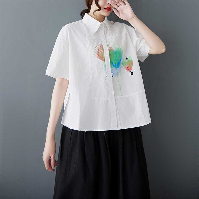 Новая летняя рубашка 2025 года в ретро стиле с принтом, короткий рукав, комбинированная, простая, стройнящая, для полных женщин, топ