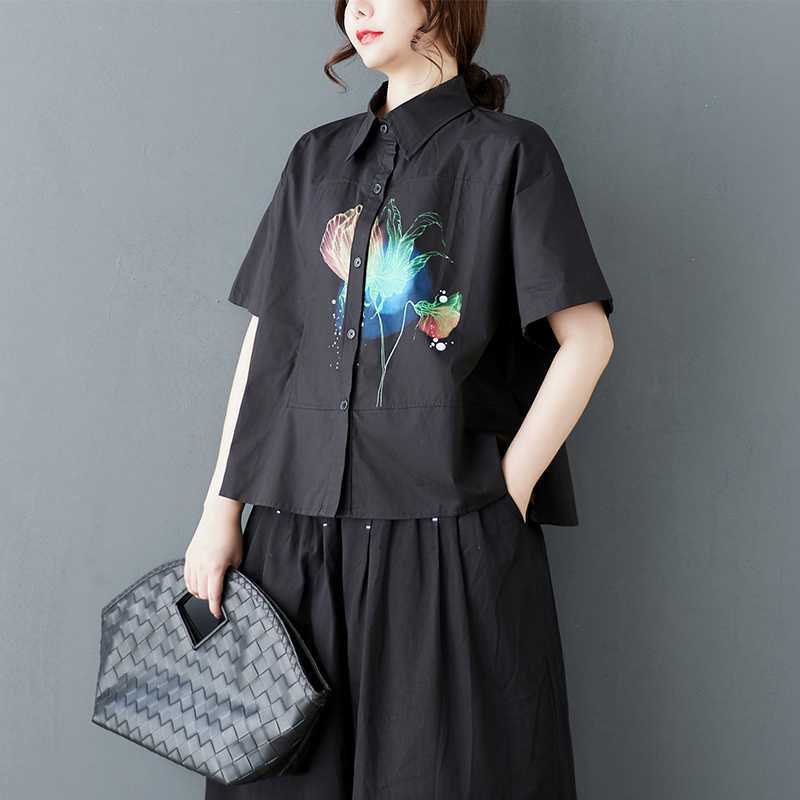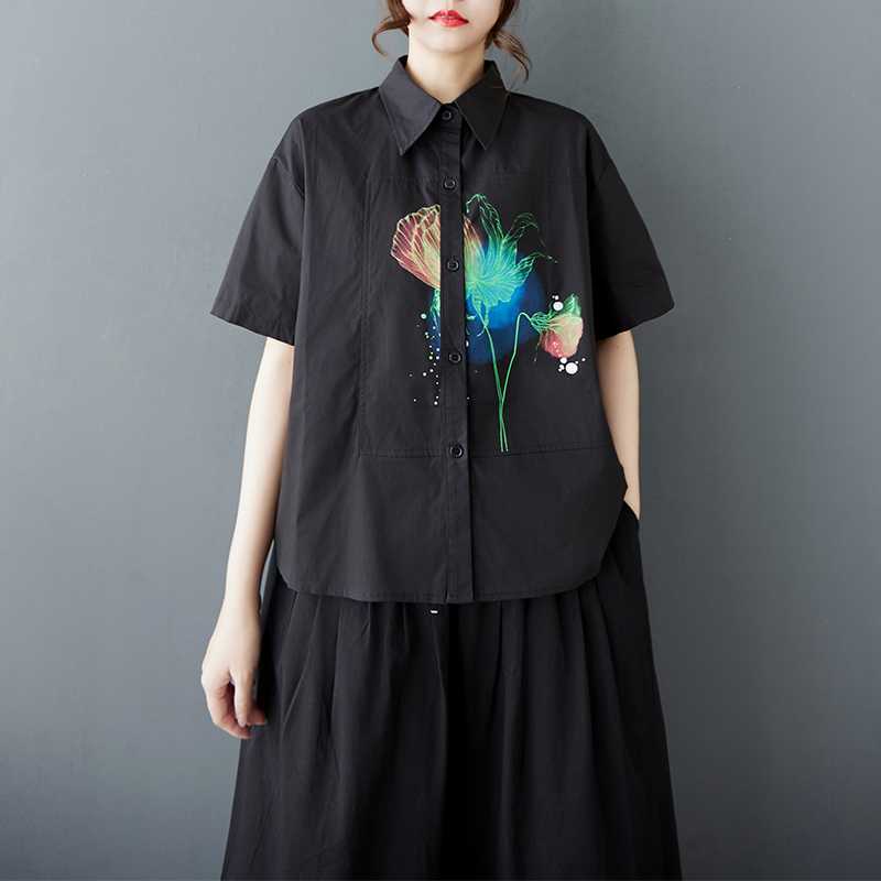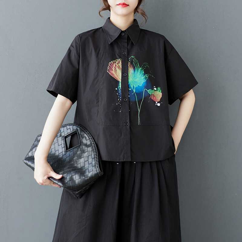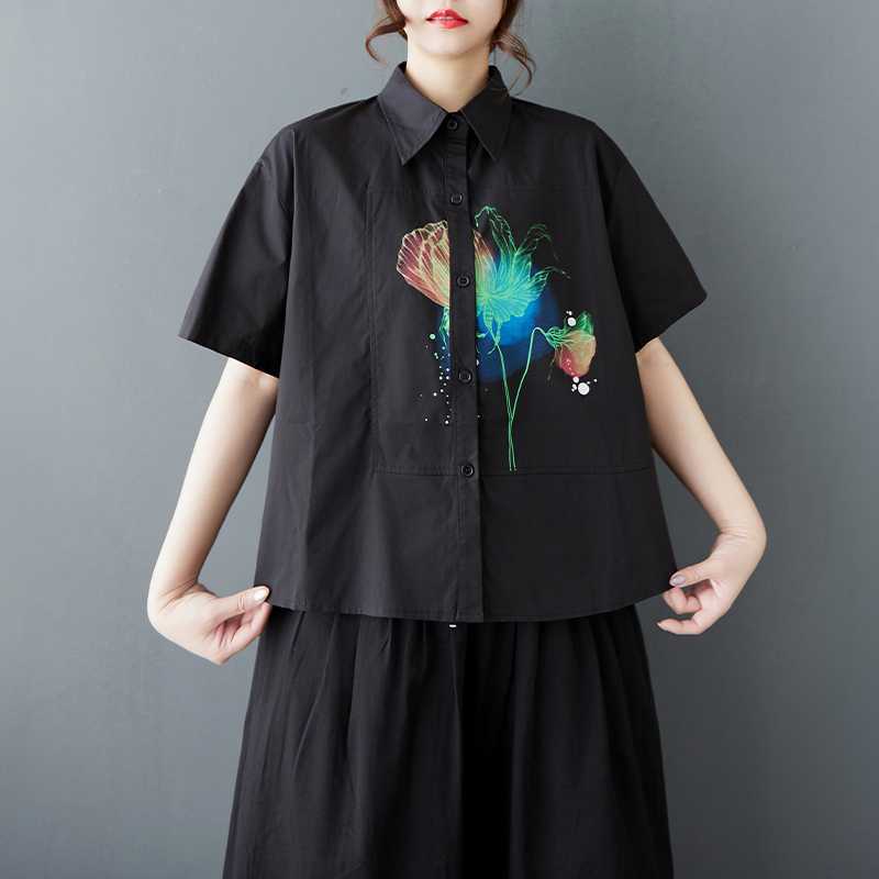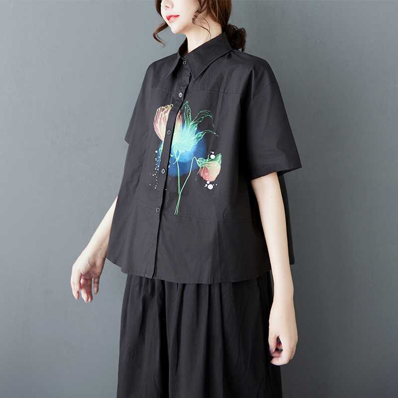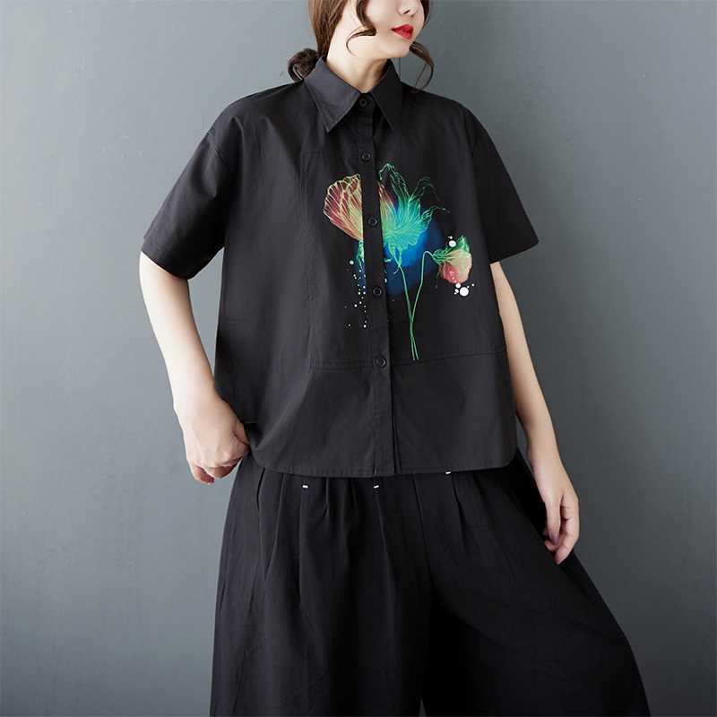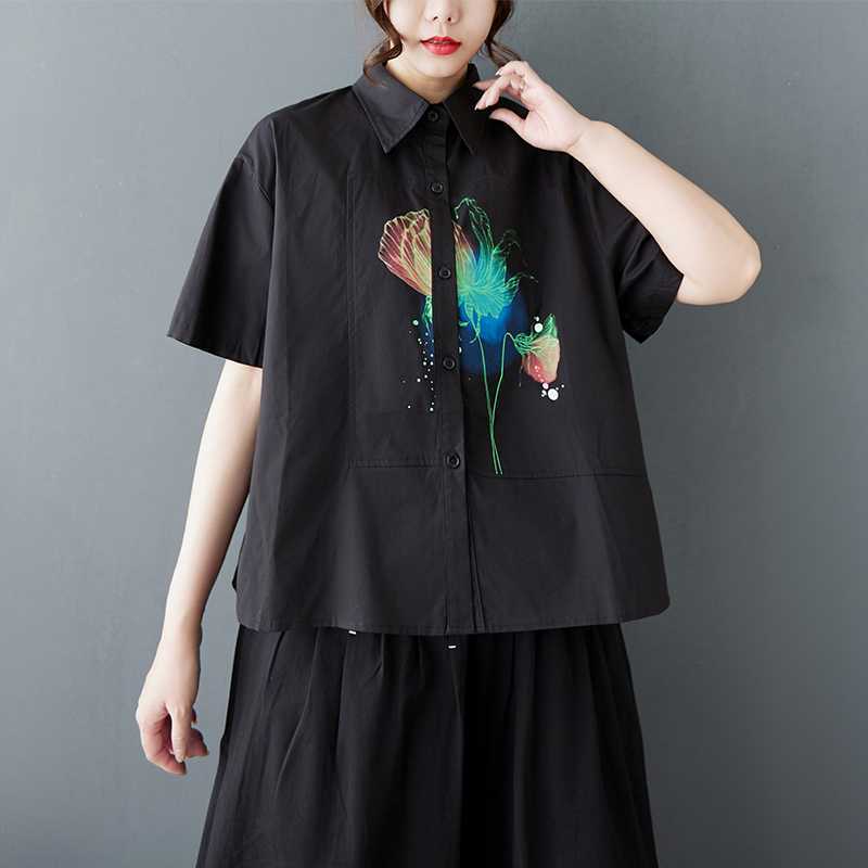 Новая летняя рубашка 2025 года в ретро стиле с принтом, короткий рукав, комбинированная, простая, стройнящая, для полных женщин, топ