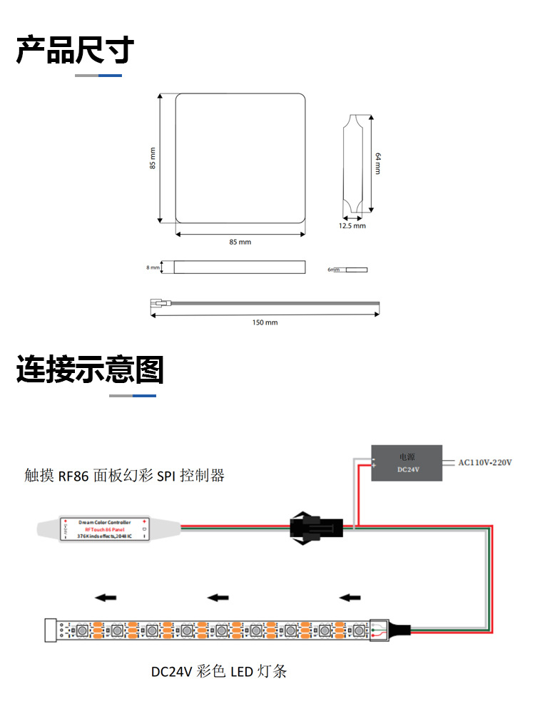 Пульт дистанционного управления: 85*85*8 мм; Контроллер: 64*12,5*6 мм
