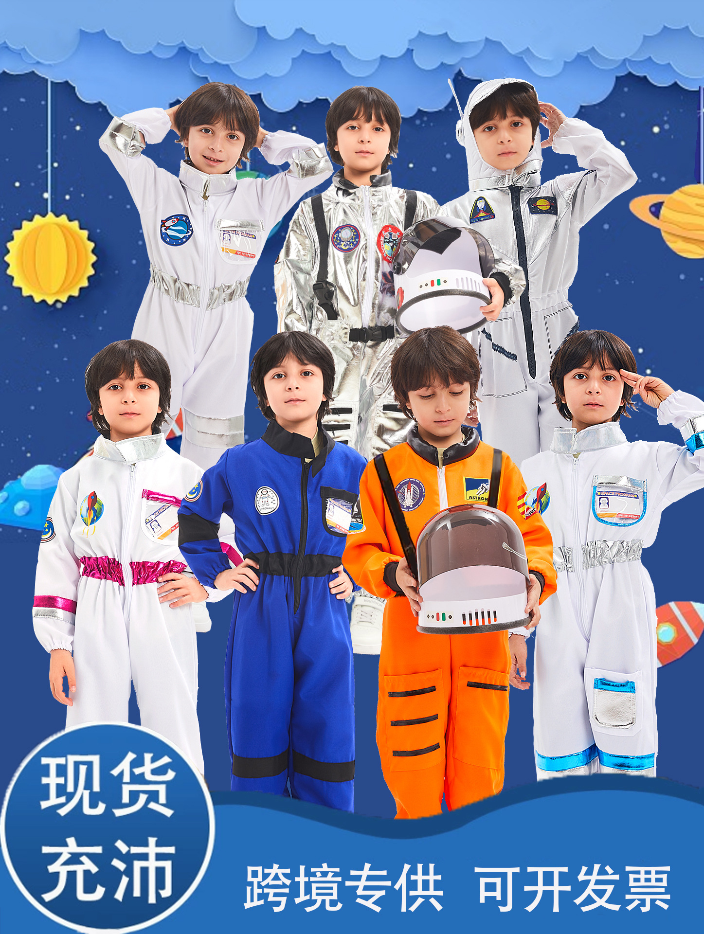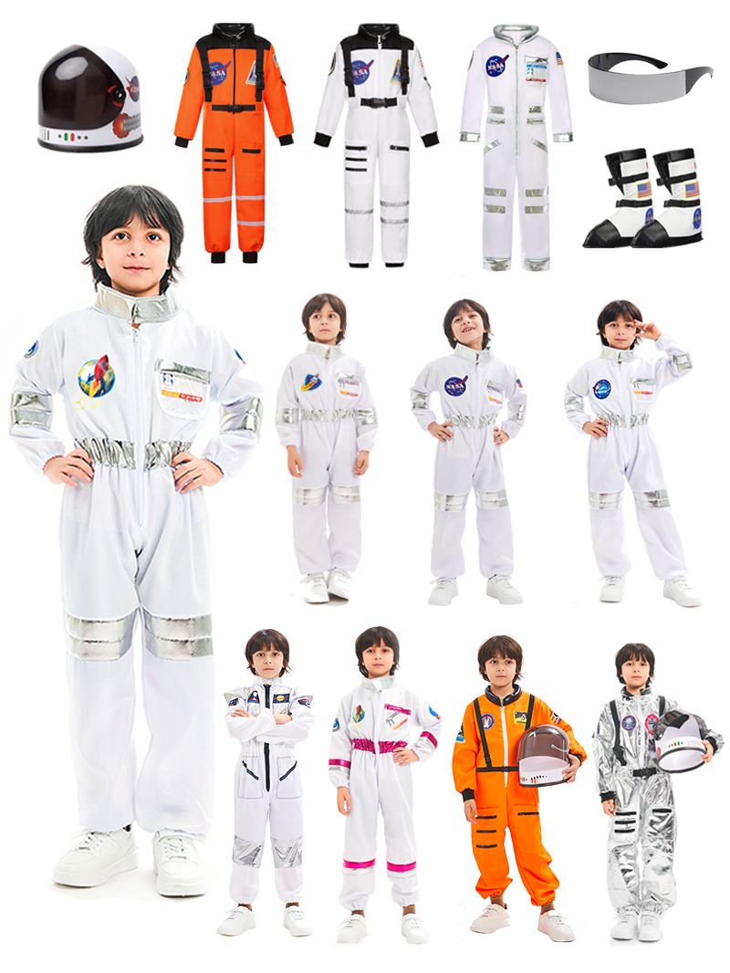 Космический костюм с круглым принтом (комплект из четырех предметов типа А); Космический костюм с треугольным принтом (комплект из четырех предметов типа B); Космический костюм с вышивкой НАСА (комплект из четырех предметов в стиле C); Космический костюм с вышивкой планеты (комплект из четырех предметов в стиле D); Космический костюм розово-красного цвета (комплект из четырех предметов в стиле E); Небесно-голубой космический костюм (комплект из четырех предметов в стиле F); Синий космический костюм (комплект из четырех предметов в стиле G); Детский космический костюм серебристого цвета; космический костюм из проволоки; Космический костюм с розовым треугольным принтом (комплект из четырех предметов типа B)