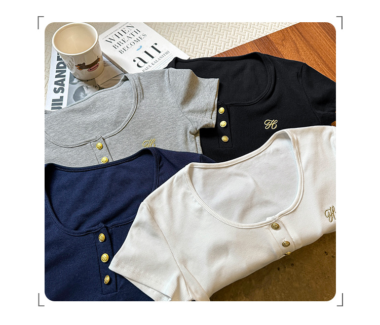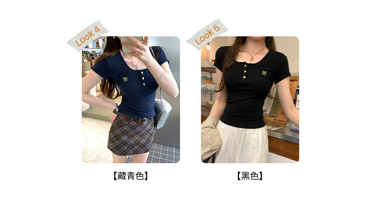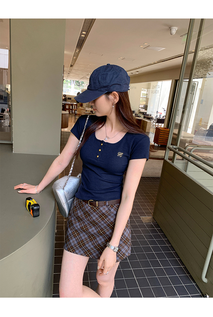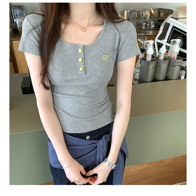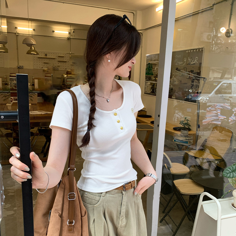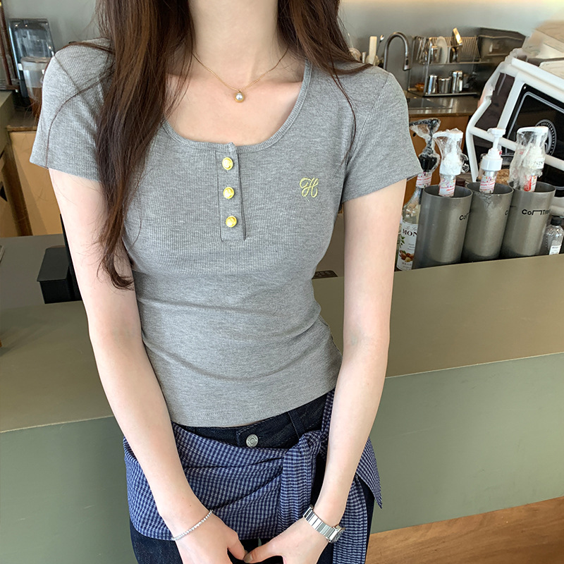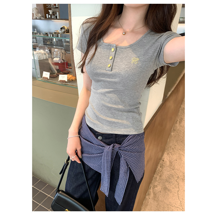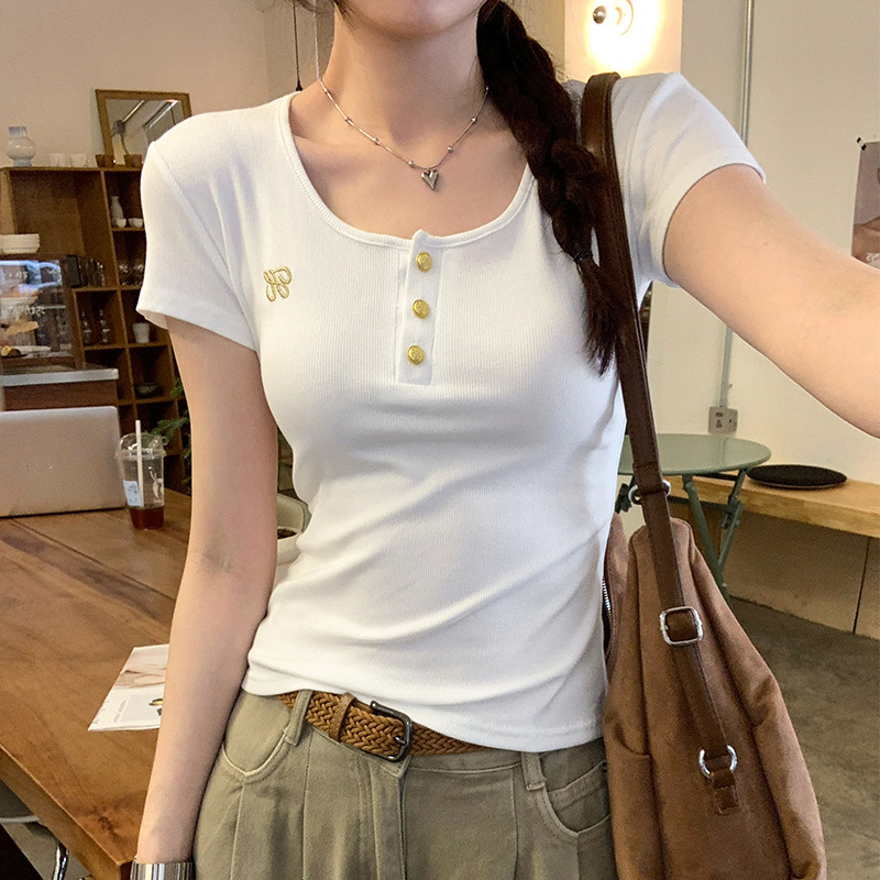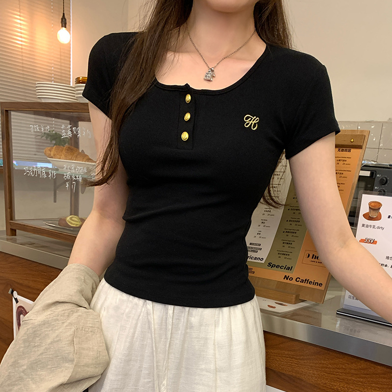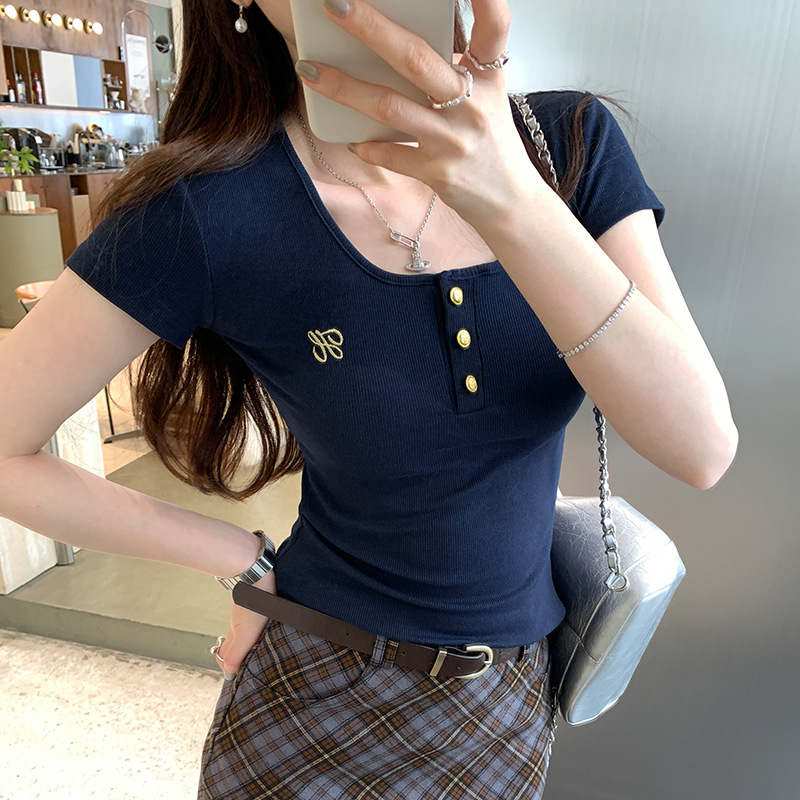 Женская футболка с коротким рукавом и вышивкой, темно-синяя, летняя новинка 2026 года, американский стиль, облегающий топ с круглым вырезом в стиле «Pure Desire Spicy Girl».