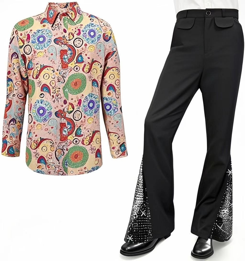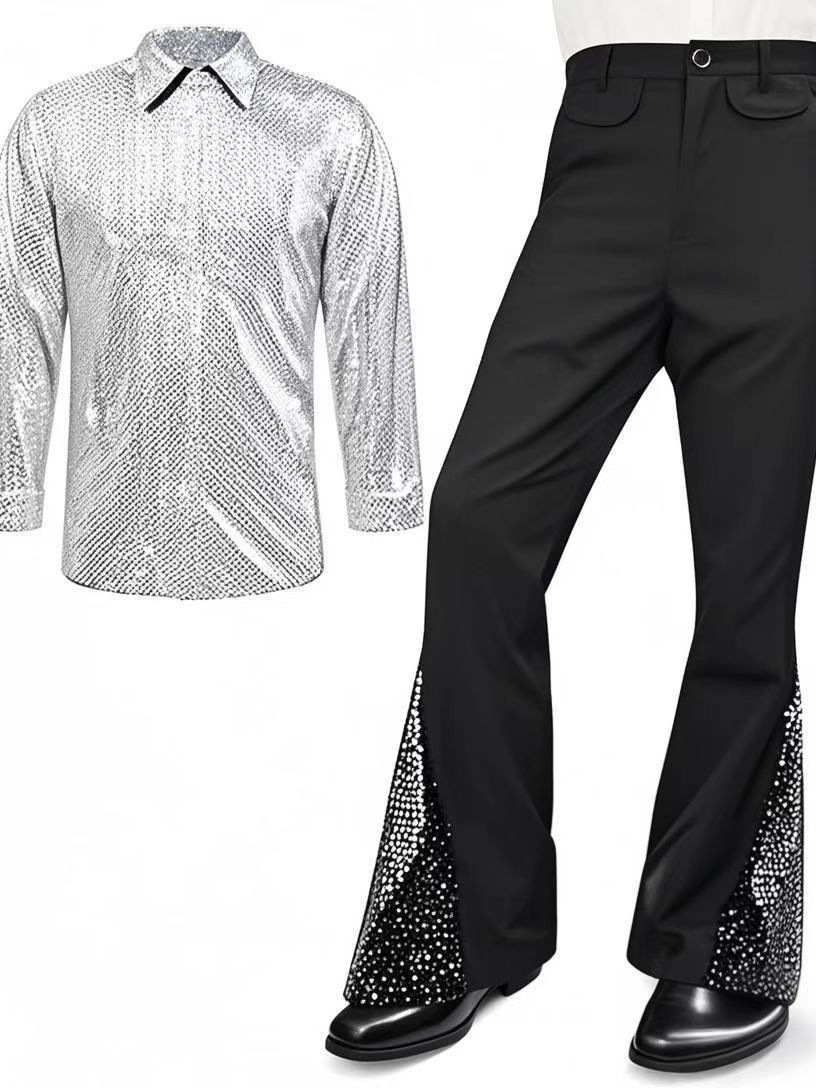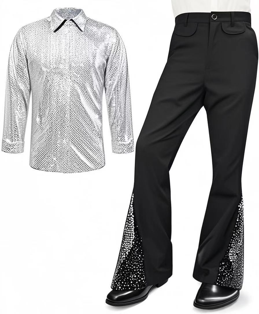 2025 Amazon Мужской костюм для дискотеки 70-х годов с блестками, расклешенные брюки, брюки, бронзовая рубашка с блестками