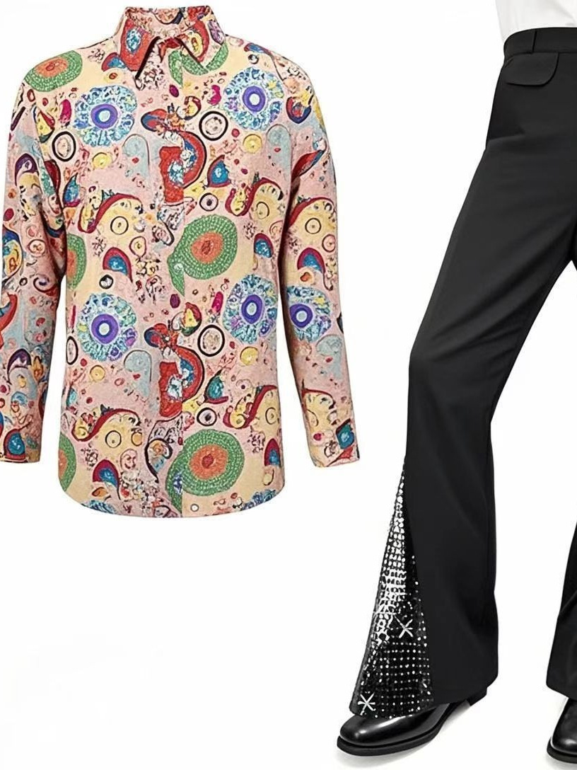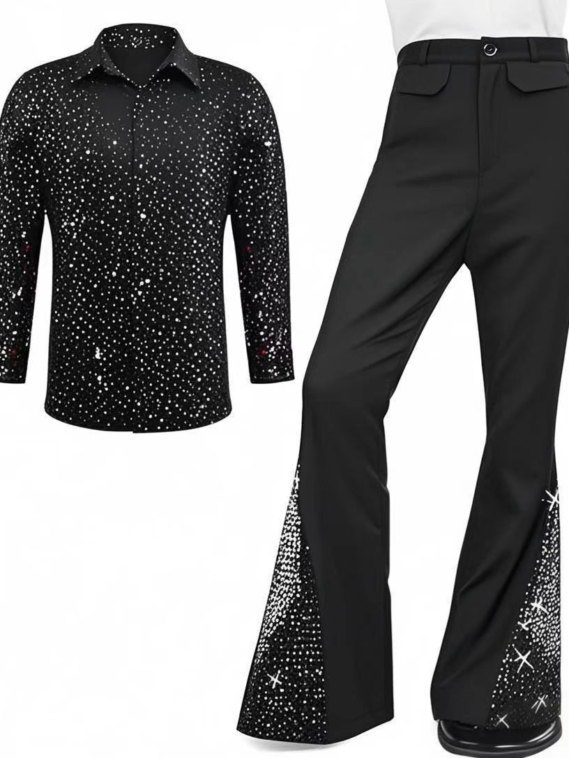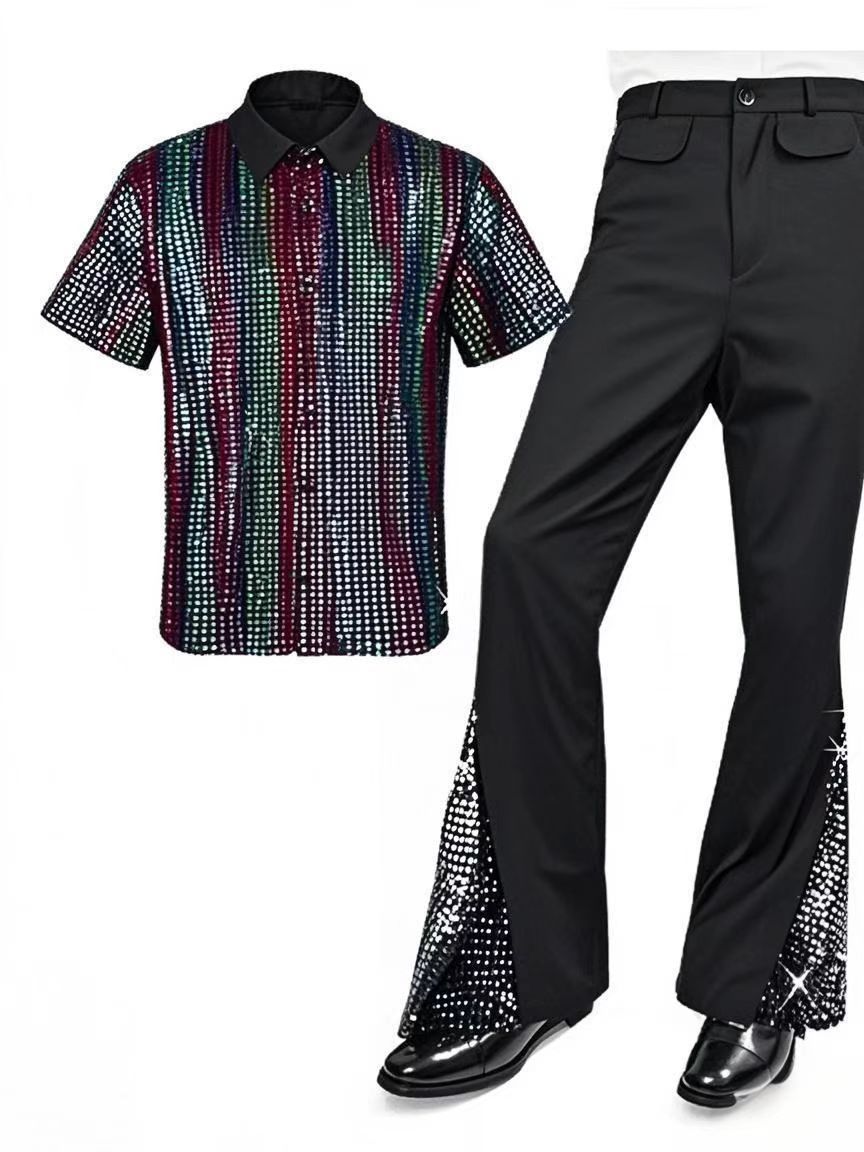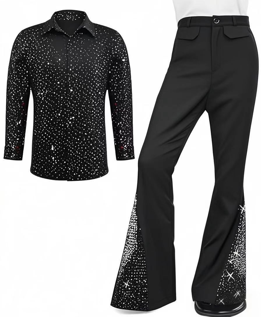 2025 Amazon Мужской костюм для дискотеки 70-х годов с блестками, расклешенные брюки, брюки, бронзовая рубашка с блестками