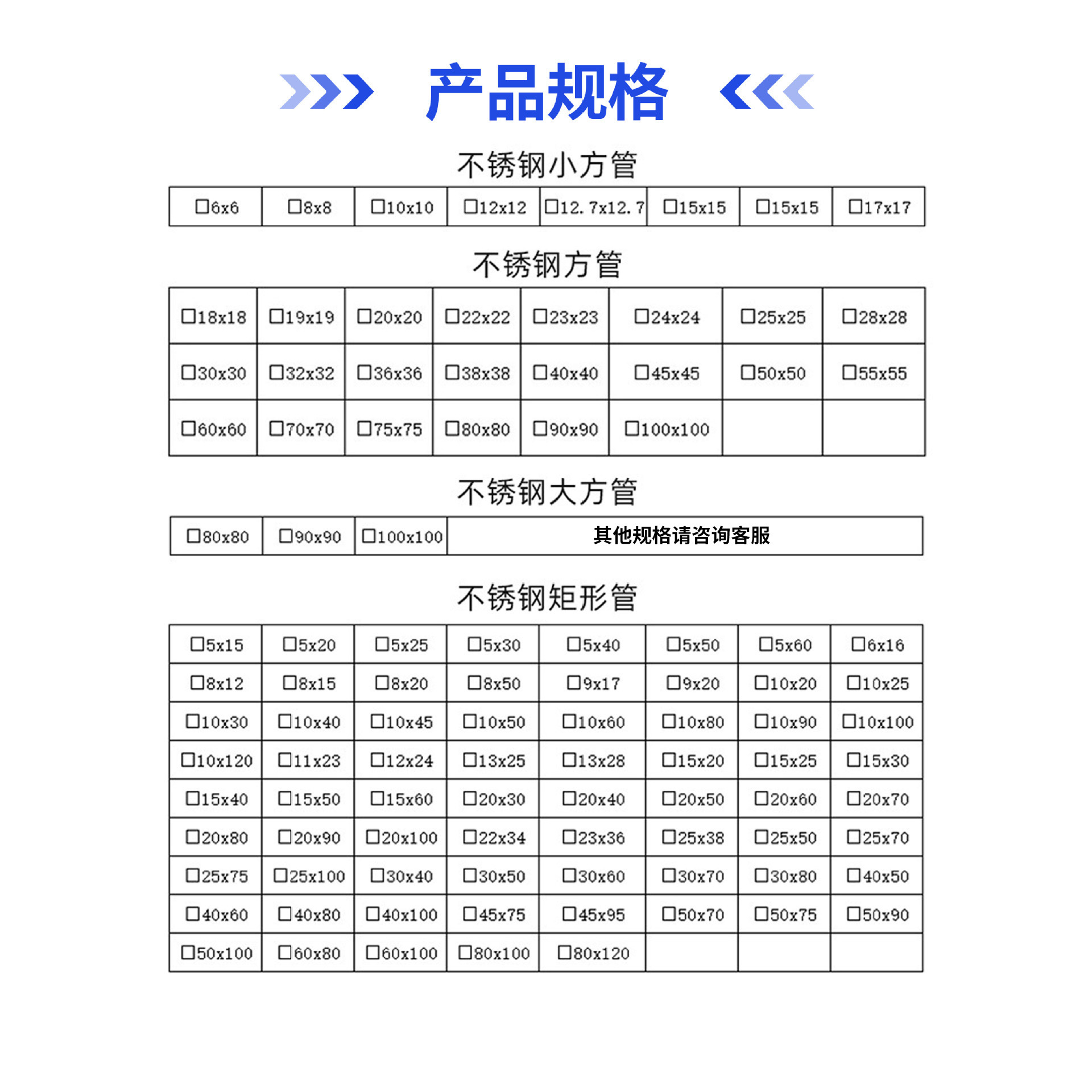 5*15--5*60; 6*16; 8*12; 8*15; 8*20; 8*50; 9*20; 10*20--10*120; 11*23; 12*24; 13*25; 13*28; 15*20--15*60; 20*30--20*100; 22*34; 23*36; 25*38--25*100; 30*40--30*80; 40*50--45*95; 50*70--50*100; 60*80; 60*100; 80*100; 80*120