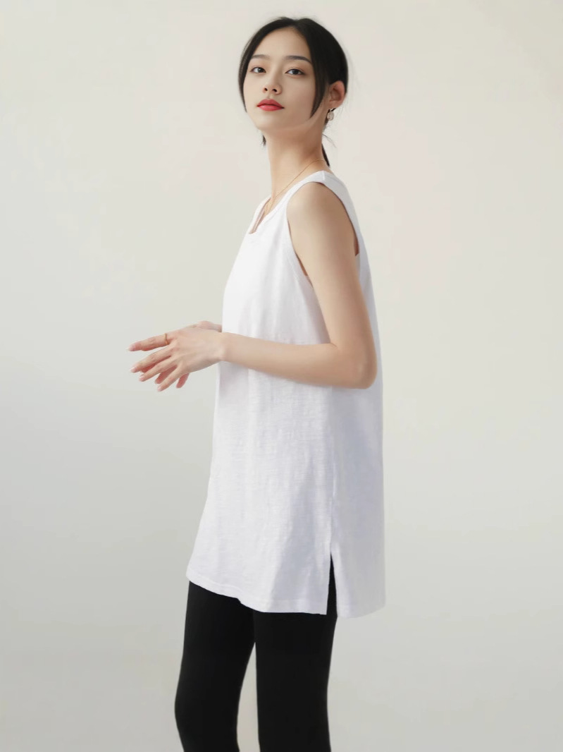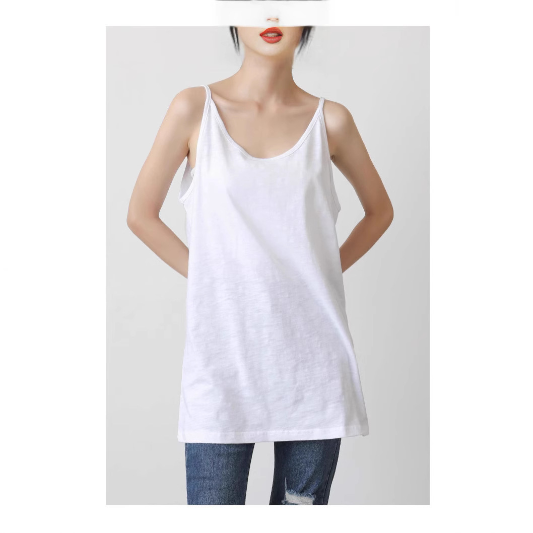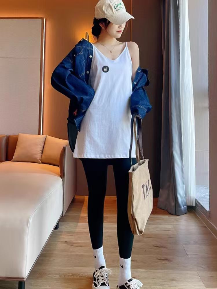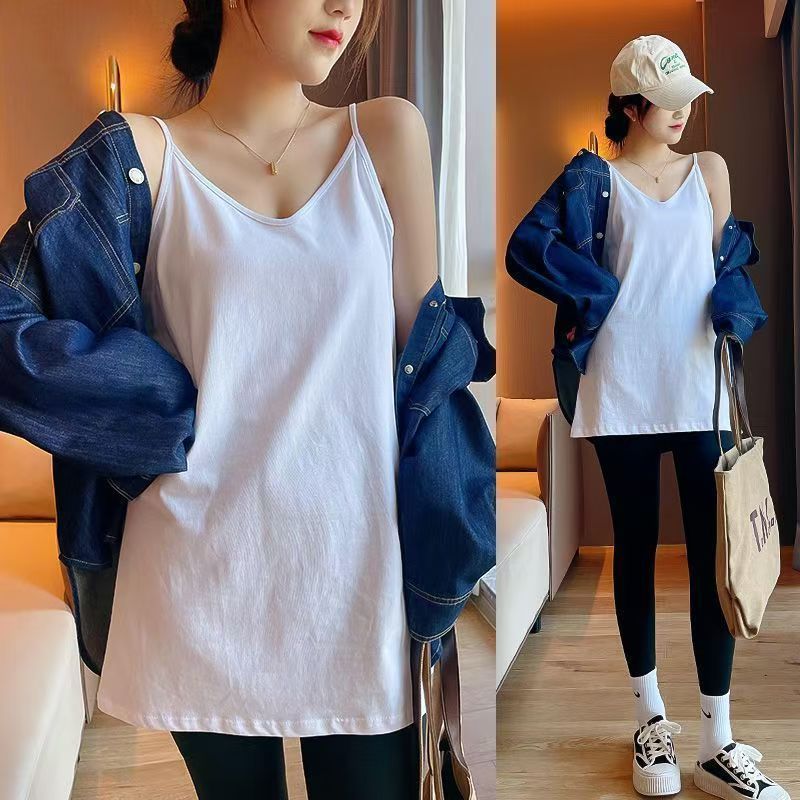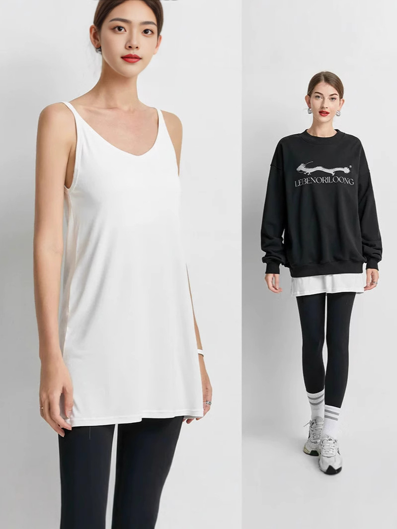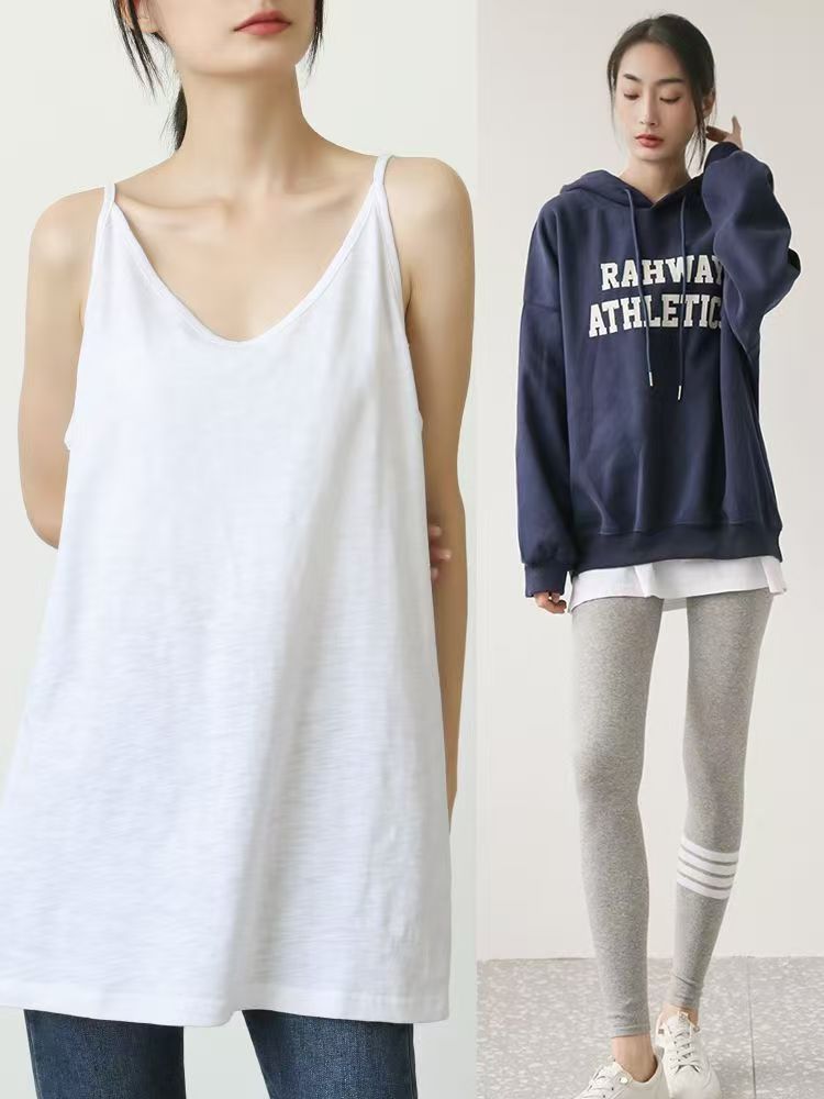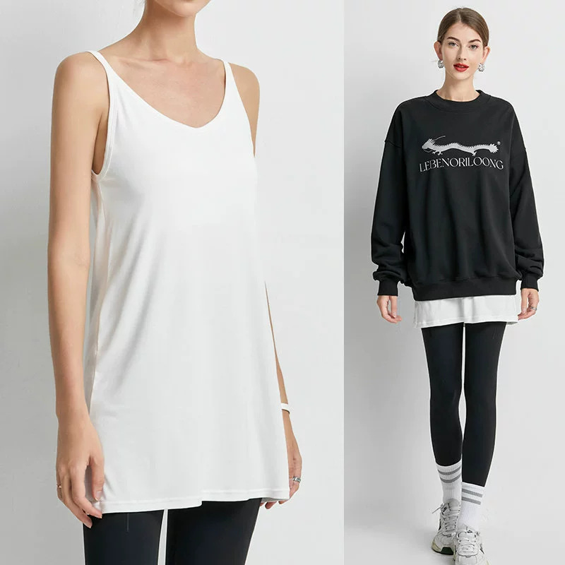Женская толстовка средней длины, нижний жилет, многослойная шторка на ягодицах, свободная белая футболка, топ без рукавов большого размера на подтяжках.