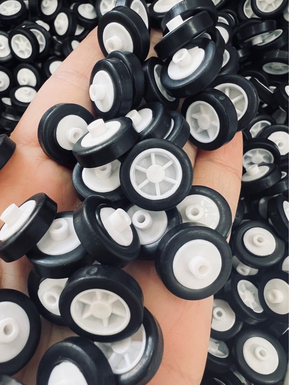 Экологически чистые пластиковые колёса для игрушечных машинок из ТПР, с покрытием из АБС-пластика и резины.