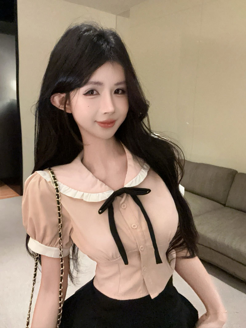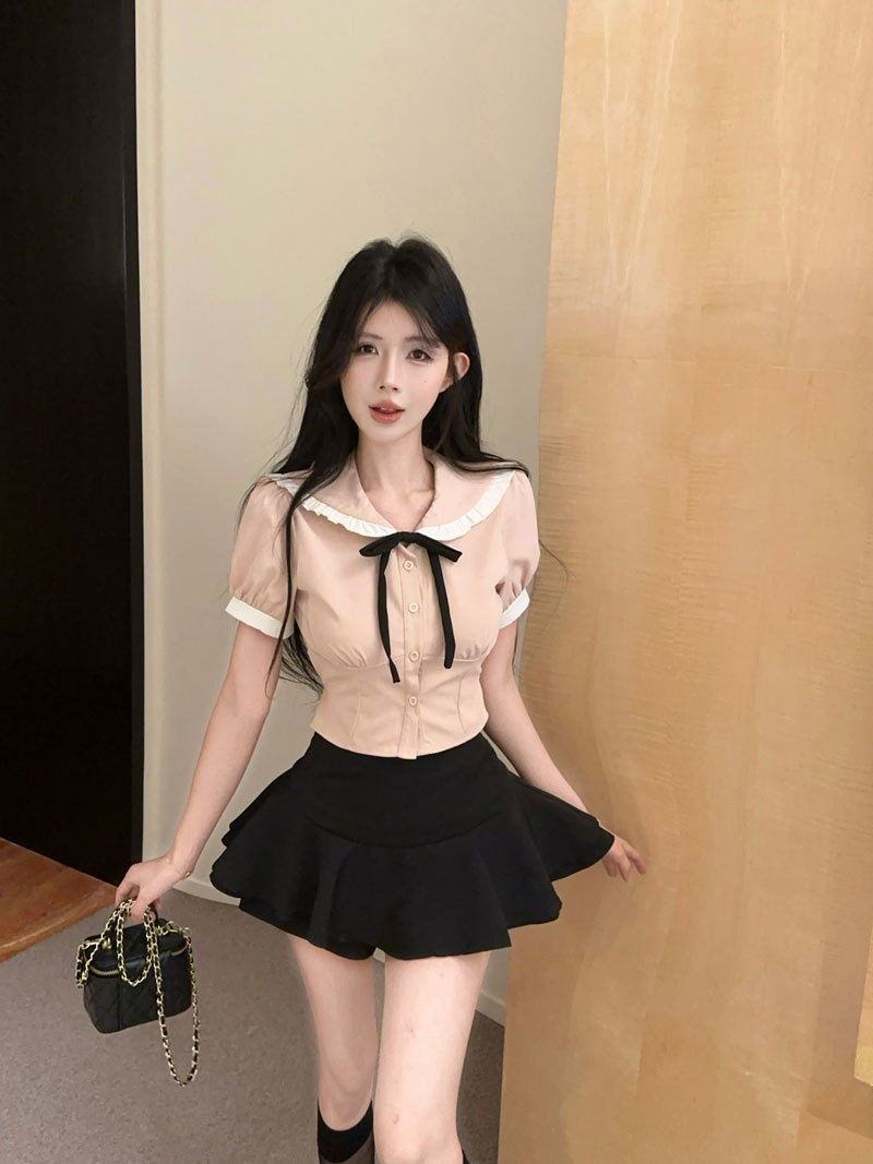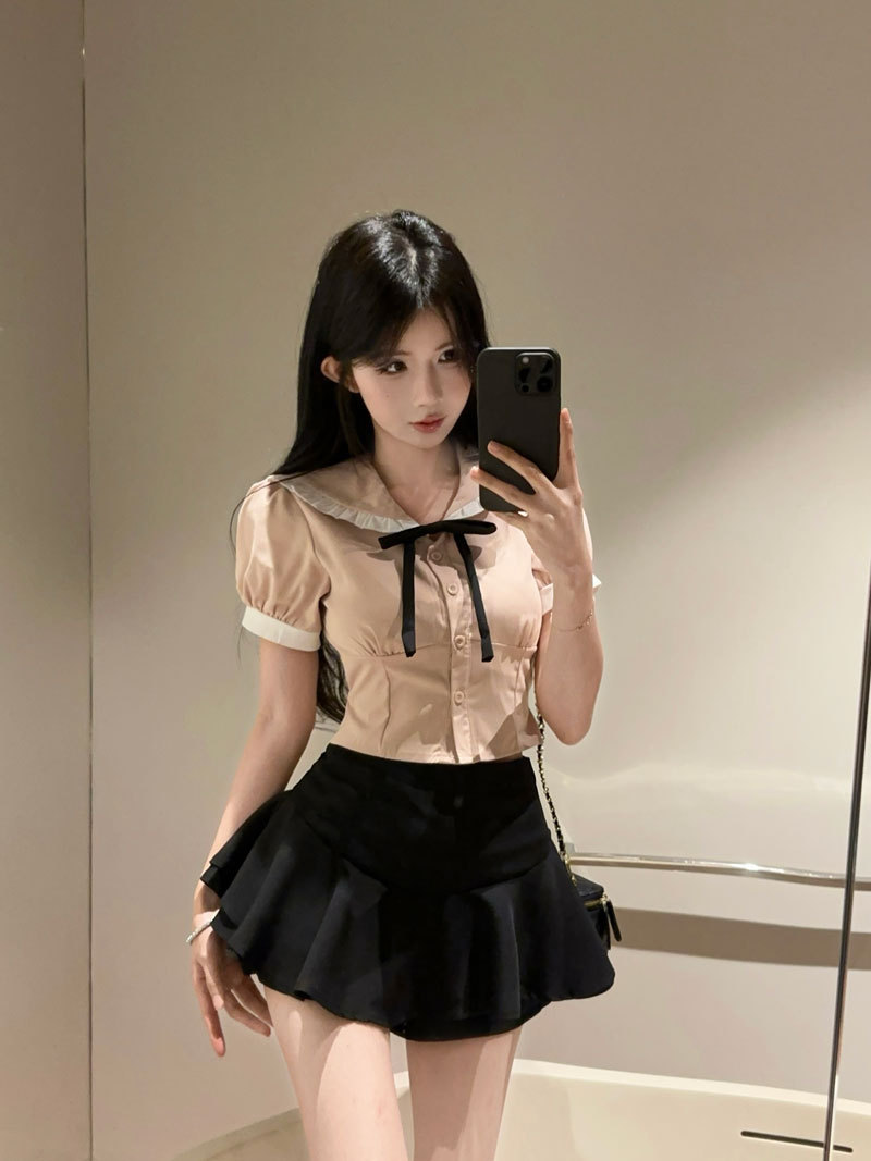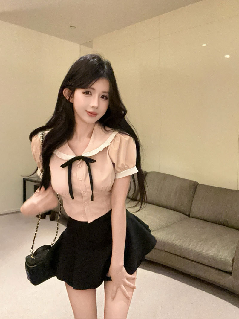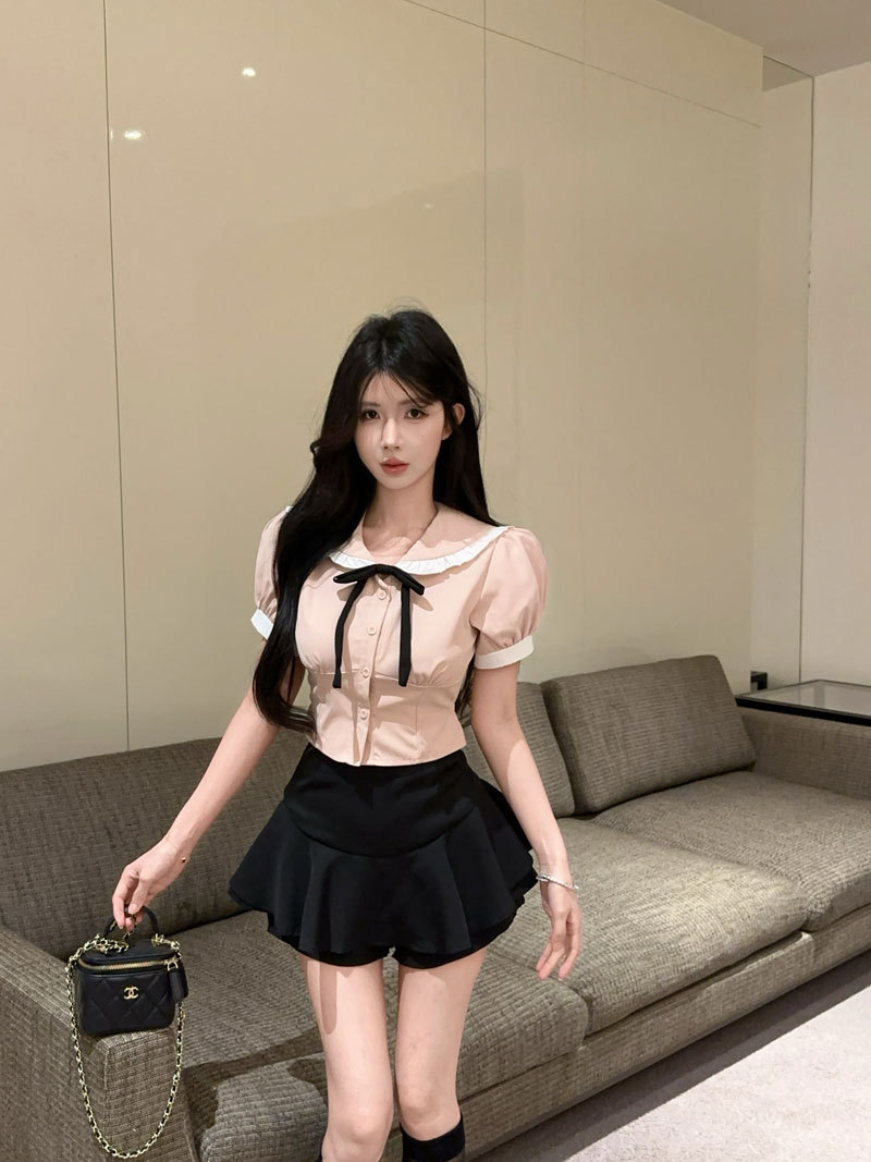 Рубашка с галстуком-бабочкой; черные брюки-кюлоты