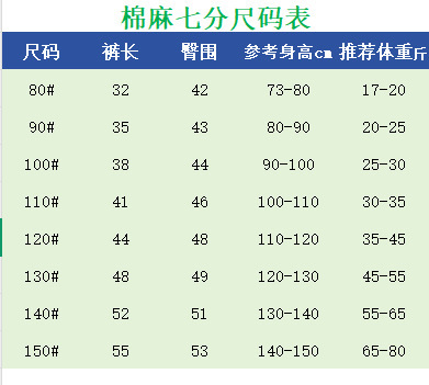 80cm; 90cm; 100cm; 110cm; 120cm; 130cm; 140cm; 150cm