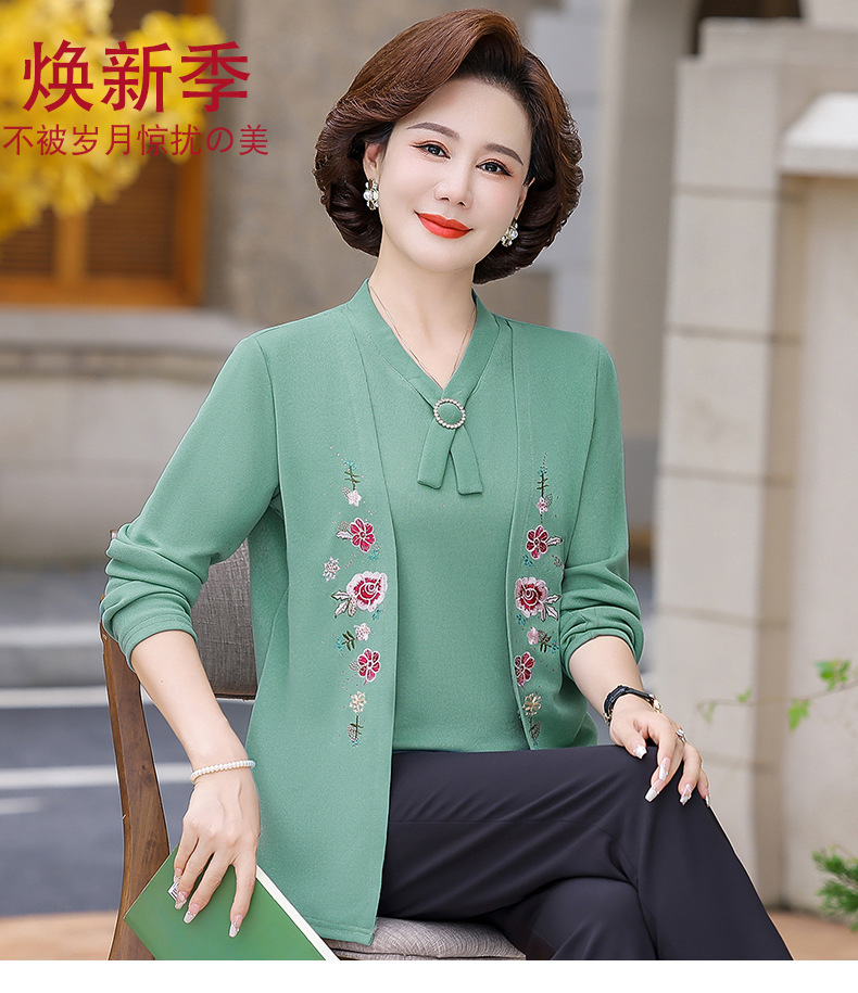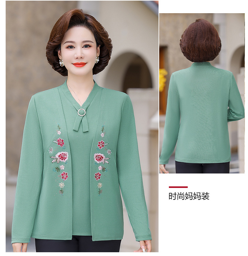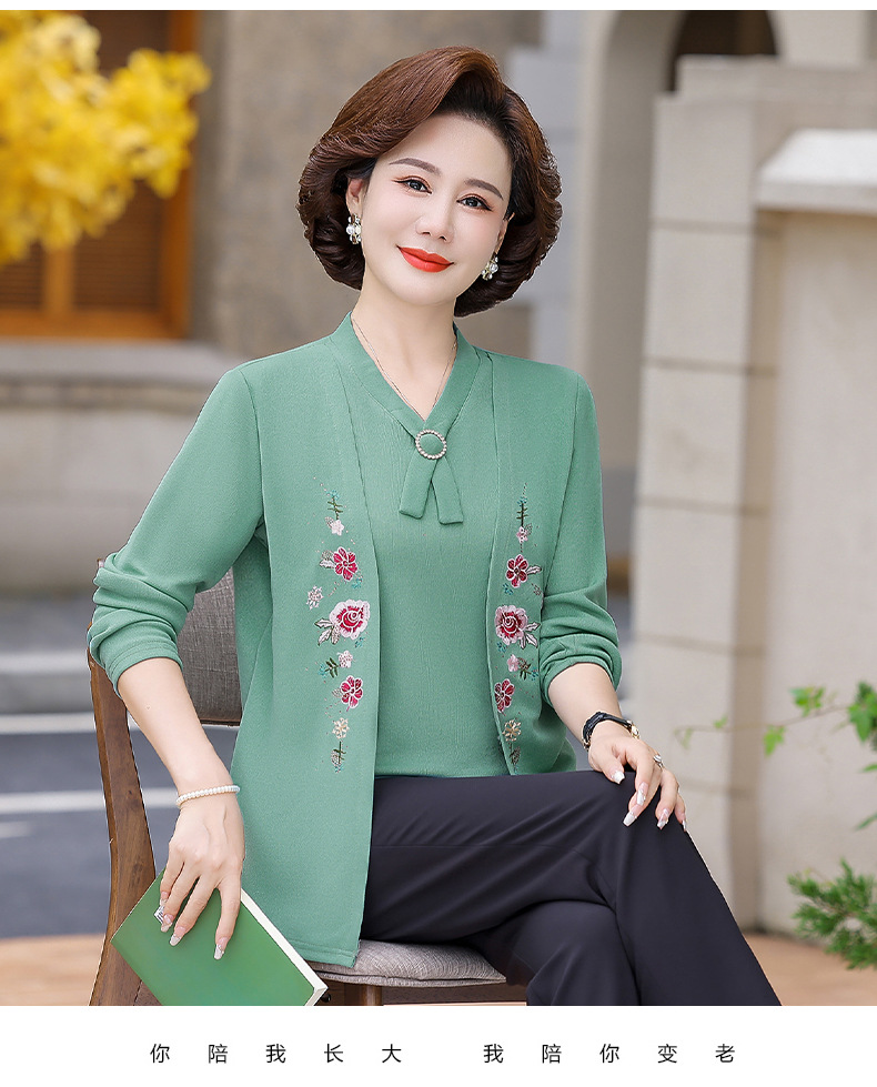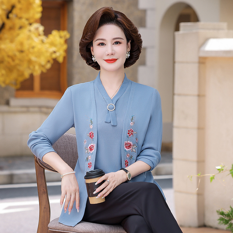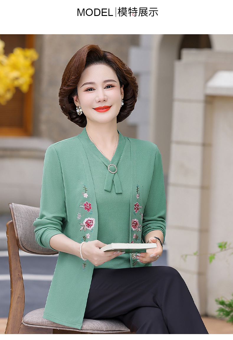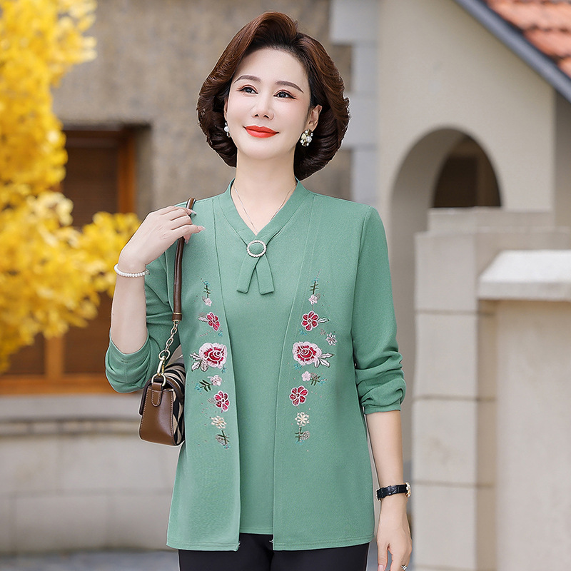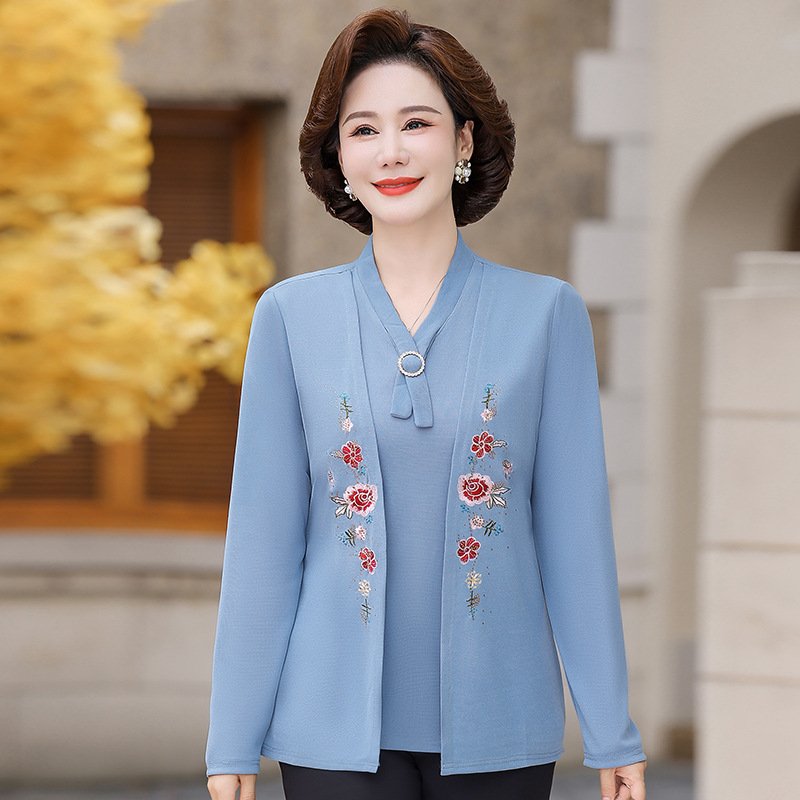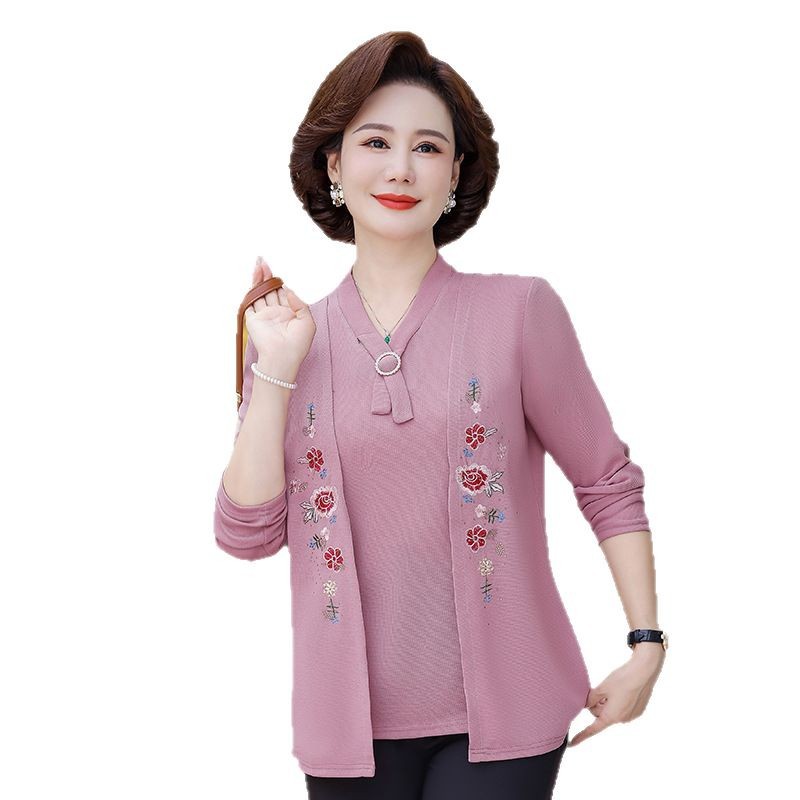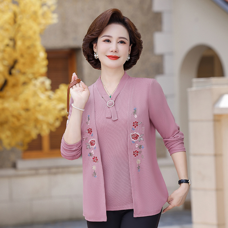 Весенне-осенние трикотажные изделия для мам с вышитыми цветами для женщин среднего и пожилого возраста, осенние нижние рубашки, стильные топы, закрывающие живот, для женщин среднего и пожилого возраста.