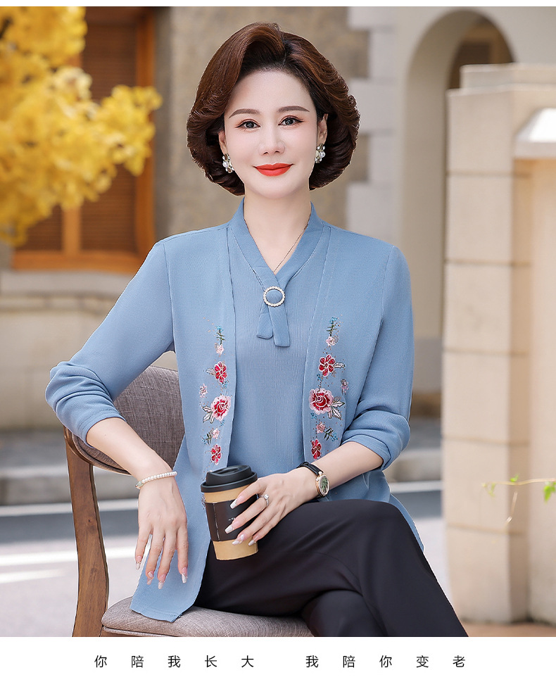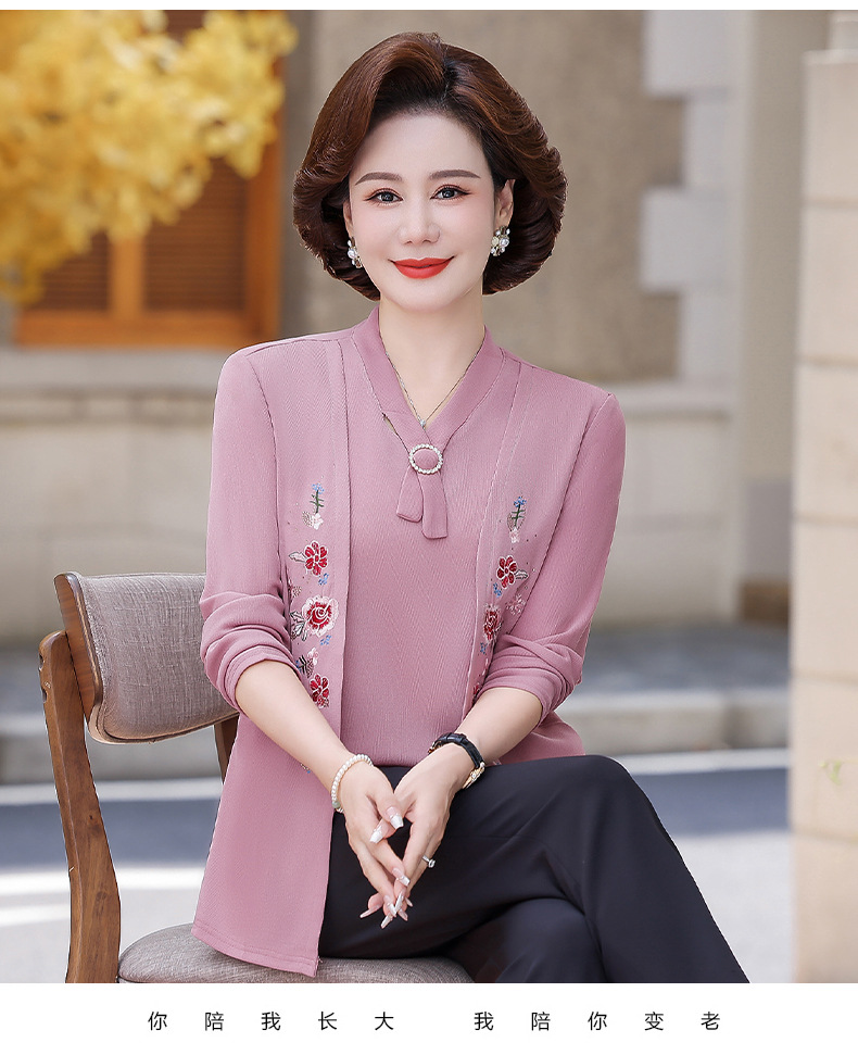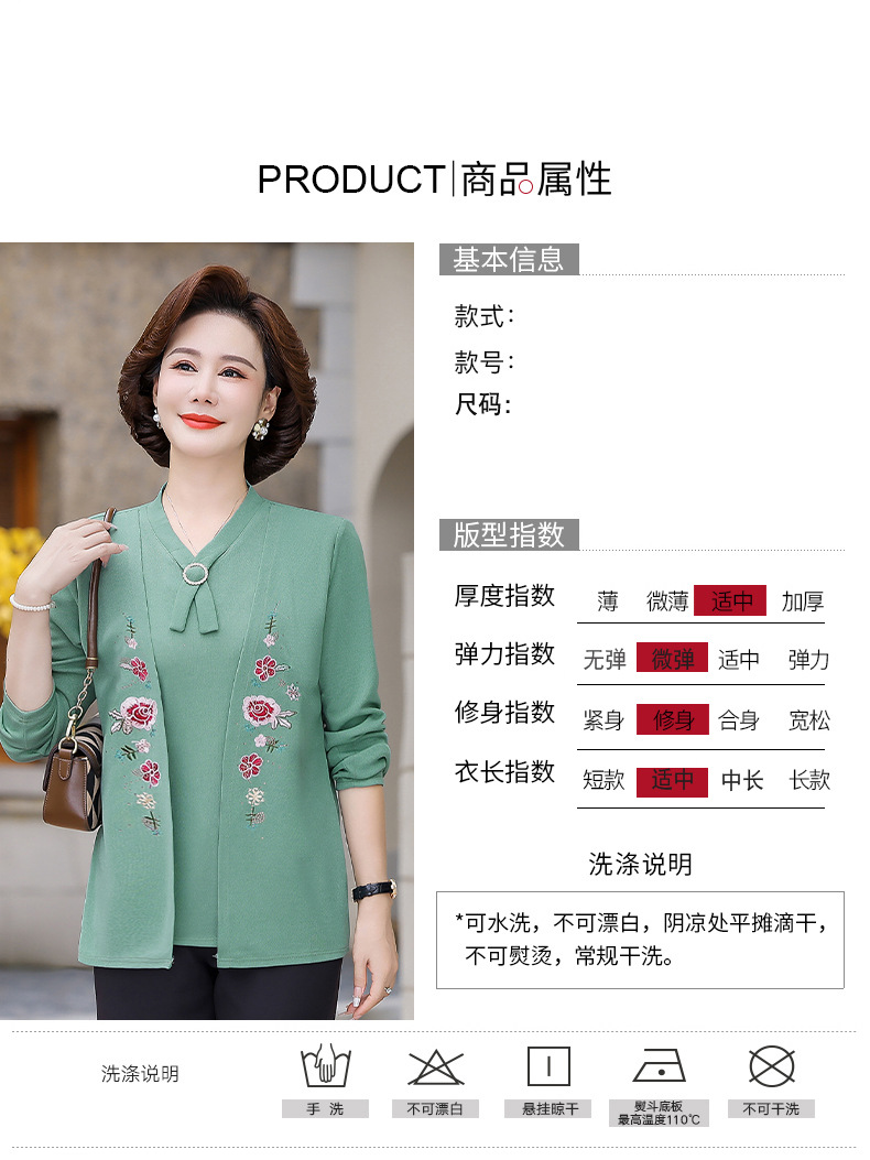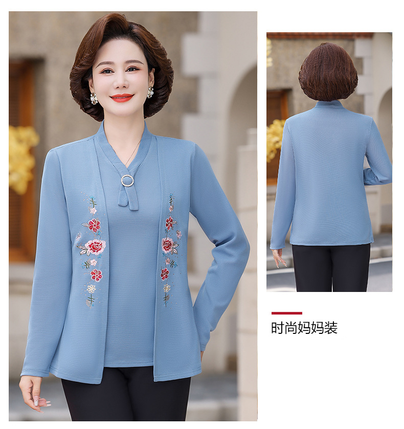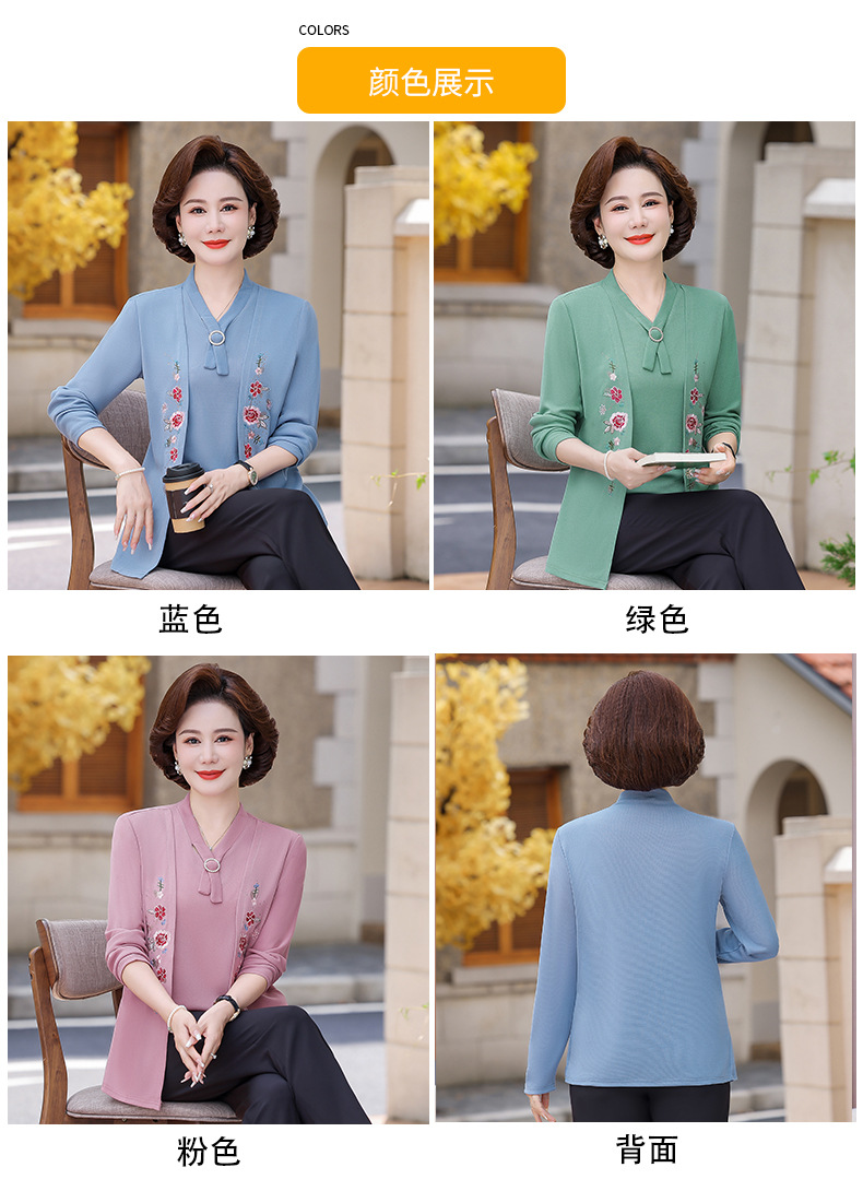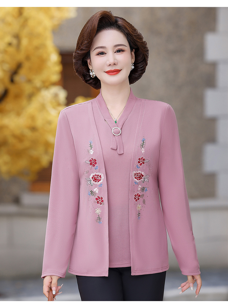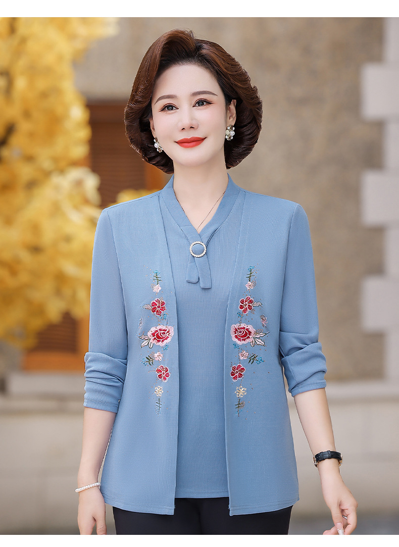 Весенне-осенние трикотажные изделия для мам с вышитыми цветами для женщин среднего и пожилого возраста, осенние нижние рубашки, стильные топы, закрывающие живот, для женщин среднего и пожилого возраста.