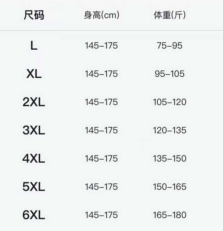 L(рекомендуется 35-47.5kg ); XL (рекомендуется 47.5-52.5kg ); 2XL (рекомендуется 52.5-60kg ); 3XL (рекомендуется 60-67.5kg ); 4XL (рекомендуется 67.5-75kg ); 5XL (рекомендуется 75-82.5kg ); 6XL (рекомендуется 82.5-90kg )