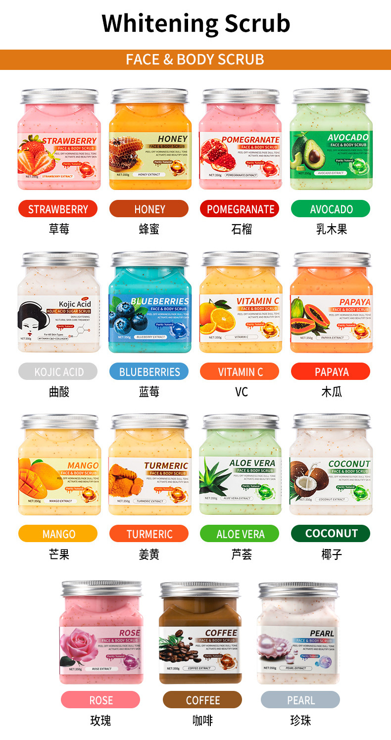 Розовый скраб 350 г [Количество коробок: 72 шт./кор., продукция предназначена только для экспорта, продажи внутри страны запрещены]; Жемчужный скраб 350 г [Количество коробок: 72 шт./кор., продукция предназначена только для экспорта, продажи запрещены в Китае]; Кофейный скраб 350г [Количество коробок: 72 шт./кор., продукция предназначена только для экспорта, продажи на внутреннем рынке запрещены]; Скраб с черникой 350г [можно персонализировать/изменить логотип]; Скраб из авокадо 350г [Продается только через каналы внешней торговли]; Скраб с койевой кислотой 350г [можно настроить/изменить логотип]; Скраб с куркумой 350г [Продается только через каналы внешней торговли]; Скраб из папайи 350г [Только для каналов внешней торговли]; Кокосовый скраб 350г [Только для внешнеторговых каналов]; Клубничный скраб 350г [Количество в упаковке: 72шт/кор.]; Апельсиновый скраб VC 350 г [количество в упаковке: 72 шт./кор.]; Медовый скраб 350г [Продается только через каналы внешней торговли]; Скраб Алоэ Вера 350 г [Полная серия на английском языке]; Скраб Манго 350г [Количество в упаковке: 72/бутылка]; Гранатовый скраб 350г [Только для внешнеторговых каналов]