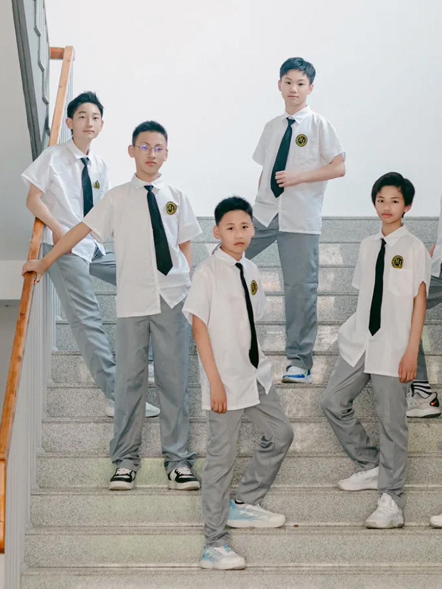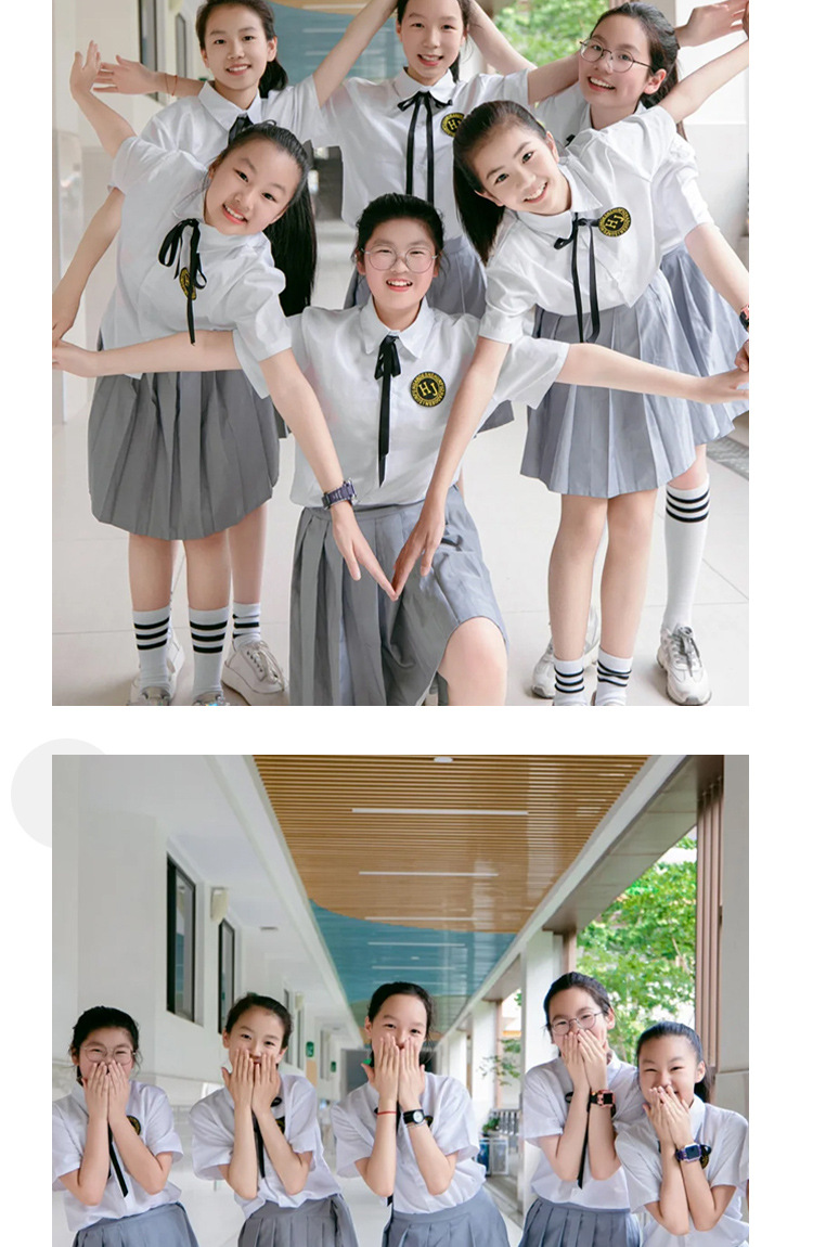 Девочки короткие рукава + ленты + значки; Девочки длинные рукава + ленты + значки; Девочки короткие рукава + серая юбка + лента + значок; Девушка с короткими рукавами + серая юбка миди + лента + значок; Девочки длинные рукава + серая юбка + лента + значок; Длинные рукава для девочек + серая юбка миди + лента + значок; У мальчика короткие рукава + галстук + значок; Мужские длинные рукава + галстук + значок; У мальчика короткие рукава + серые шорты + галстук + значок; У мальчика короткие рукава + серые брюки + галстук + значок; Мужские длинные рукава + серые брюки + галстук + значок