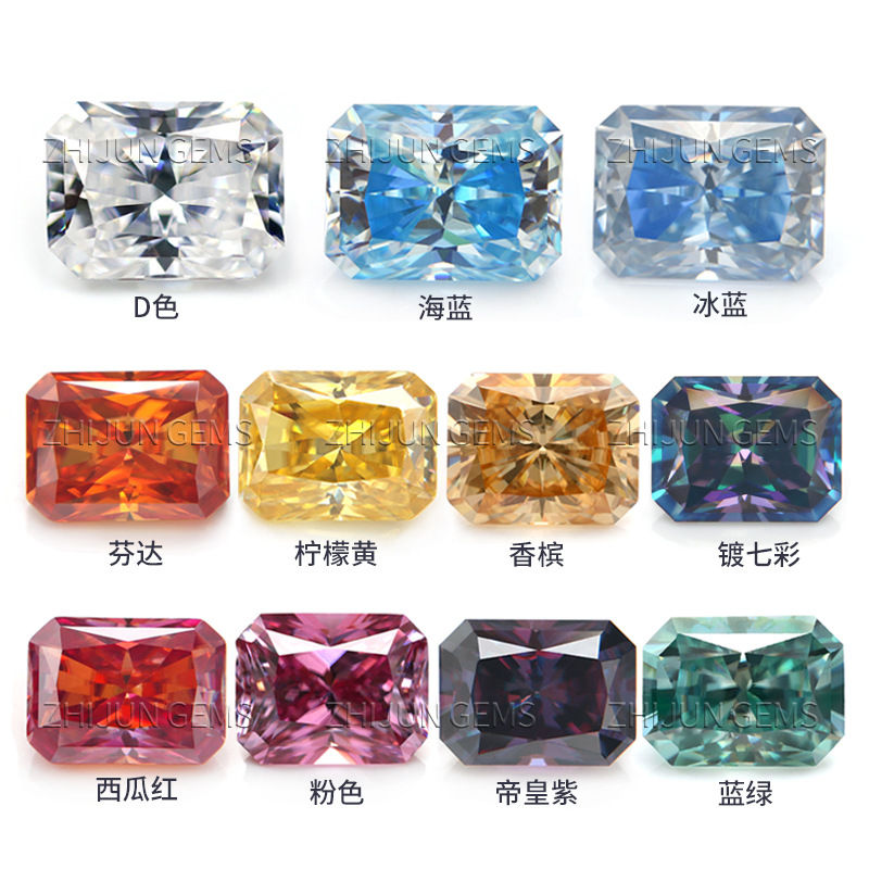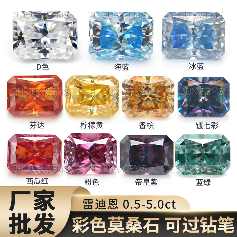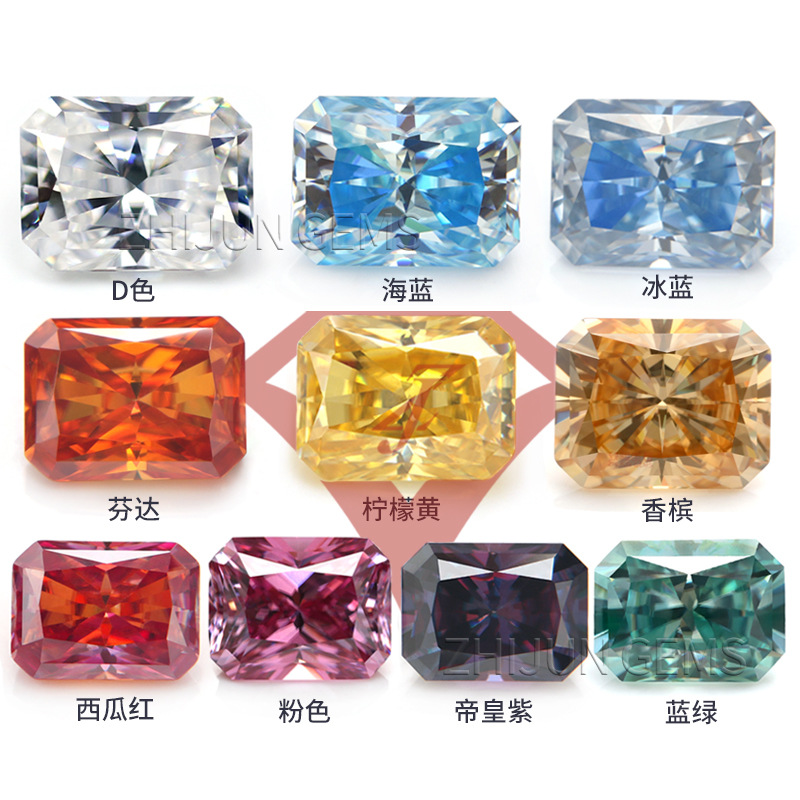 Сияющие цветные муассаниты (россыпью) цвета D, Fanta, императорский фиолетовый, оранжевый, розовый, зеленый и океанский синий с длинными гранями.