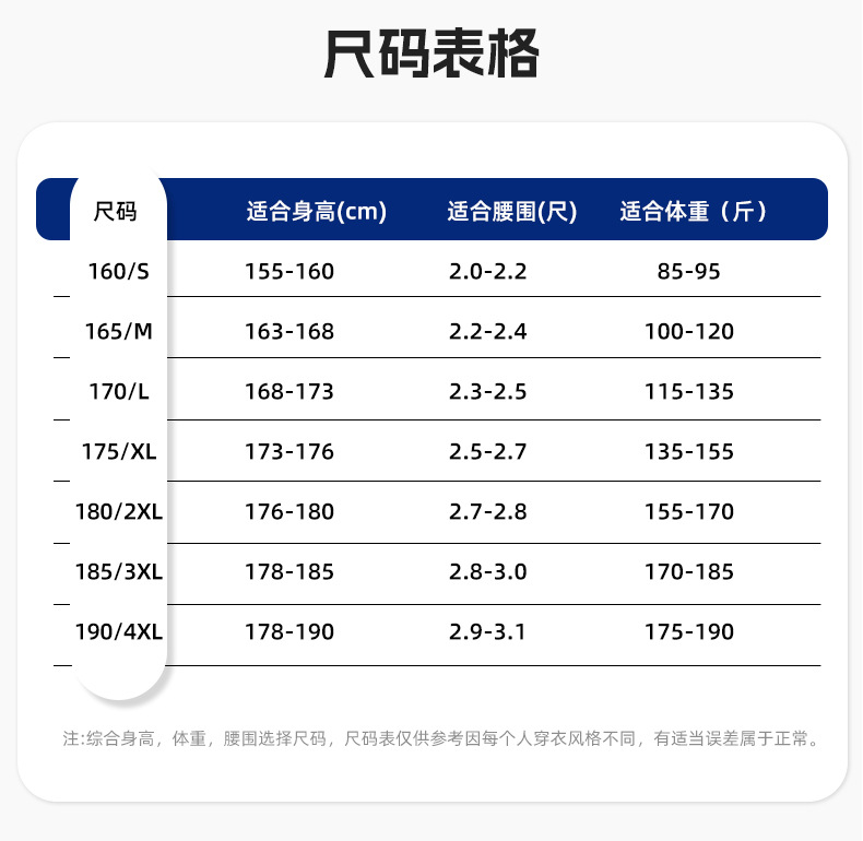 160/S; 165/M; 170/L; 175/XL; 180/XXL; 185/XXXL; 190/XXXXL