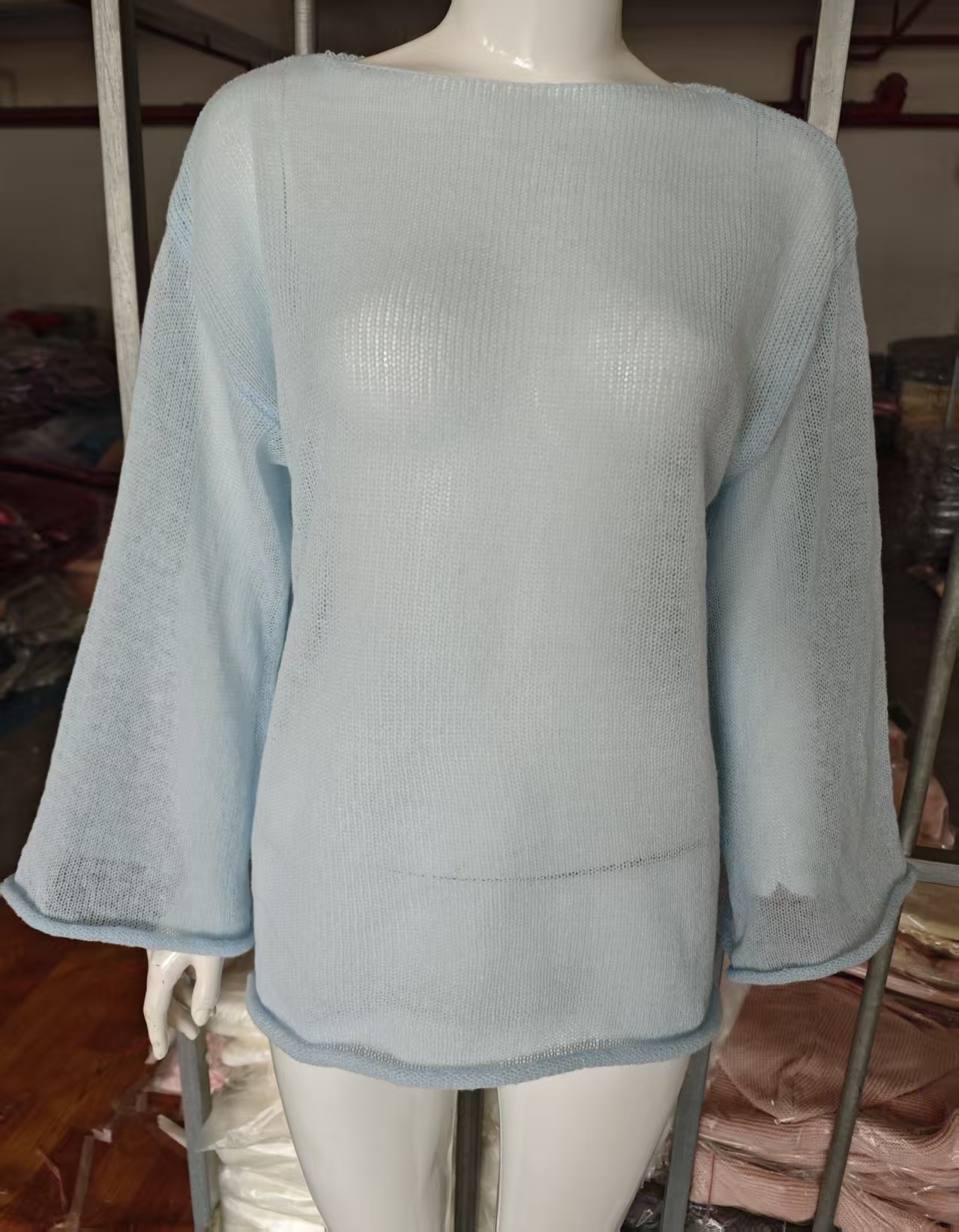 Трансграничный полый трикотажный свитер Европа и США 2025 весна и лето новая женская перспектива тонкий большой круглый воротник с расклешенными рукавами трикотажная футболка