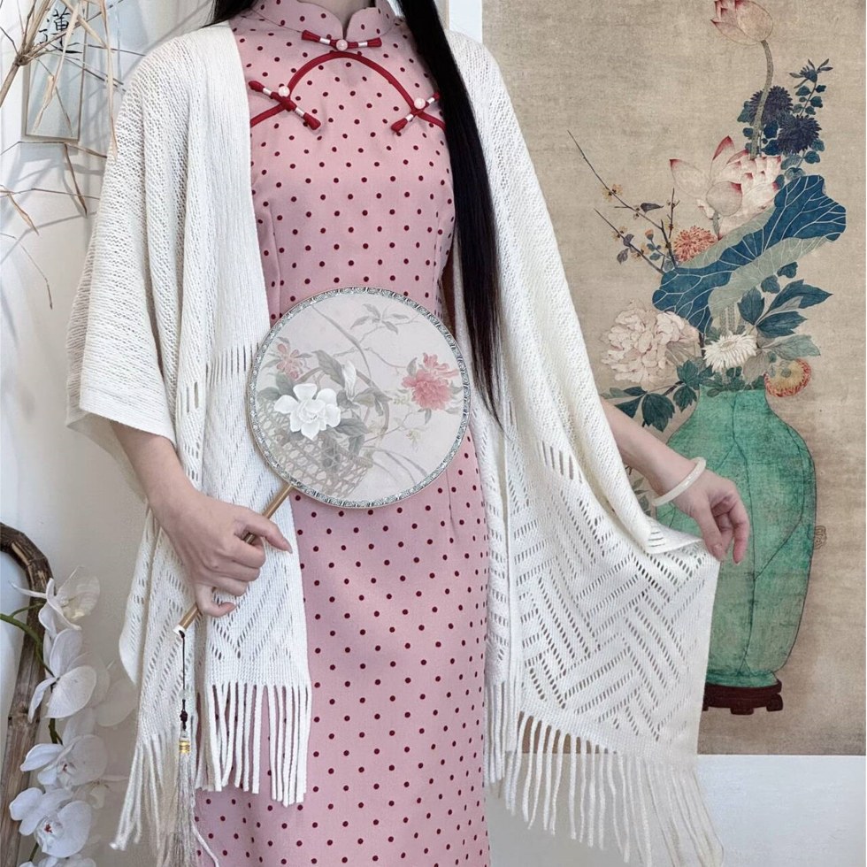 розовый чонсам; Белоснежная шаль [один размер подходит всем]
