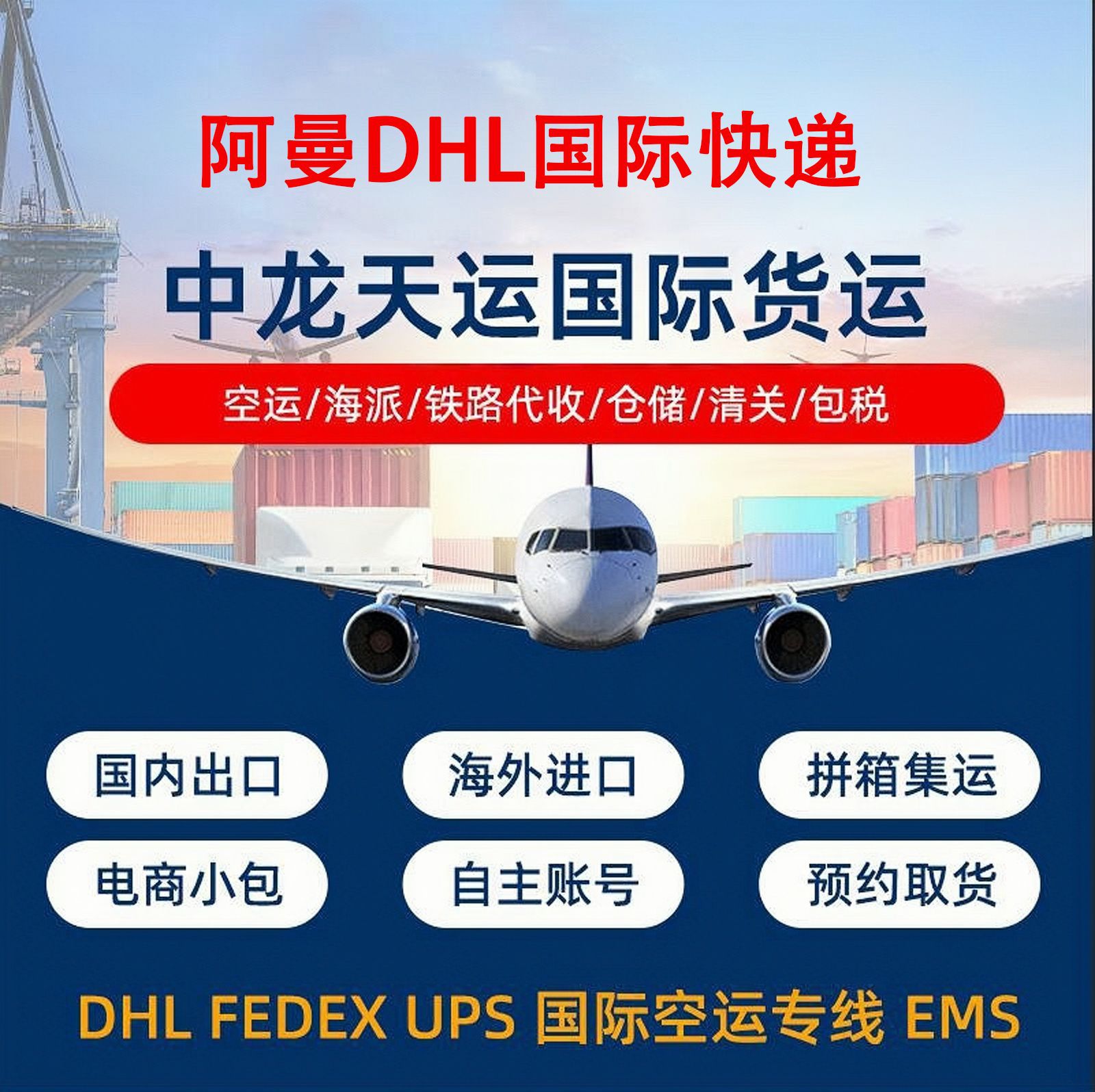 本公司主要经营业务:代理TNT天地物流、DHL中外运敦豪、 EMS 全球特。快专递、 UPS 联合包裹、FEDEX联邦快递,价格优惠,服务专业,义乌地区和深圳宝安机场附近免费上门接件。本着为顾客着想,提供全面服务为宗旨,经济实惠、高效、快捷、准时、优质、守信的企业理念,高度的责任感和热情服务广大客商。“客户至上”,“诚信第一”是我司服务的宗旨.我公司在世界各地拥有完善的代理网络,开通有国际快递专线:中东(包括伊朗,伊拉克)国家专线、日本专线、韩国专线、台湾专线、香港专线、南亚专线(泰国、新加坡、马来西亚,孟加拉、巴基斯坦、斯里兰卡),欧洲专线等; 国际空运,我公司拥有俄航,大韩,阿联酋航空,泰航,全日空等优势航线运价;并可提供在上海和深圳口岸出口报关服务. 中龙天运每一位员工都真诚地期待与您携手合作,共创美好的明天!