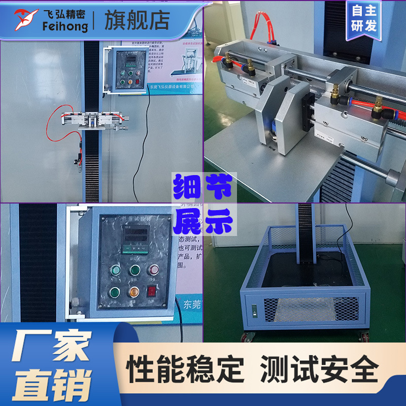 本机采用电动升降、气动跌落结构,升降定位准确、快捷,跌落真实有效;配置专用气动夹具(可调行程),夹具前端配有硅橡胶(避免夹伤产品或操作者),可进行电子烟跌落测试;跌落高度由电机驱动、精密螺杆传动上下调整,运行平稳,低噪声,无需人手搬动上下,并附有刻度标尺,可精准得知部品跌落高度,产品可从不同角度进行跌落。
