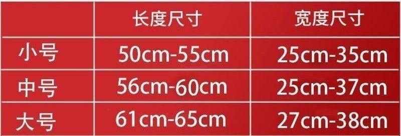 Маленький размер (доступна плоская длина 49-55 см); Средний размер (доступен в плоском виде длиной 55–60 см); Большой размер (доступен в плоском виде длиной 60–65 см)