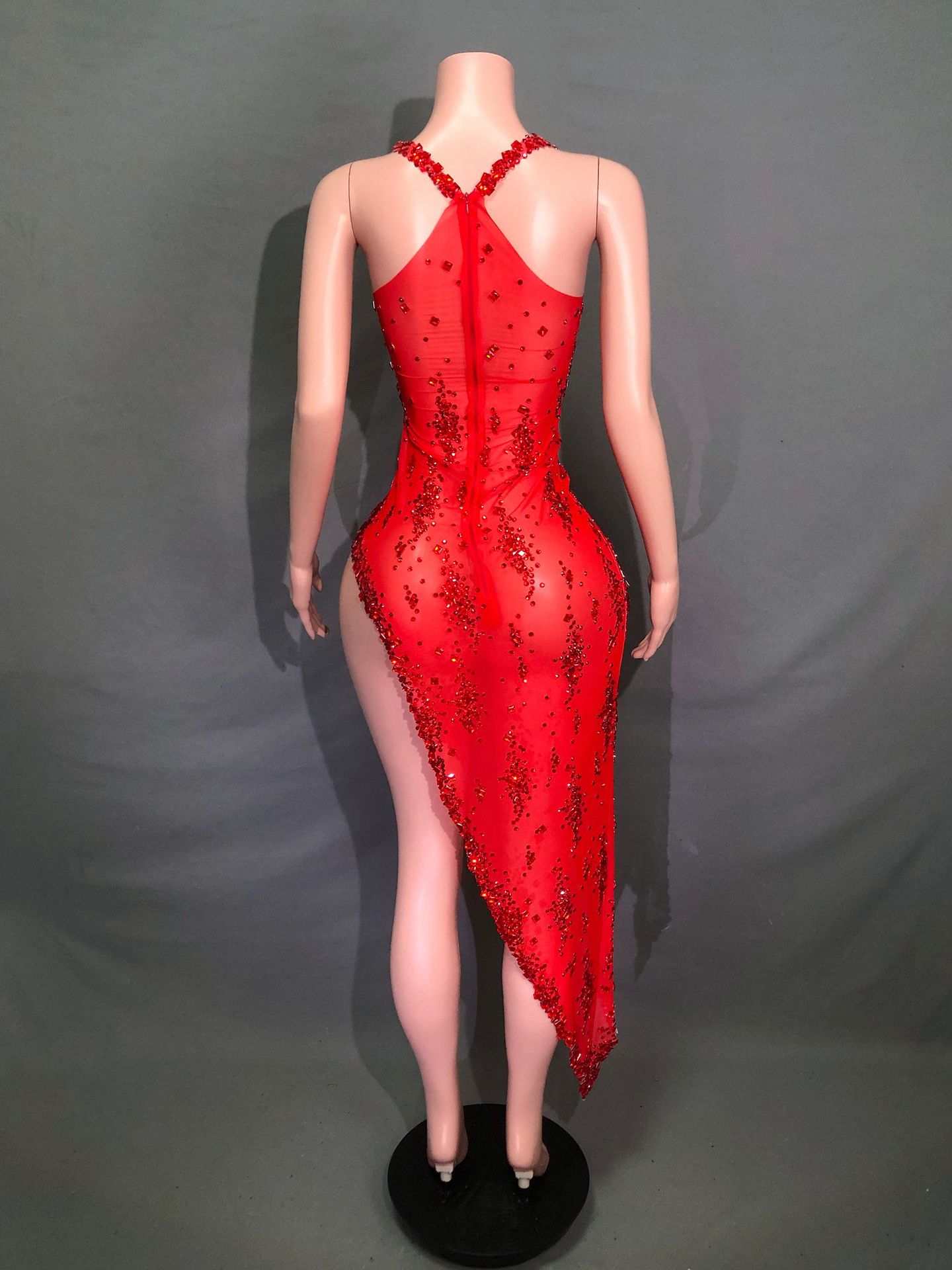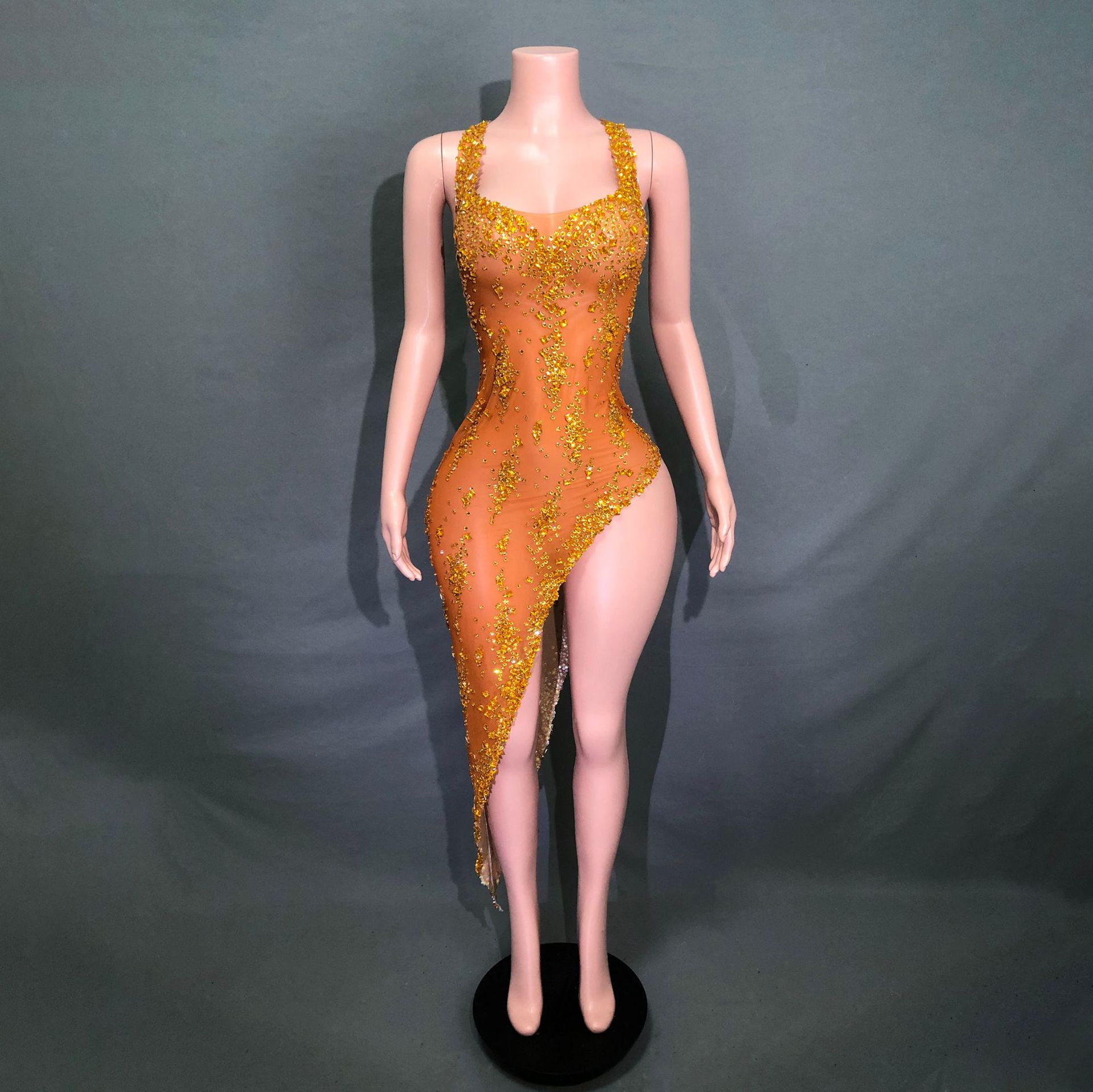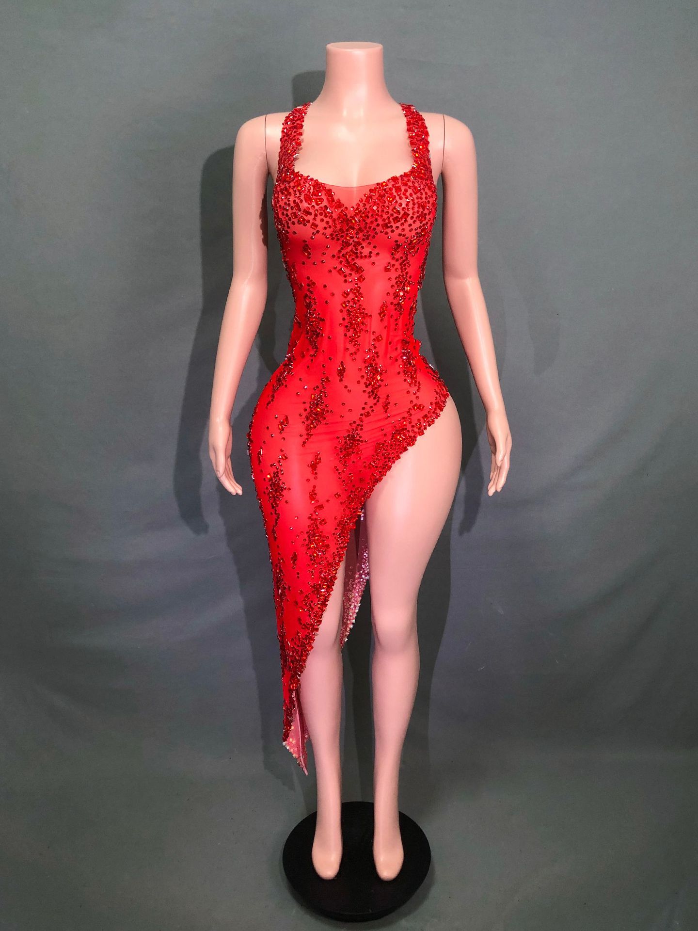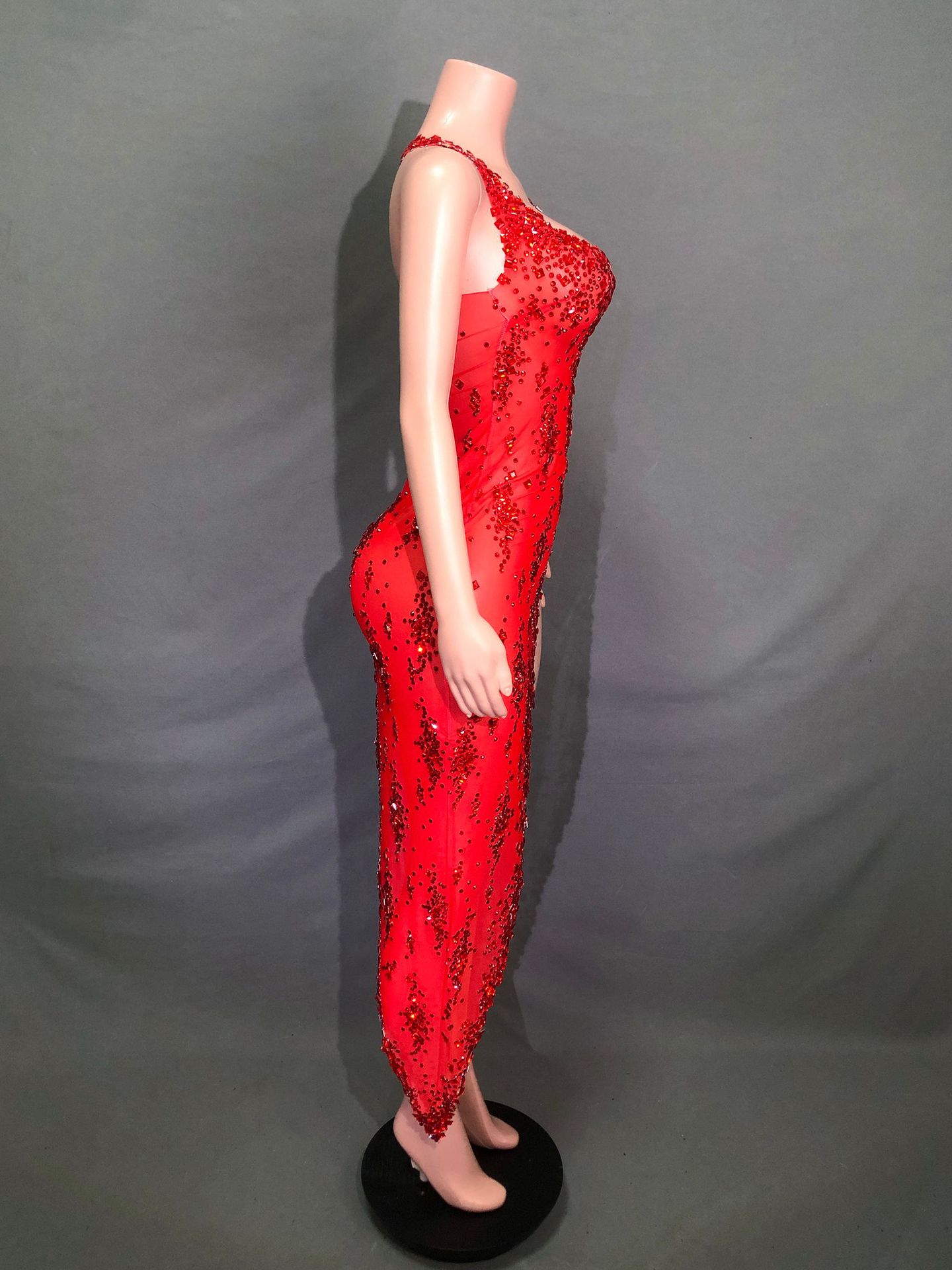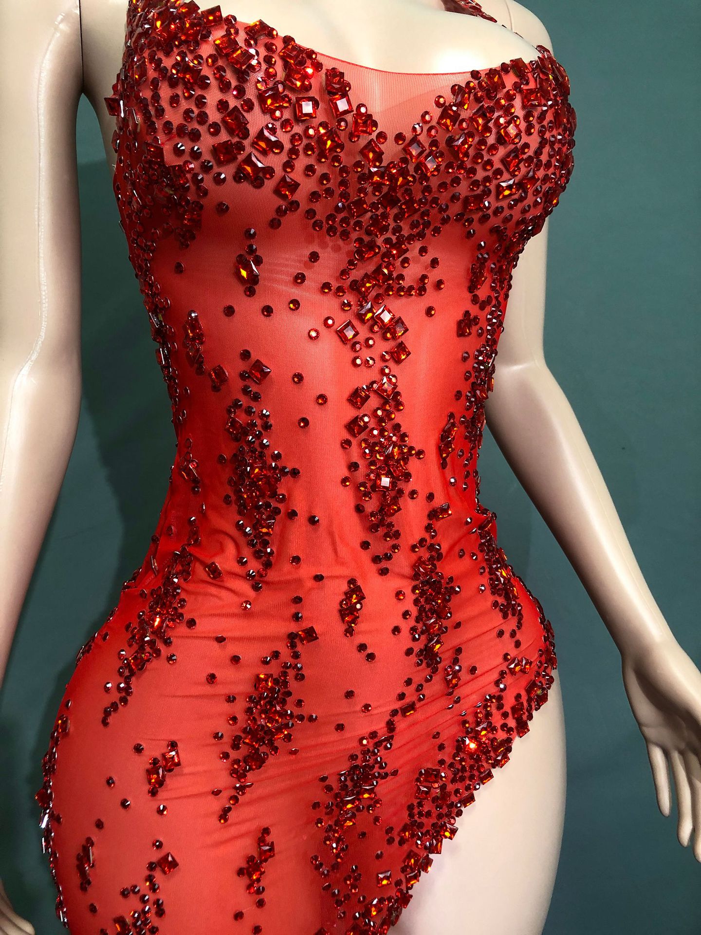Новая цельная одежда для выступлений, сценический комбинезон с бриллиантами, европейский и американский красный сексуальный прозрачный комбинезон