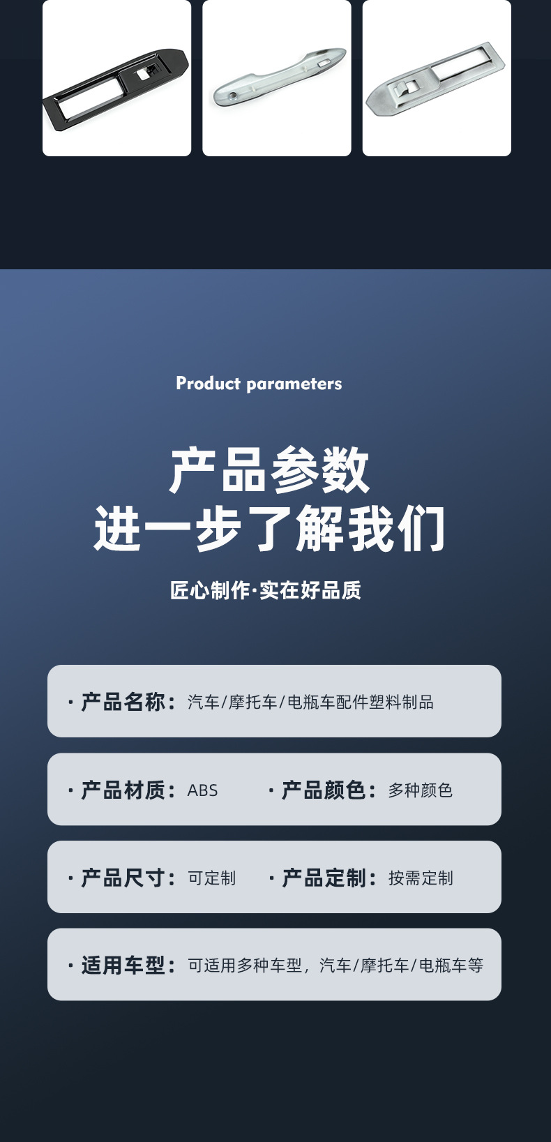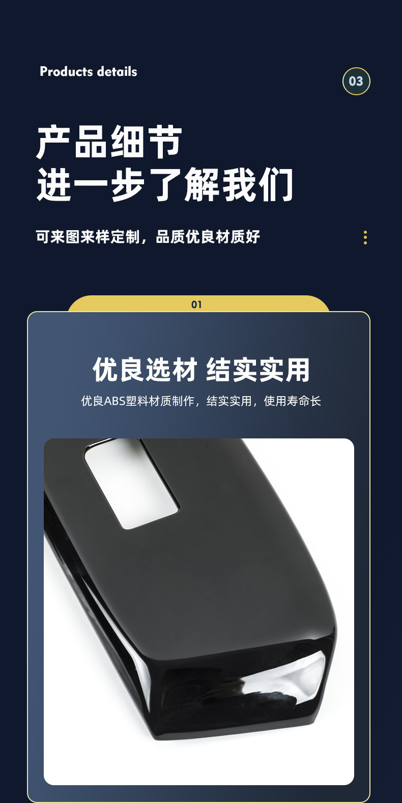 We are a first-line self-operated manufacturer, offering the most professional products and the most favorable prices. We can produce customized ABS plastic parts such as car nameplates and auto parts. After you provide samples or electronic drawings, we can start mold making, sample production and wholesale for you. All products need to be custom-made with molds.