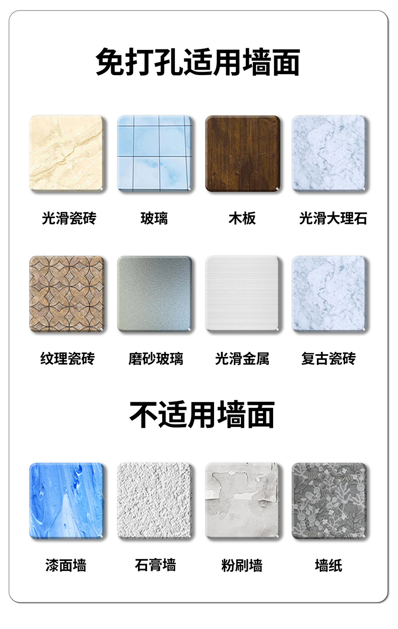 (2)安装请注意,安装前请看视频,墙面需平整坚固的玻璃瓷砖等。不可用在粉刷墙,墙纸,石灰墙等不平整不坚固的墙面上。涂胶上墙后需等待3-5天,免钉胶完全干透再使用!