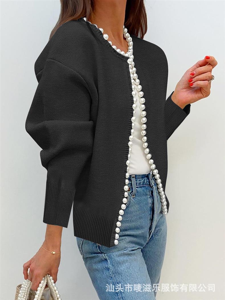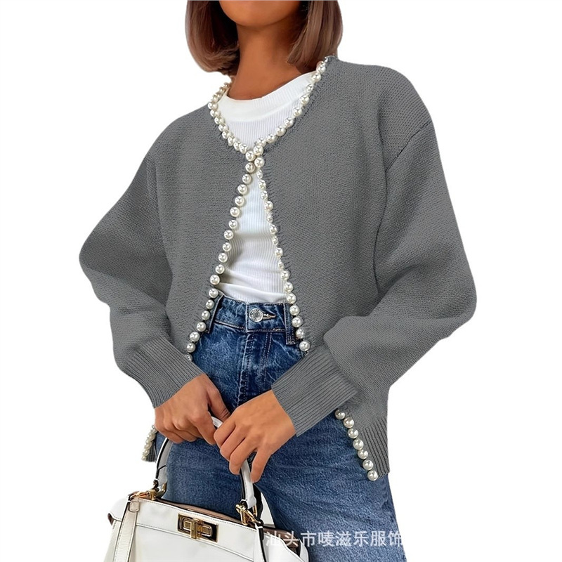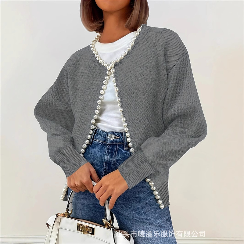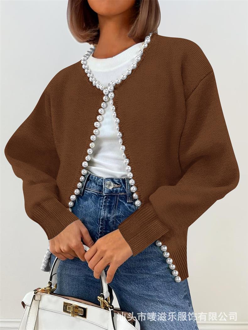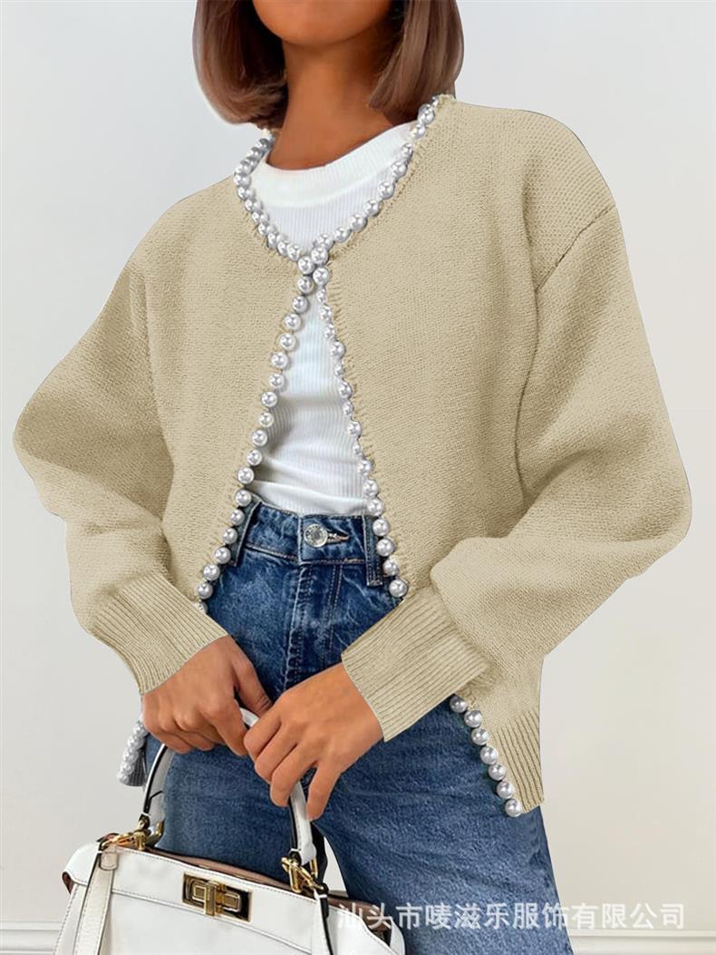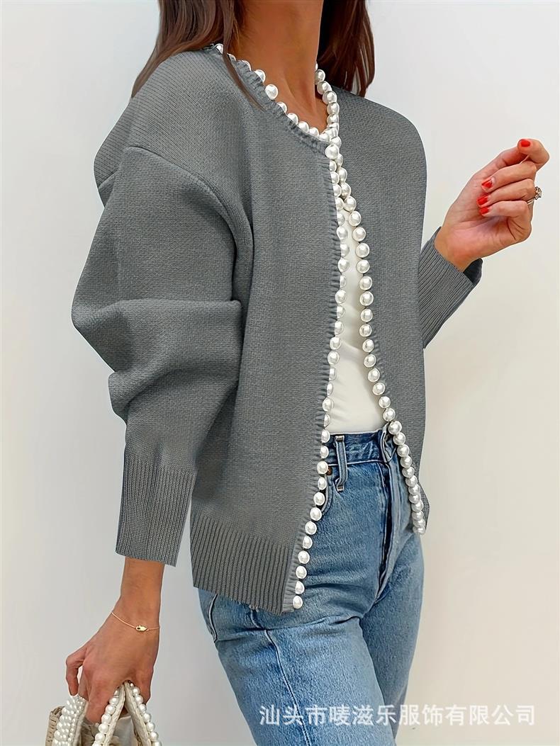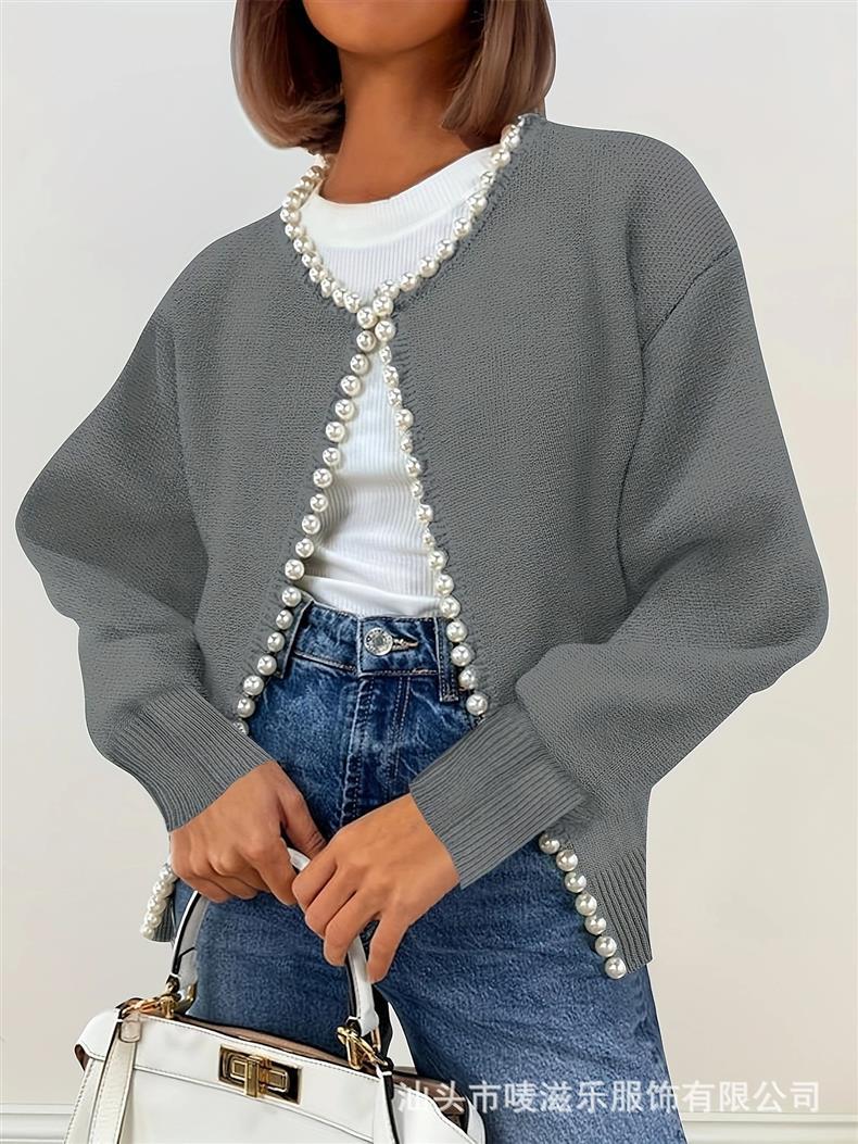 Женский кардиган с круглым вырезом и жемчужной отделкой, осенне-зимняя коллекция 2025 года, новинка для трансграничной торговли Amazon в Европе и Америке.