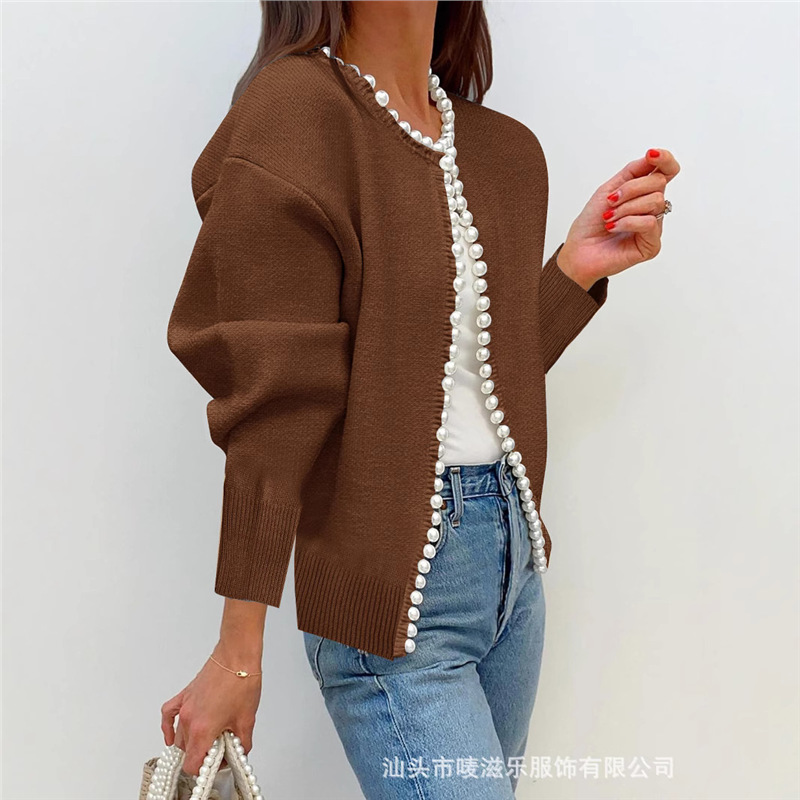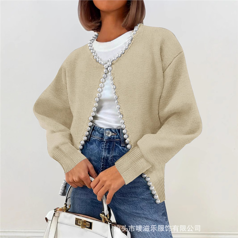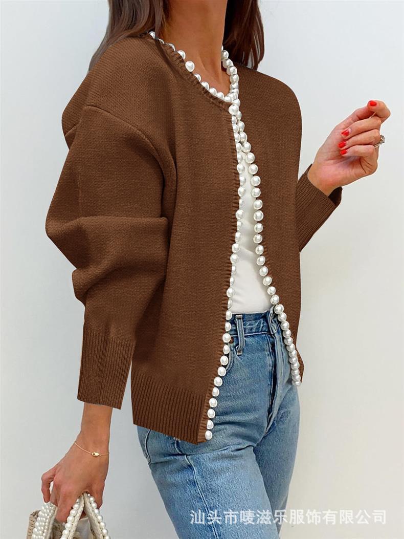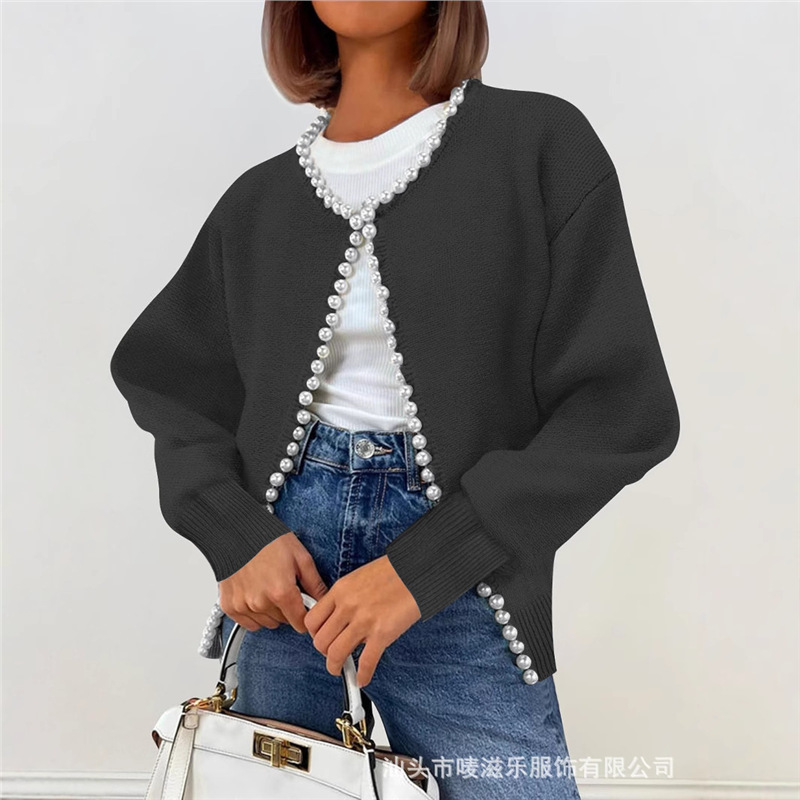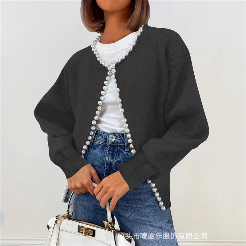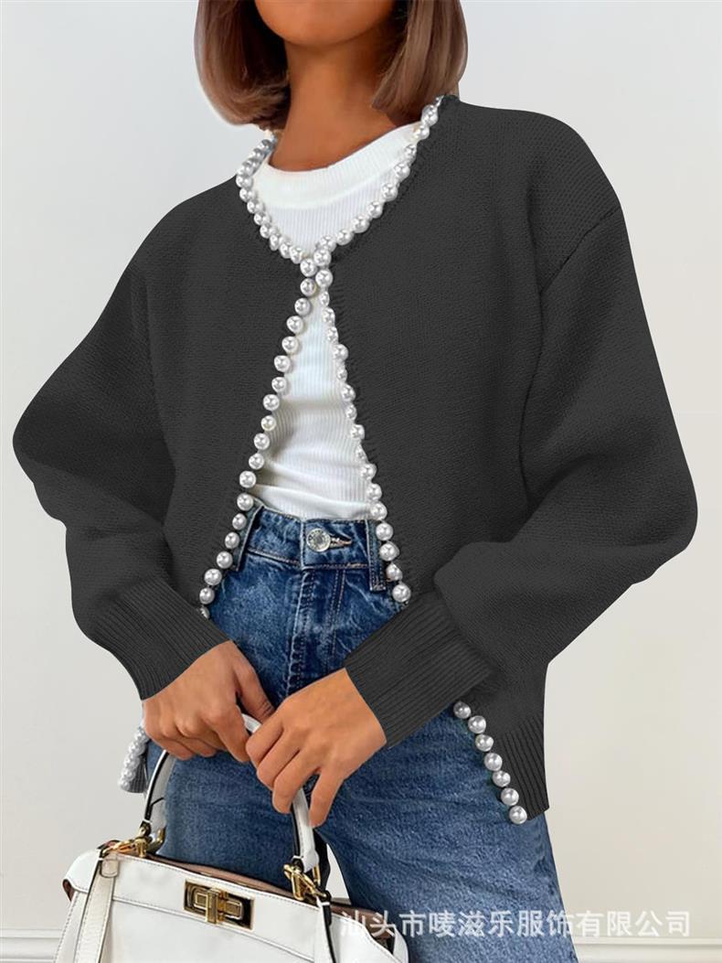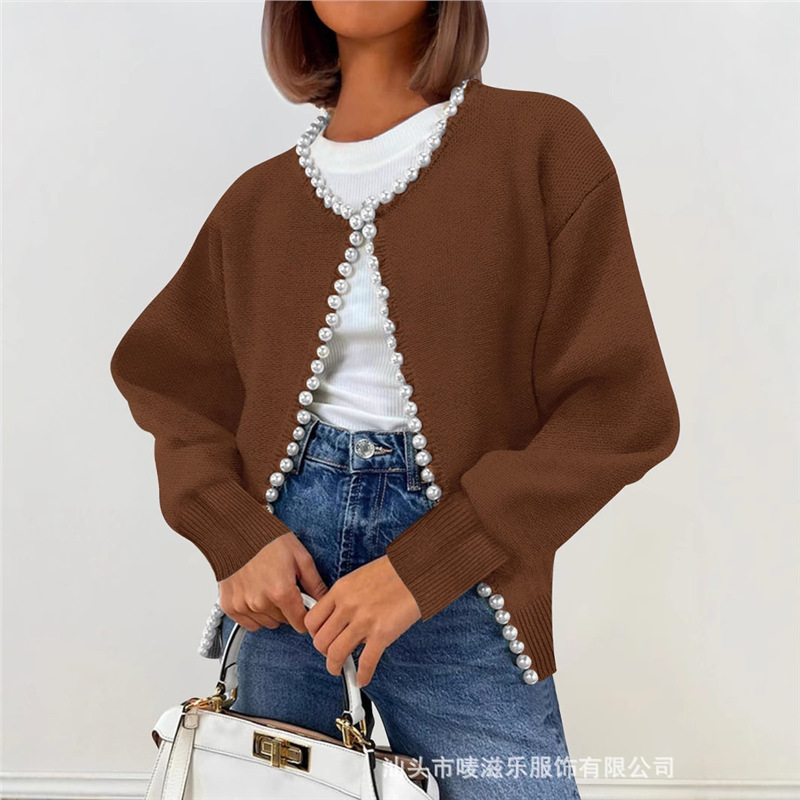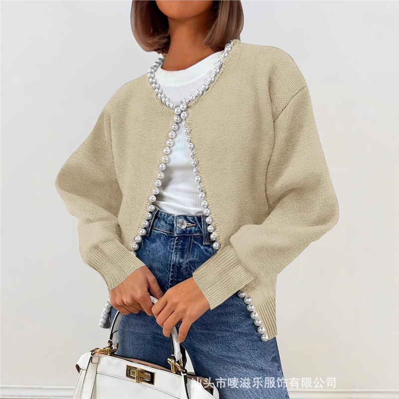 Женский кардиган с круглым вырезом и жемчужной отделкой, осенне-зимняя коллекция 2025 года, новинка для трансграничной торговли Amazon в Европе и Америке.
