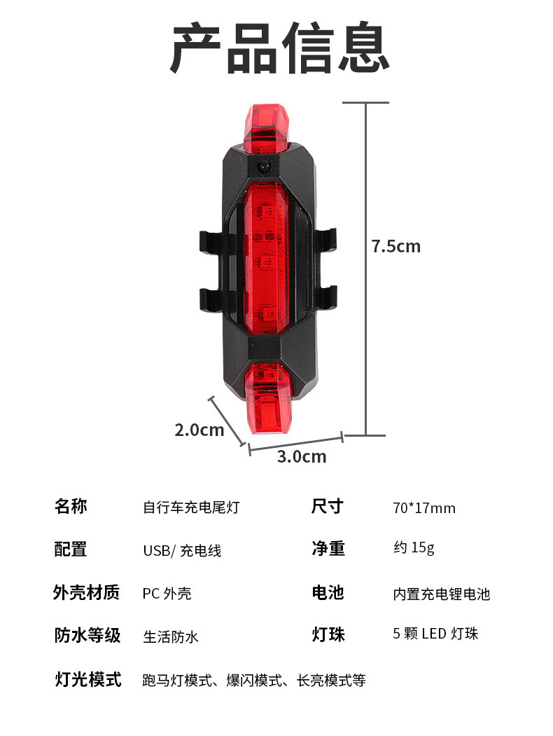 【特点】高亮度LED灯,使用可充电锂聚合物电池,自动充满电切断系统,光滑时尚设计,密封防水。修长利落的外形搭配棱柱状的道光柱设计,超广角的照射范围,提供更多的安全防护。崭新设计的弹性绑带,讲牢固的安装在各种不同形状管径的车体上。
