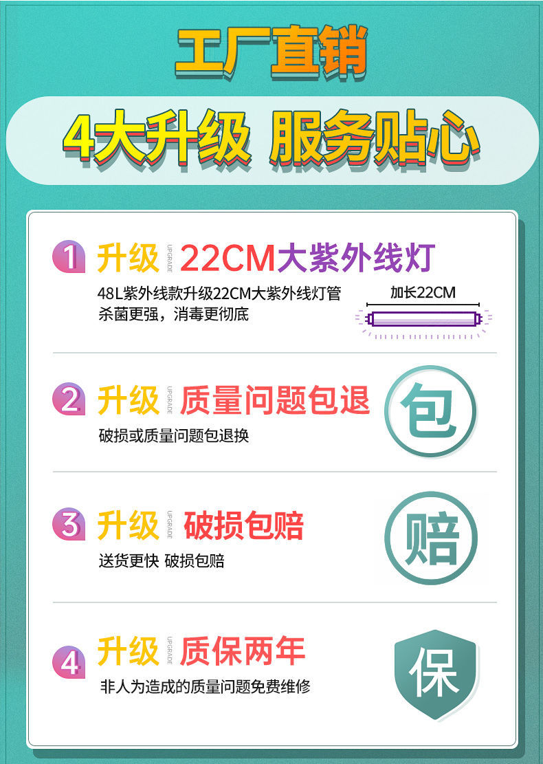 Базовая модель 28 л с циркуляционной пастеризацией горячим воздухом; Модернизированная модель пастеризации на 28 л + УФ; Базовая модель объемом 38 л с циркуляционной пастеризацией горячим воздухом; Модернизированная модель пастеризации на 38 л + УФ; Цифровой дисплей 38 л, модернизированная пастеризация + УФ + экран + отрицательные ионы; Традиционная модель 48 л с циркуляционной пастеризацией горячим воздухом; Базовая модель 48 л с циркуляционной пастеризацией горячим воздухом; Модернизированная модель пастеризации на 48 л + большой УФ-излучение; 48-литровый цифровой дисплей, пастеризованный + УФ + ЖК-цифровой экран; Цифровой дисплей 48 л, модернизированная пастеризация + УФ + экран + отрицательные ионы