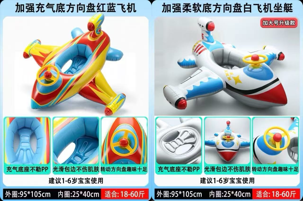 Кольцо для плавания 40 см (случайный цвет); 50 см (подходит для детей до 3 лет); 60 см (подходит для детей 2-4 лет); 70 см (подходит для детей 5-9 лет); 80 см (подходит для подростков); 90 см (подходит для взрослых); Рукава для воды (пара) (случайный цвет); Надувной большой самолет (случайный цвет); Надувное сиденье с рулевым колесом (случайный рисунок); Маленький насос; Большой насос