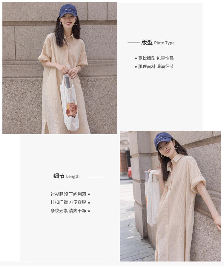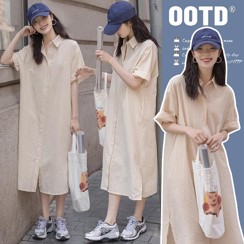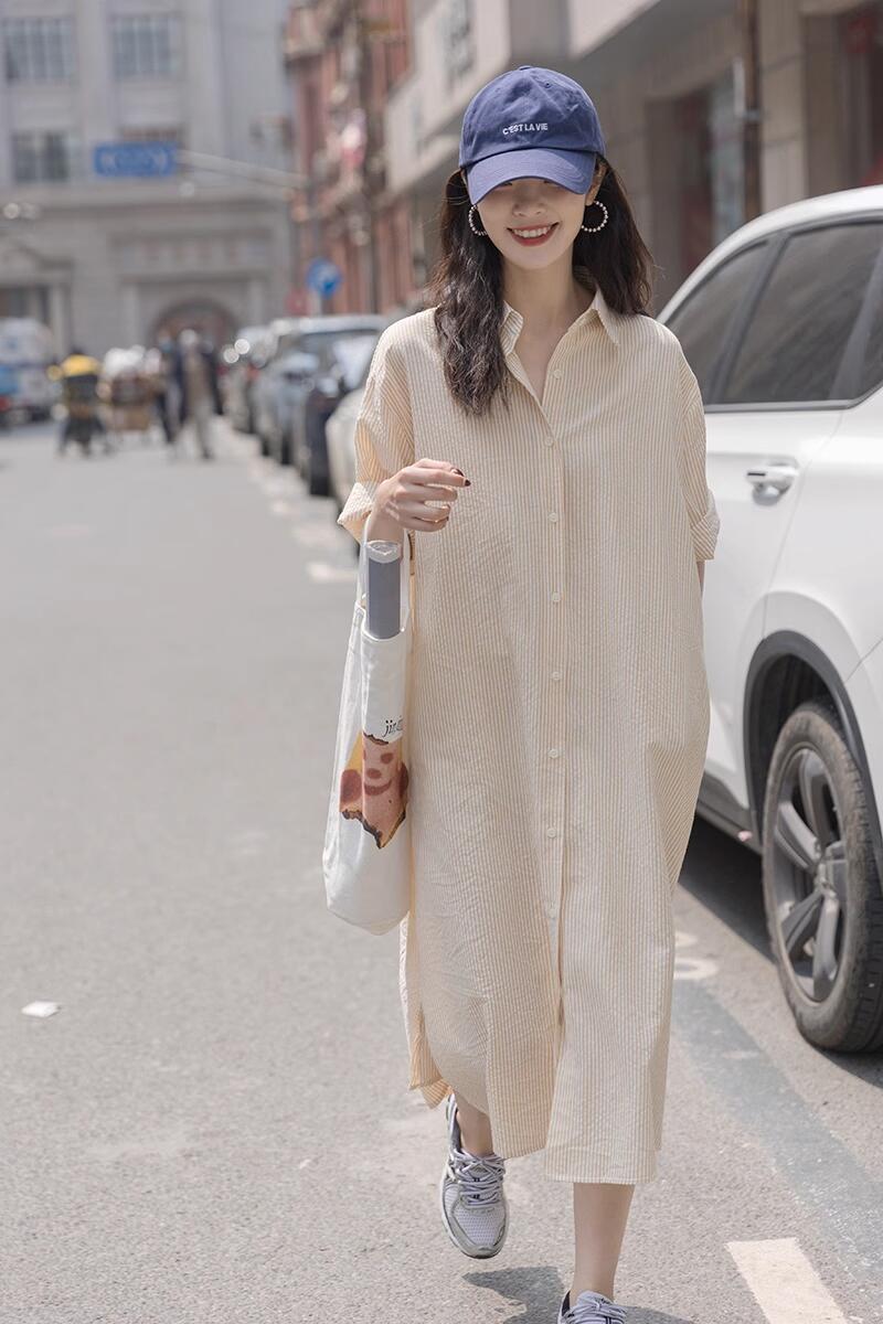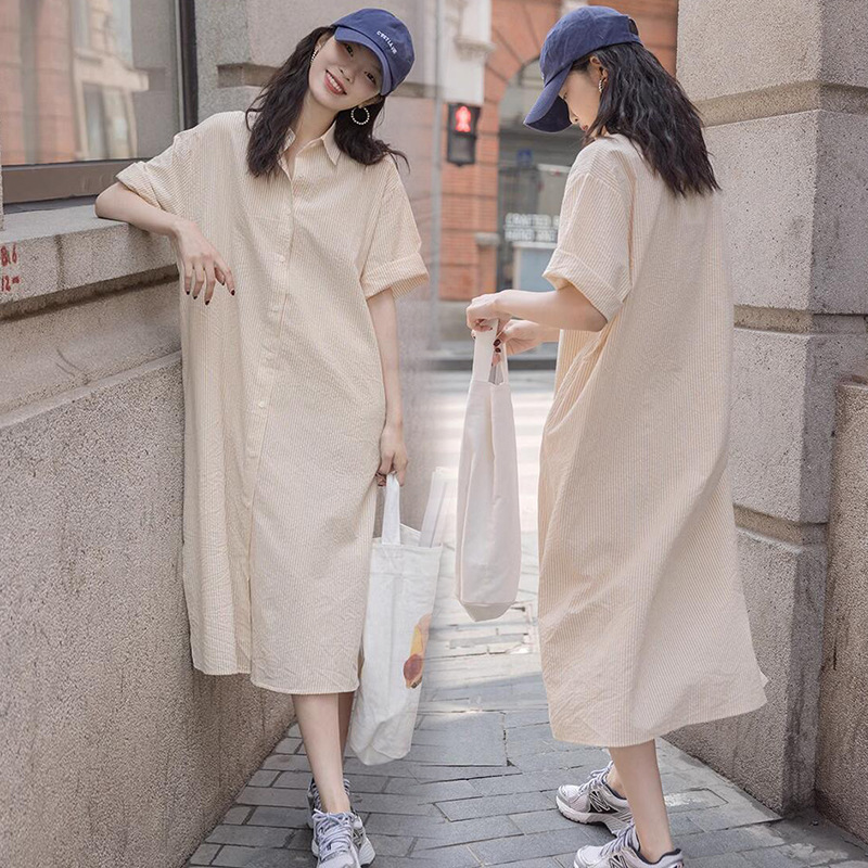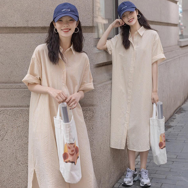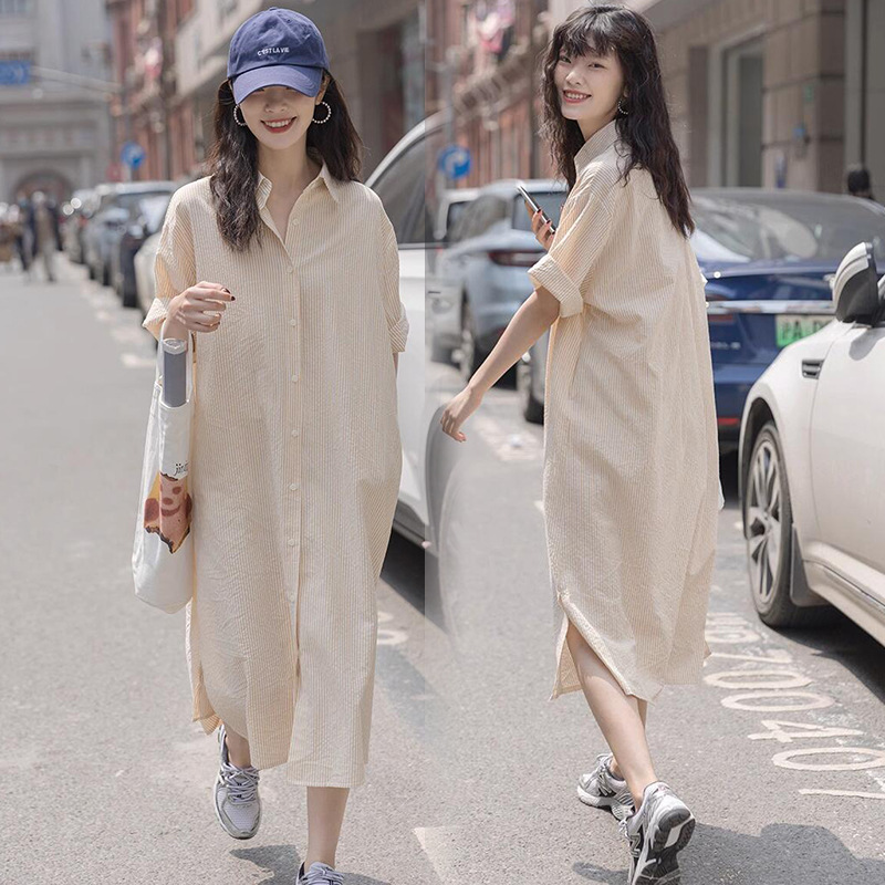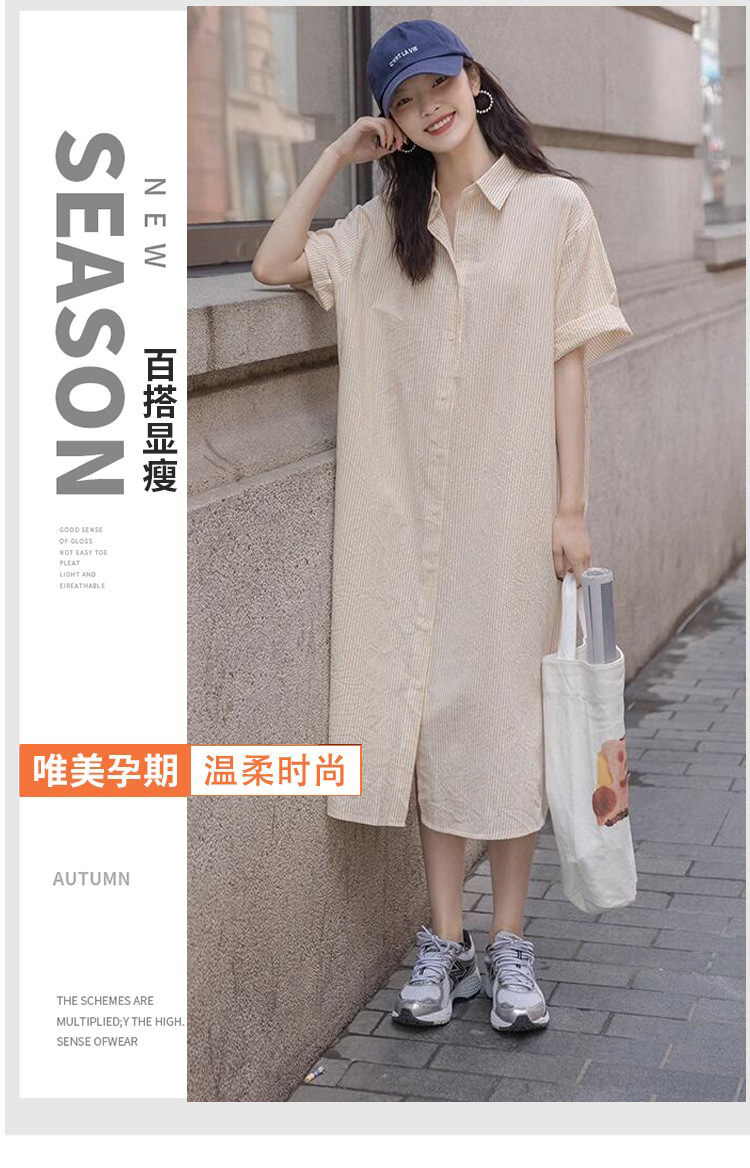 Летнее платье-рубашка в полоску больших размеров, свободного кроя, для беременных 2025 года, утягивающее, в стиле интернет-знаменитостей.