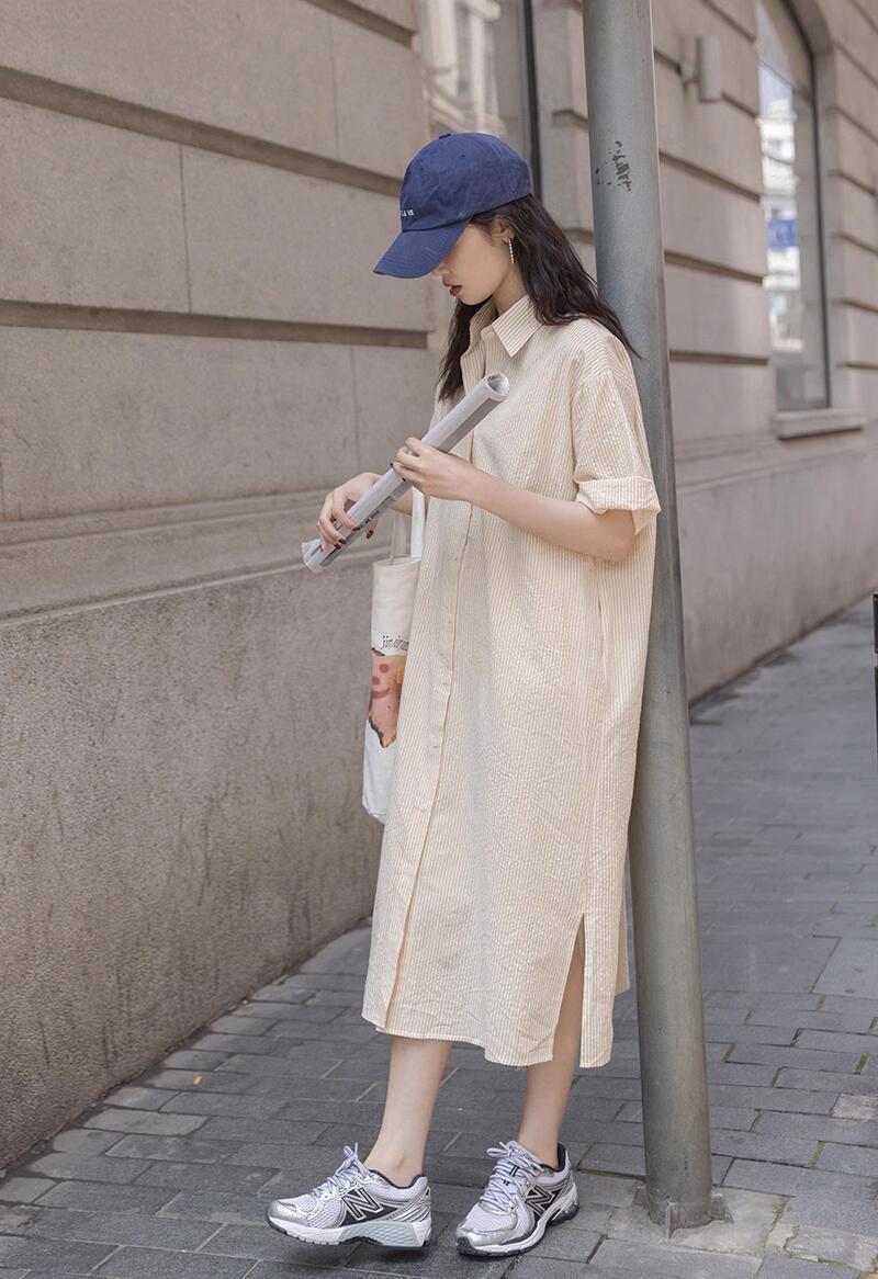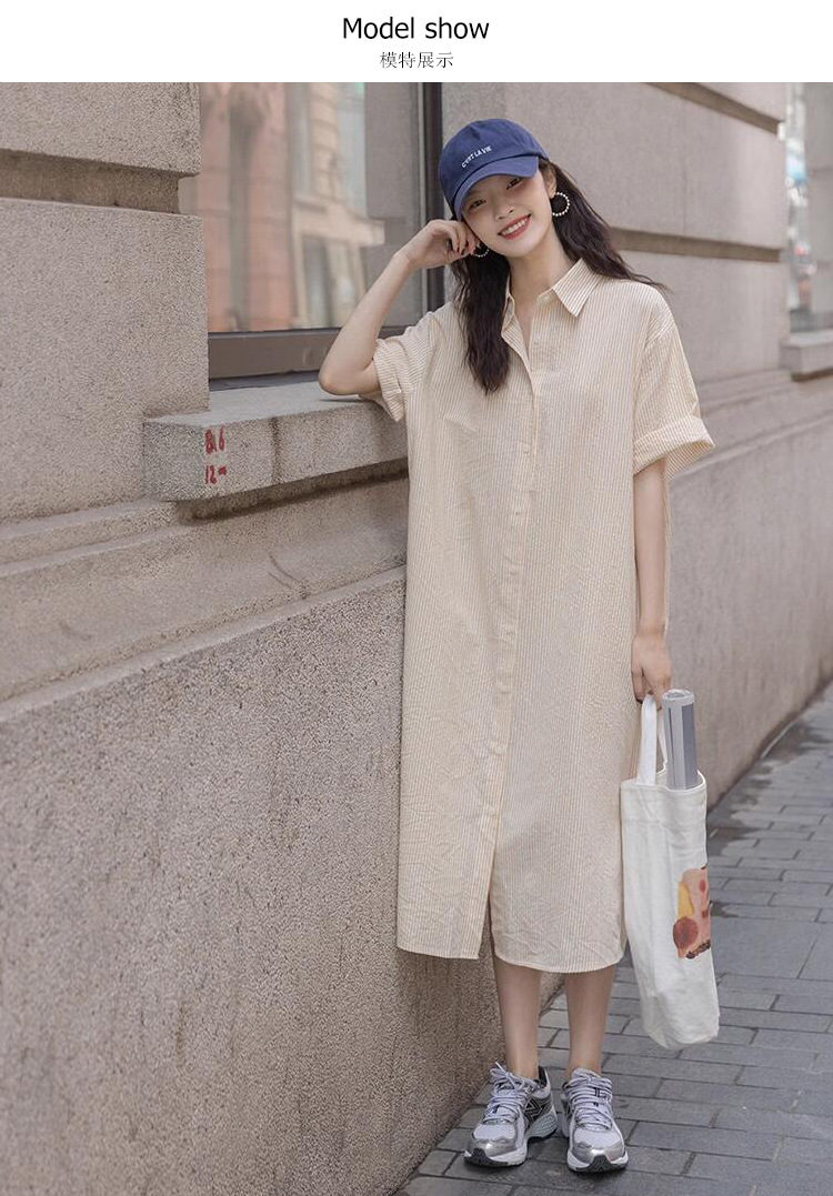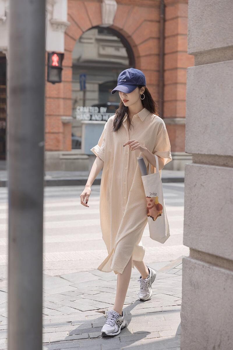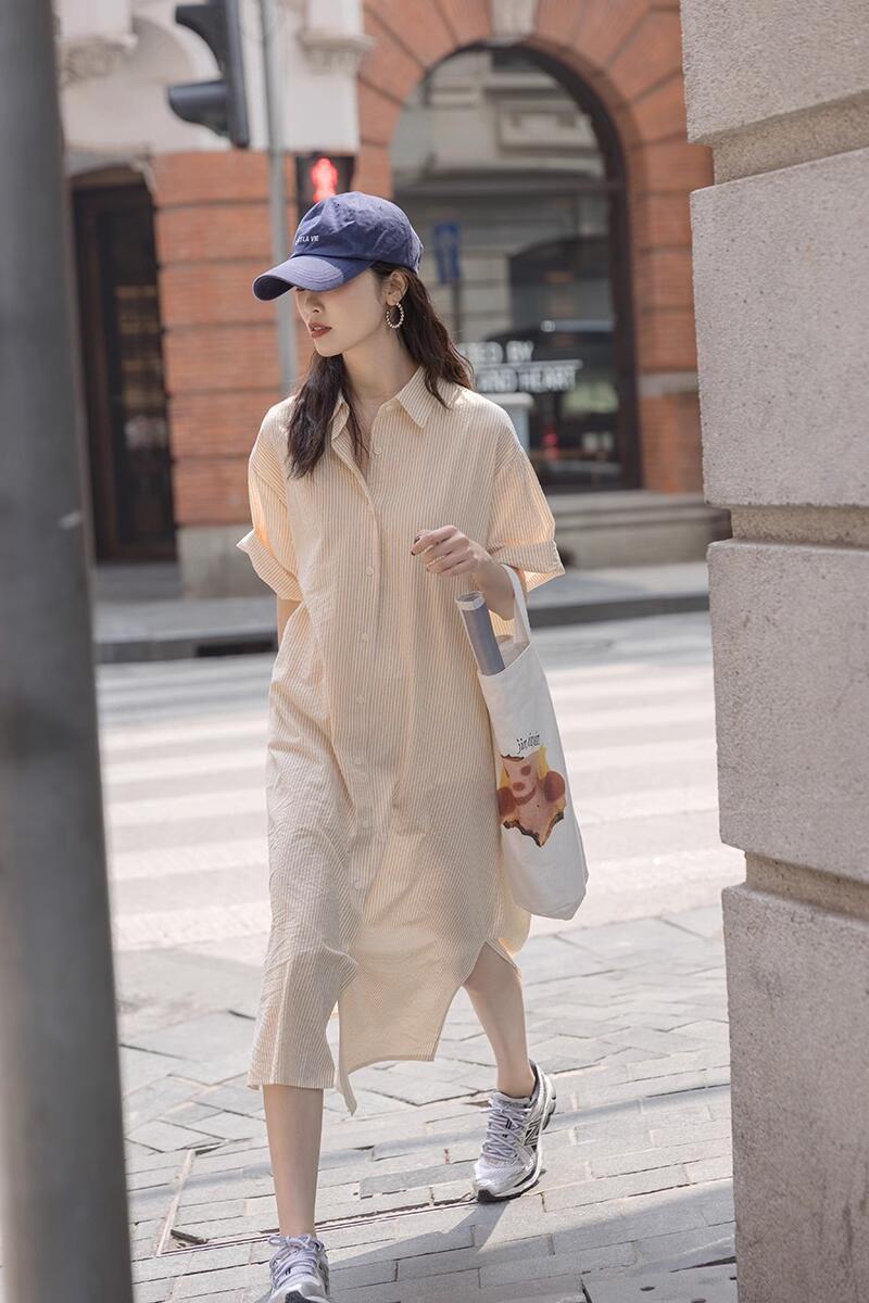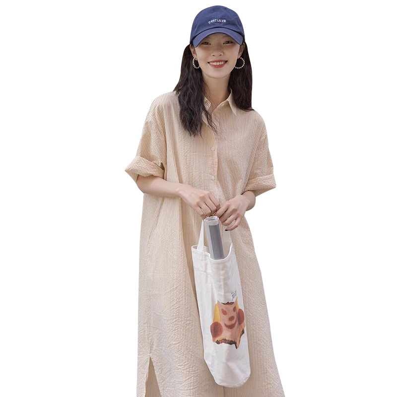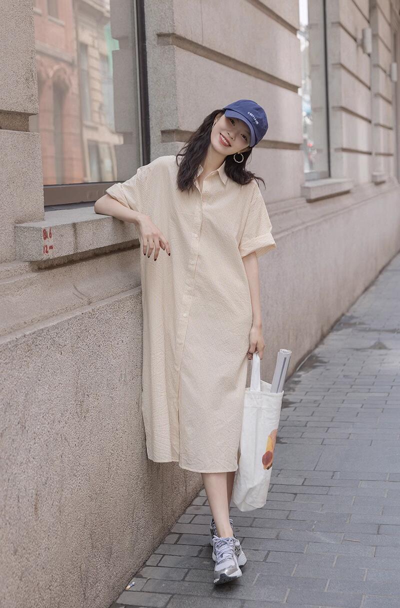 Летнее платье-рубашка в полоску больших размеров, свободного кроя, для беременных 2025 года, утягивающее, в стиле интернет-знаменитостей.