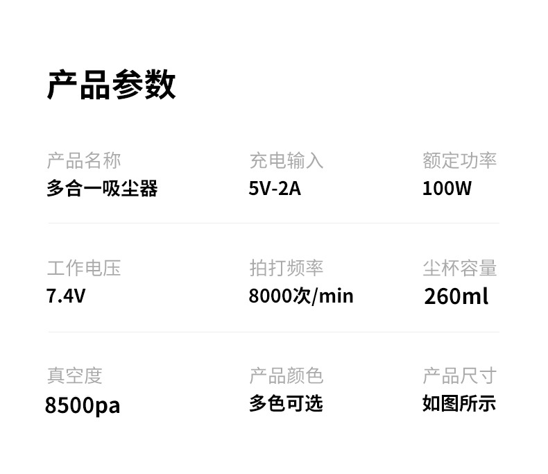 11、产品配件:主机*1、地板刷连接管*2、地板刷*1、二合一扁吸*1、除螨头*1