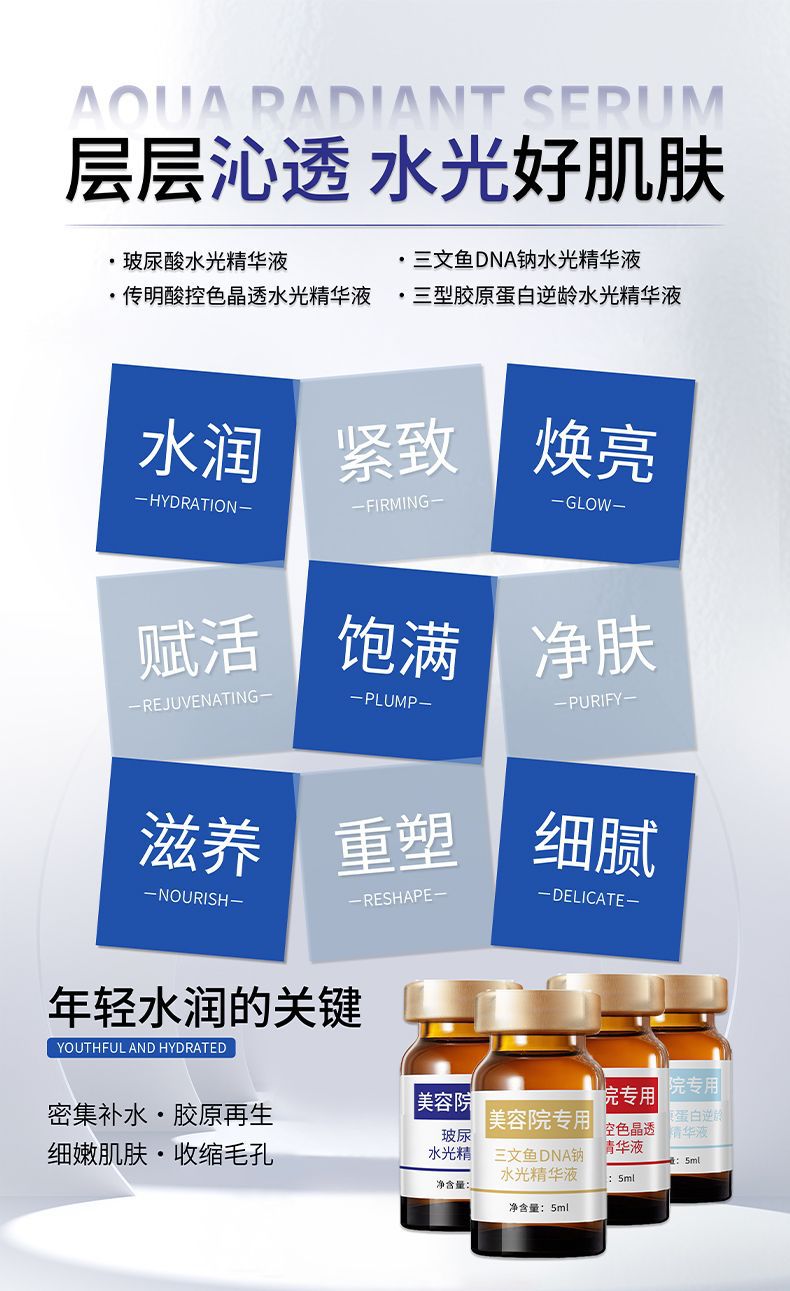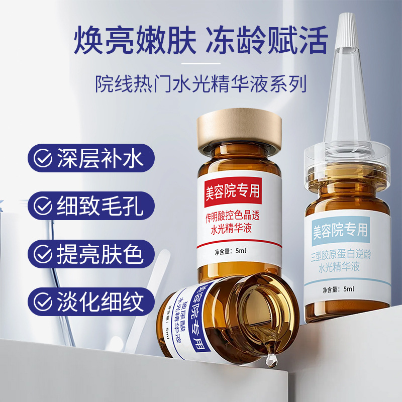 Осетровая водно-светящаяся эссенция 5мл*10 флаконов (восстанавливает барьер и осветляет линии); Увлажняющая эссенция коллагена III типа, 5 мл*10 флаконов (против морщин и лифтинг); Увлажняющая эссенция с гиалуроновой кислотой 5 мл*10 флаконов (увлажняет и сужает поры); Увлажняющая эссенция с транексамовой кислотой, 5 мл*10 флаконов (осветление и легкие следы)