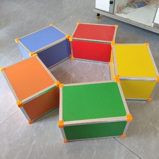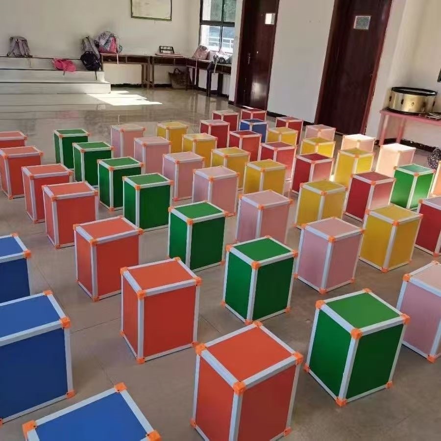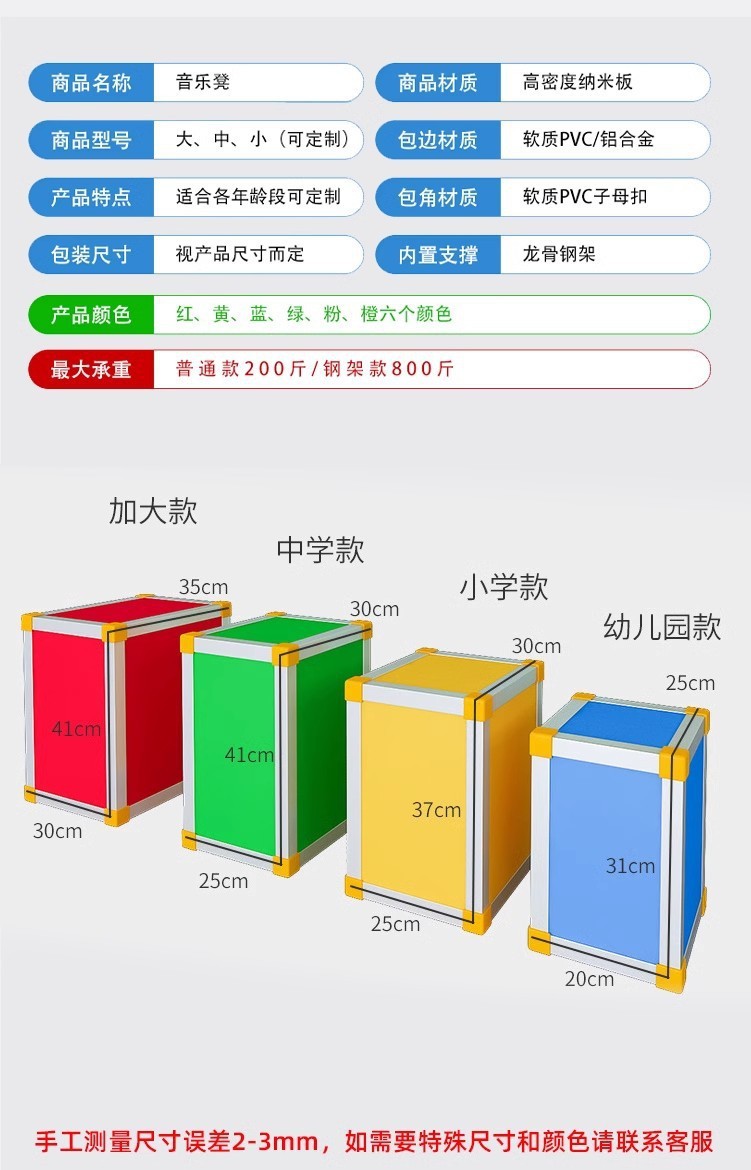 我厂生产的音乐六面体凳包括:幼儿(25*20*31cm)小(30*24.5*37cm),中学(30*25*41cm)大号(30*35*40cm) 音乐凳全部采用高密度板,厚度为1.2cm,表面为三聚氰胺贴膜,分红、绿、黄、蓝、粉、桔、木色,凳内可加龙骨支撑(龙骨有木龙骨跟钢架龙骨),保证坚固耐用。音乐凳采用纸箱包装,每箱4个,标注价格不包括税运(由于货物体积大,重量较重,全国各地远近不同,不能统一设定运费,具体运费请与客服联系,谢谢支持!