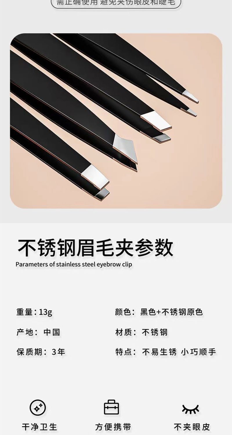 Плоская заколка для бровей; Наклонный зажим для бровей; Нож для бровей; Заостренный зажим для бровей; Плоская заколка для бровей (в коробке); Наклонный зажим для бровей (в коробке); Зажим для бровей с кончиком ножа (в коробке); Зажим для бровей с острым кончиком (в коробке); Плоский рот + наклонный рот (в коробке); Наконечник ножа + заостренный наконечник (в коробке); Плоский рот + ножевой рот + заостренный рот (в коробке); Наклонный рот + плоский рот + заостренный рот + ножевой рот (в коробке); Плоский рот + косой рот + нож + заостренный рот (упакован в пакет с застежкой-молнией); коробка для бровей