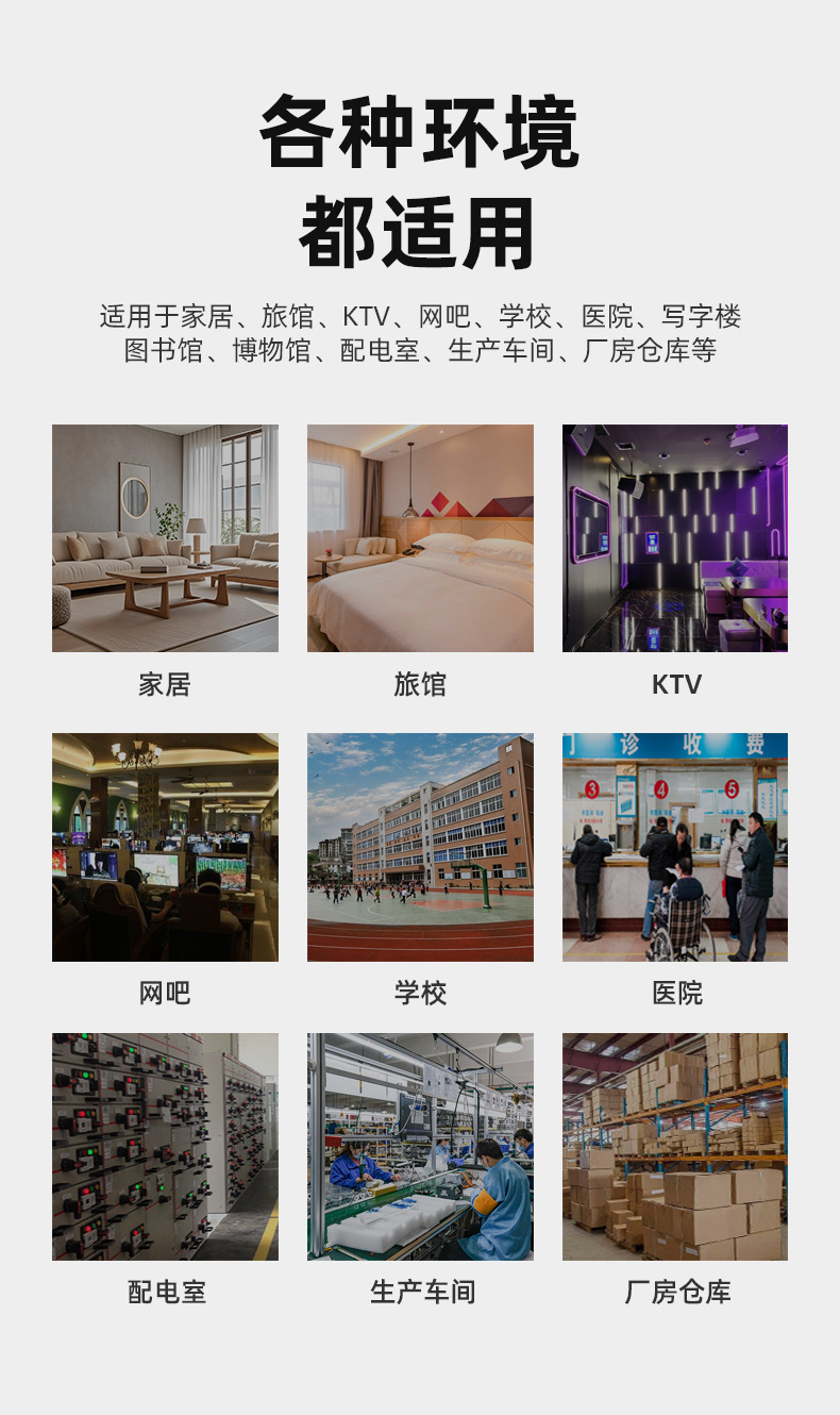 Кухни, гостиницы, супермаркеты, распределительные шкафы, автомобили, корабли и другие пожароопасные помещения. Стеллажи для хранения, шкафчики, зарядные станции/ящики/склады и другие закрытые помещения.