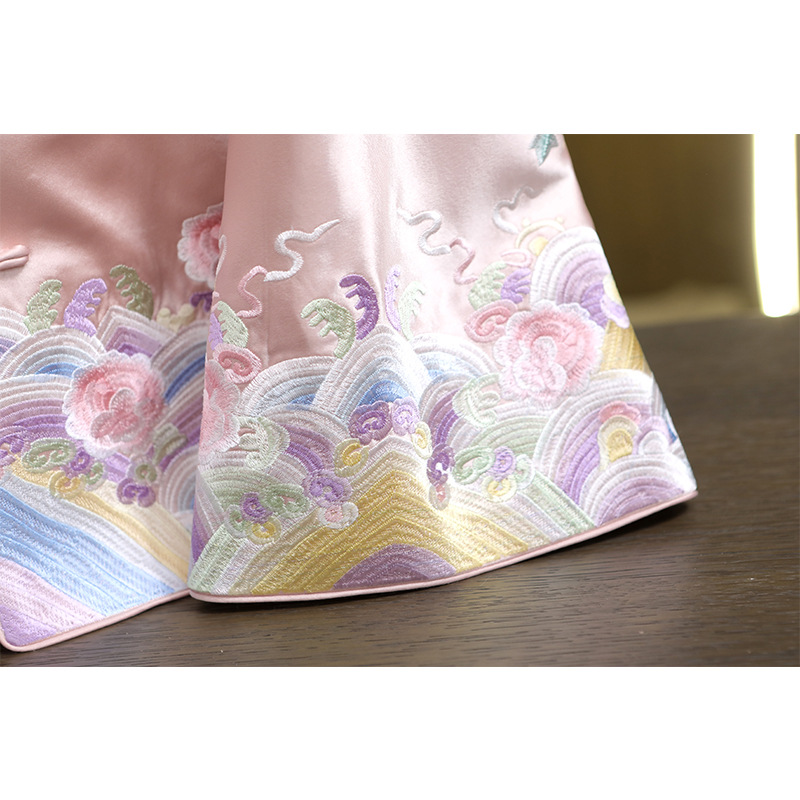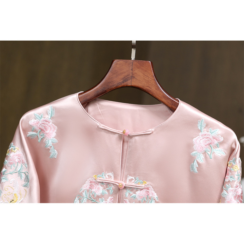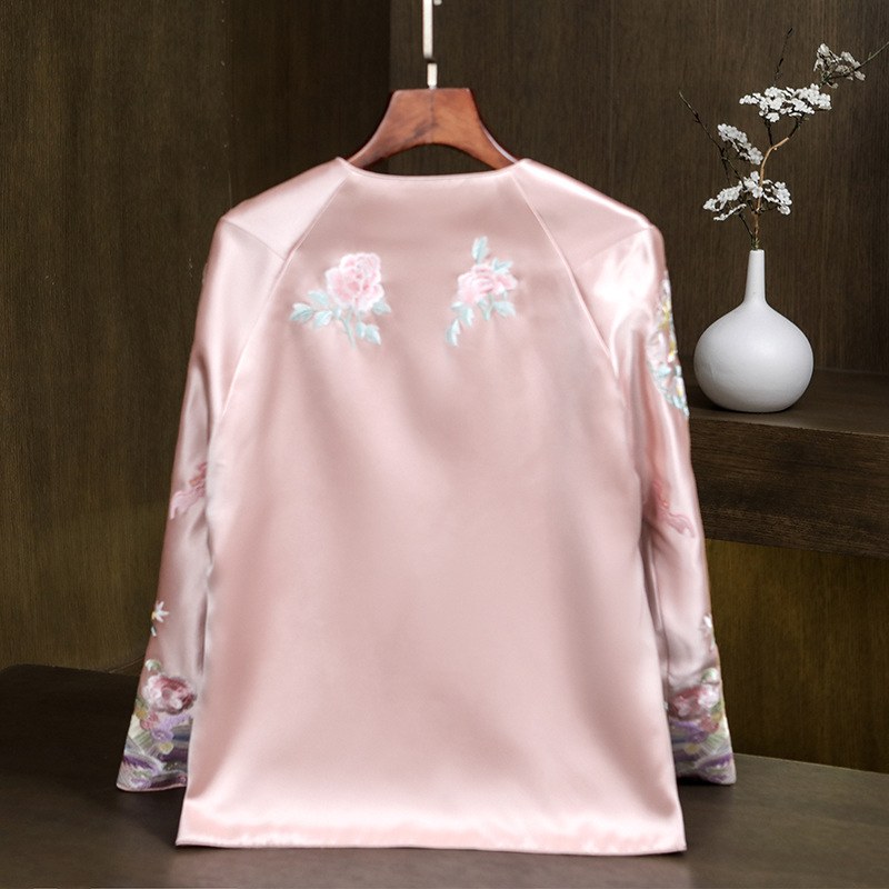 Новый китайский ацетатный атласный топ в стиле Тан, весна 2025, высококлассный элегантный национальный стиль, ретро, с тяжелой вышивкой, круглый вырез