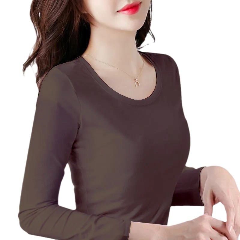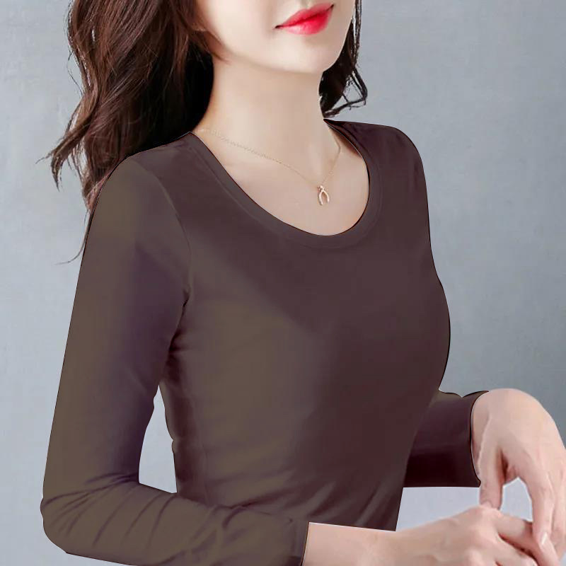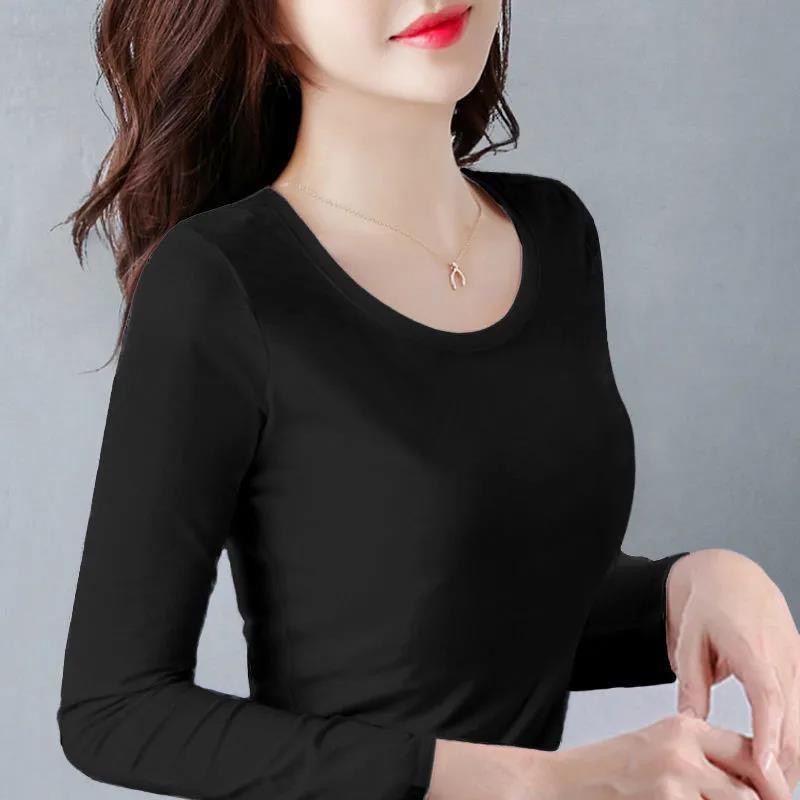 Однотонная осенняя базовая рубашка для женщин, футболка с длинными рукавами, весенне-осенний облегающий топ, круглый вырез, тонкая внутренняя одежда, корейский стиль, эластичная.