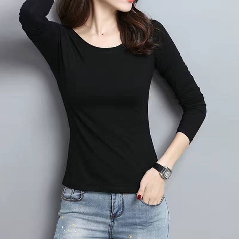 Женская базовая рубашка на весну и осень, тонкая футболка с длинными рукавами в корейском стиле, универсальный однотонный топ большого размера с круглым вырезом.