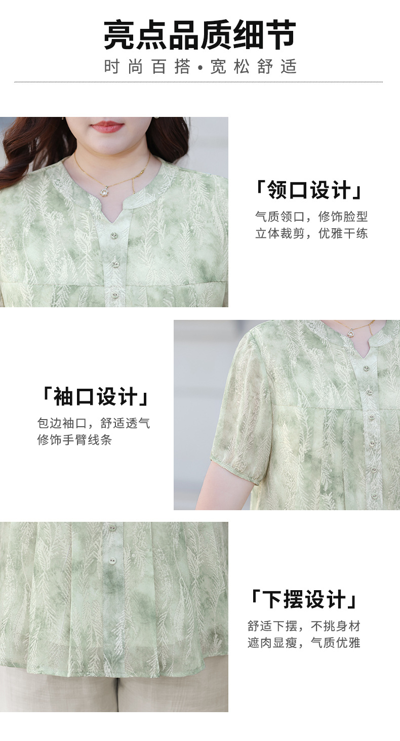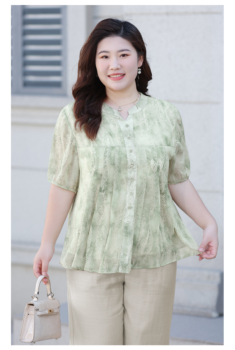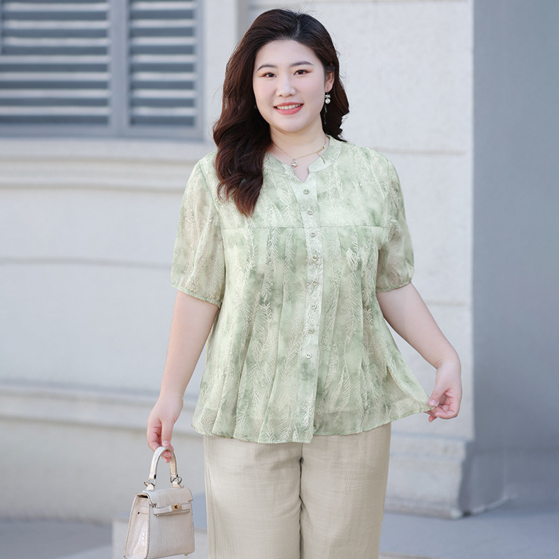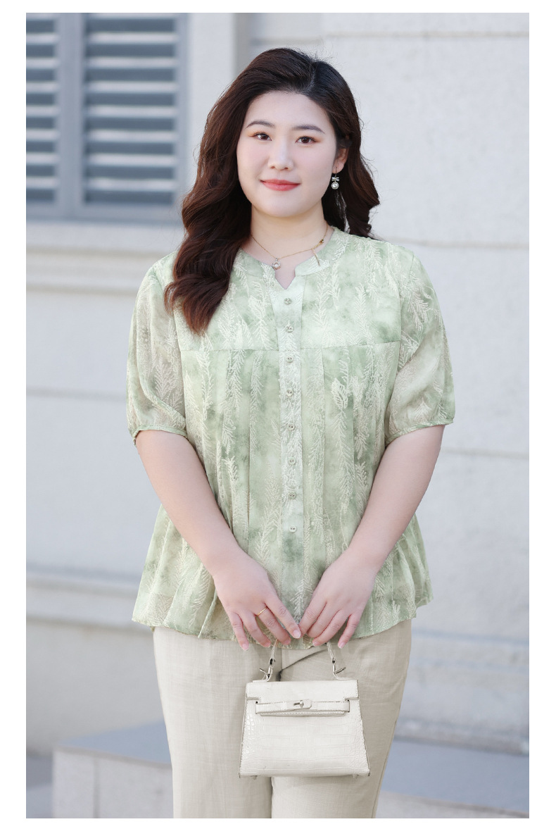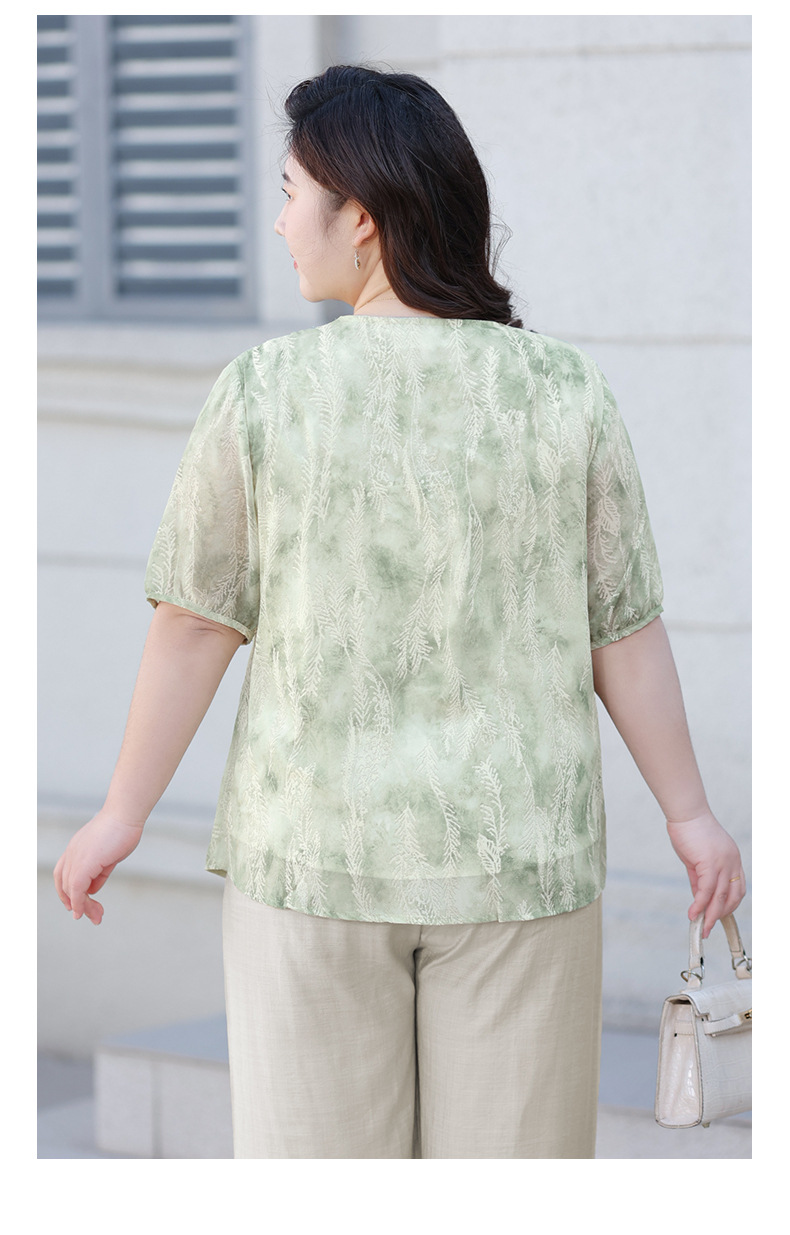 Летняя шифоновая рубашка больших размеров для женщин среднего возраста, с цветочным принтом, V-образным вырезом, тонкая, с коротким рукавом.