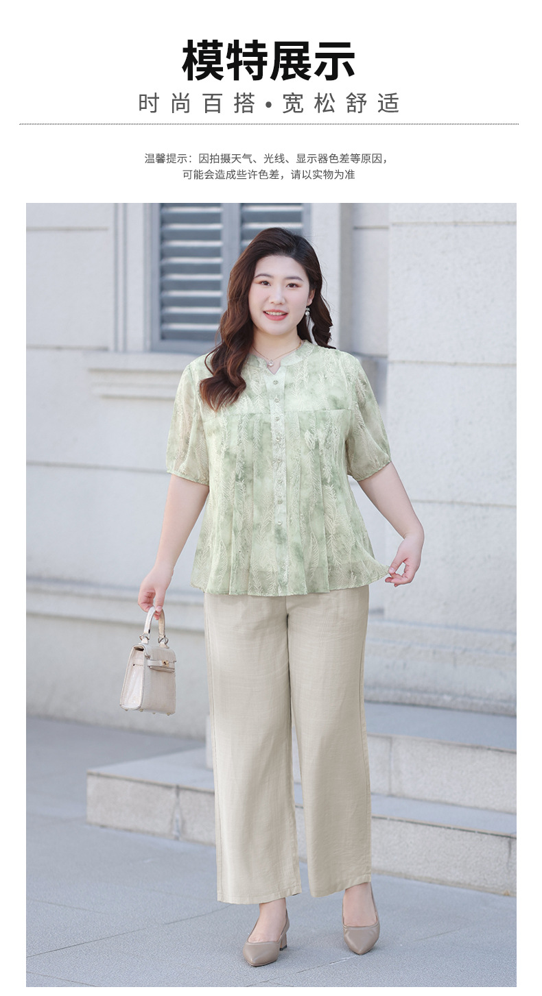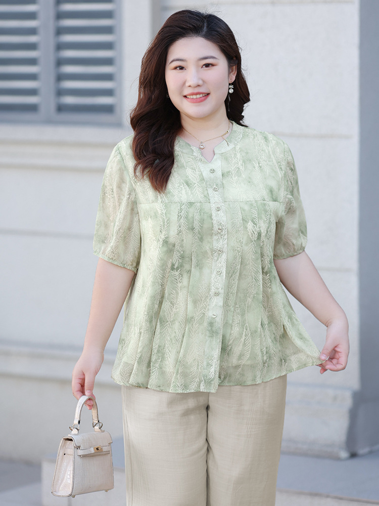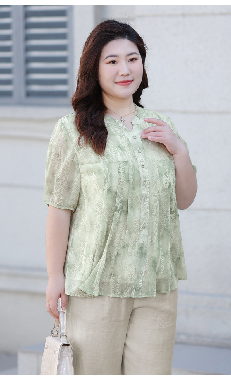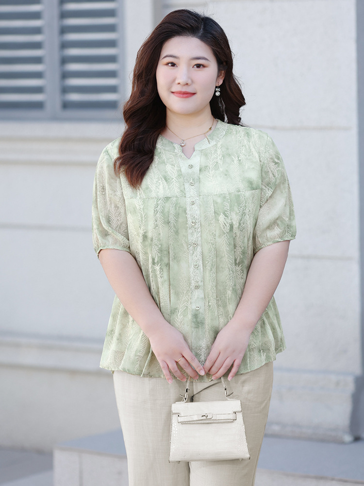 Летняя шифоновая рубашка больших размеров для женщин среднего возраста, с цветочным принтом, V-образным вырезом, тонкая, с коротким рукавом.